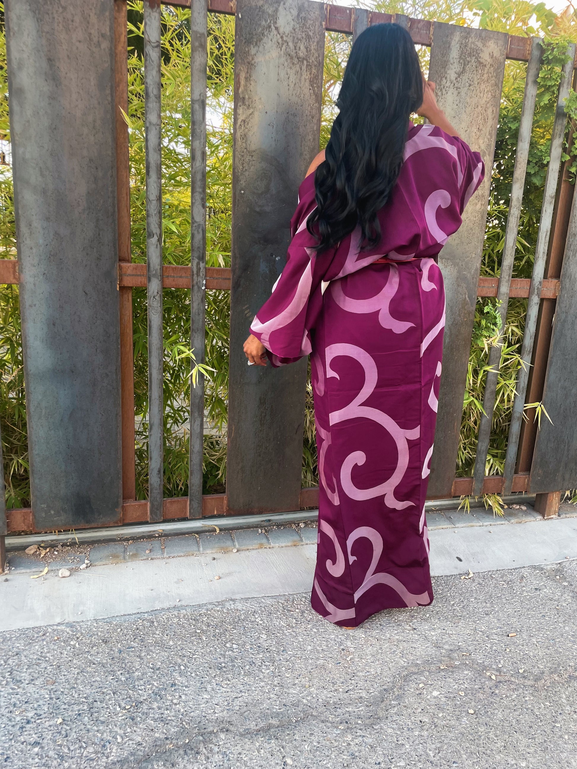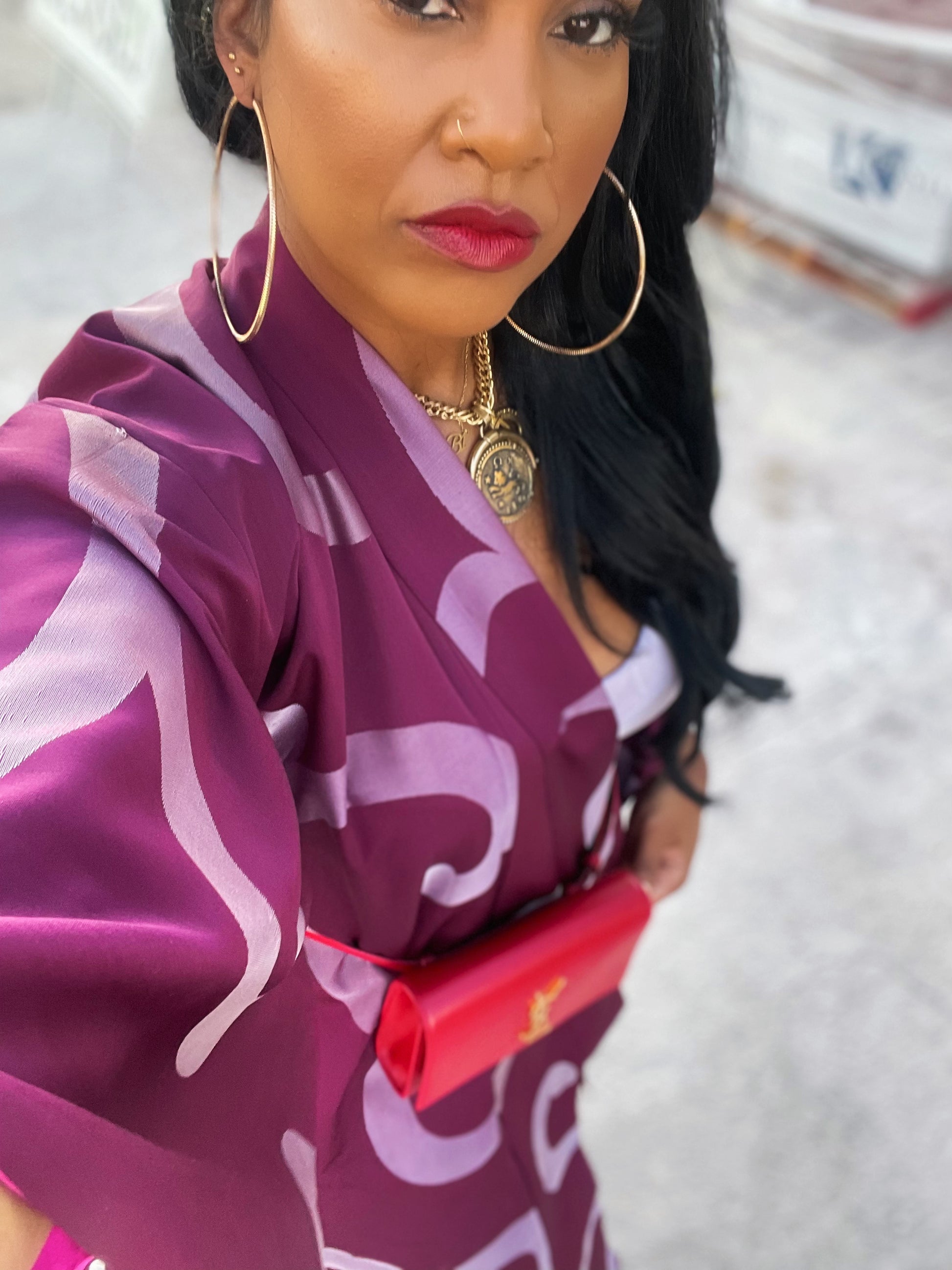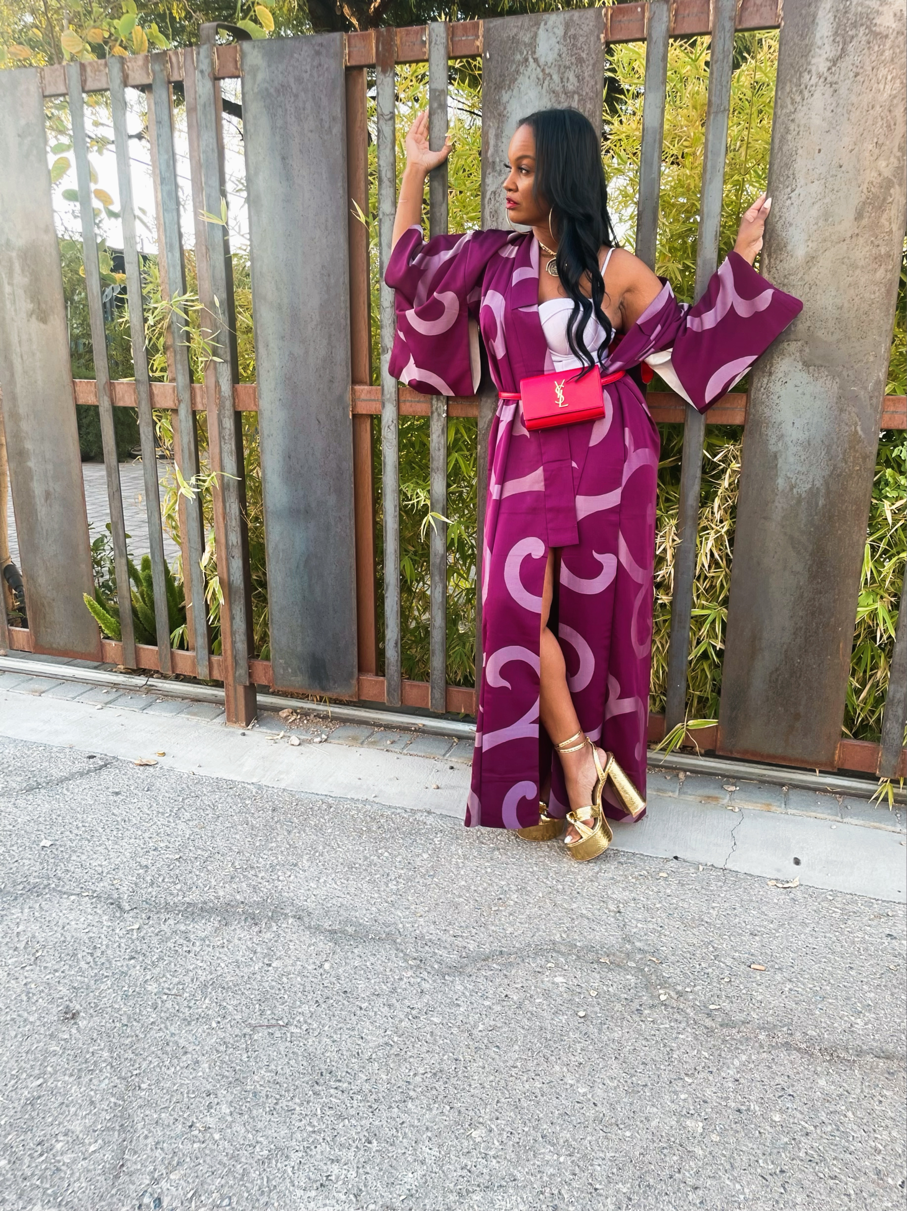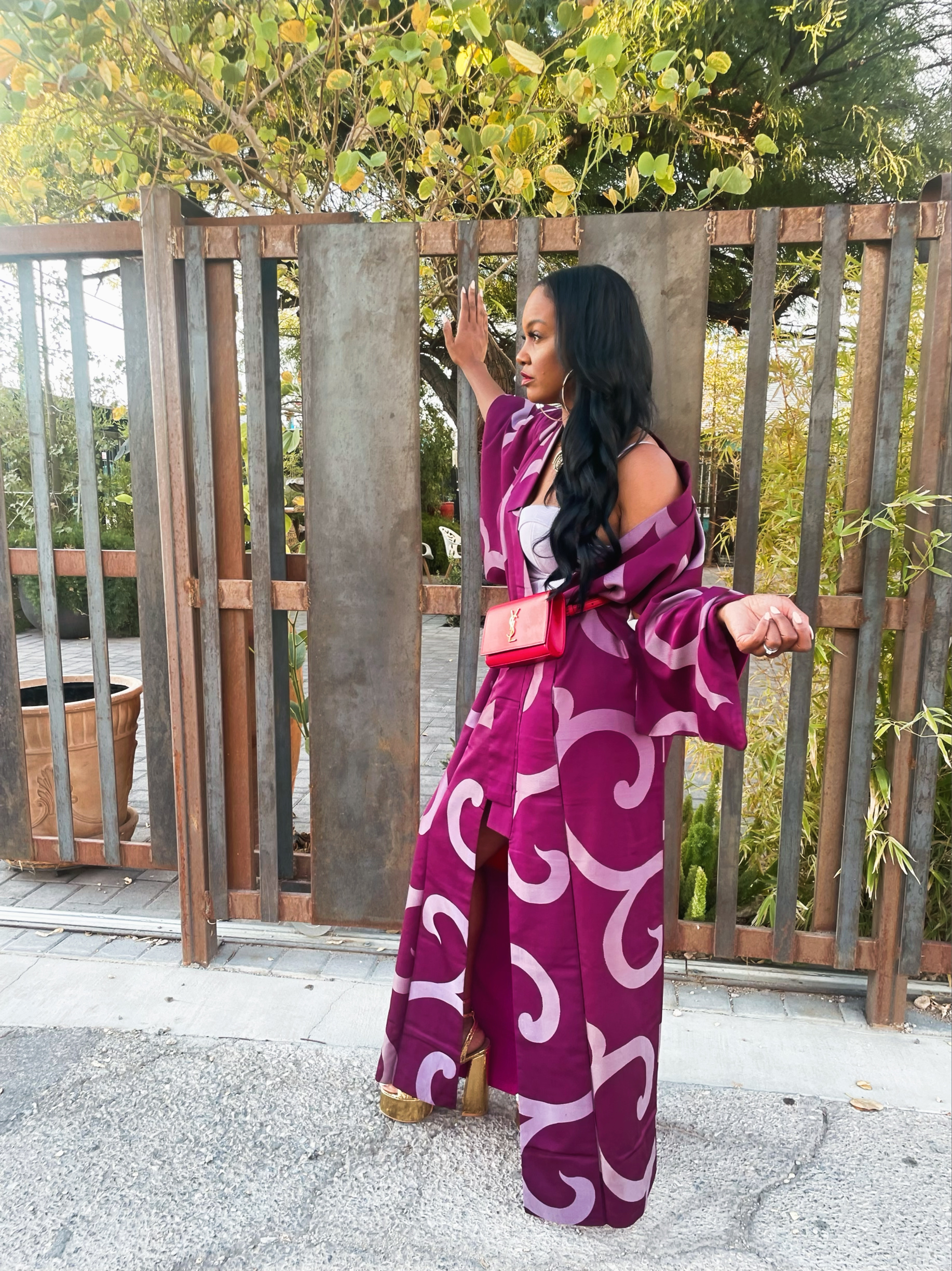 Insanely beautiful and a unique color of purple and fushia with a red lining . This beauty is perfect for going out and being the center of attention. very feminine. This beauty is in great condition.