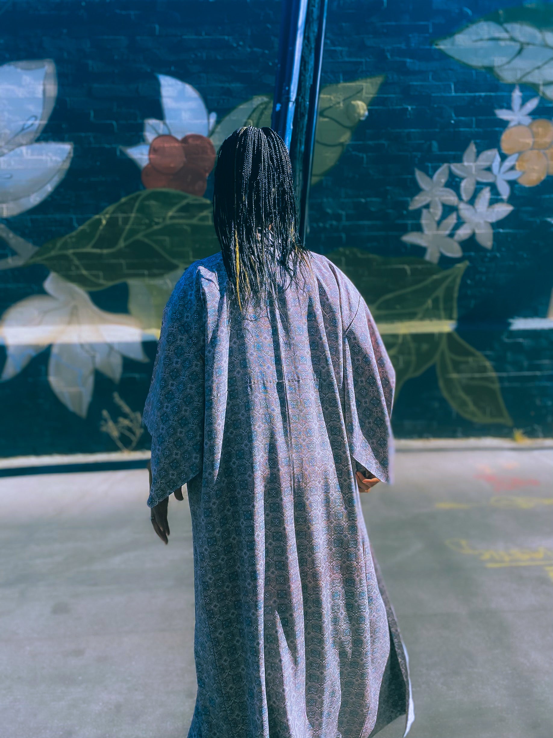 Wearing a Kimono to the office without looking like you're wearing a robe. This piece is neutral enough to dress up for work. Perfect shade of blue to be paired with a bright bold pant.