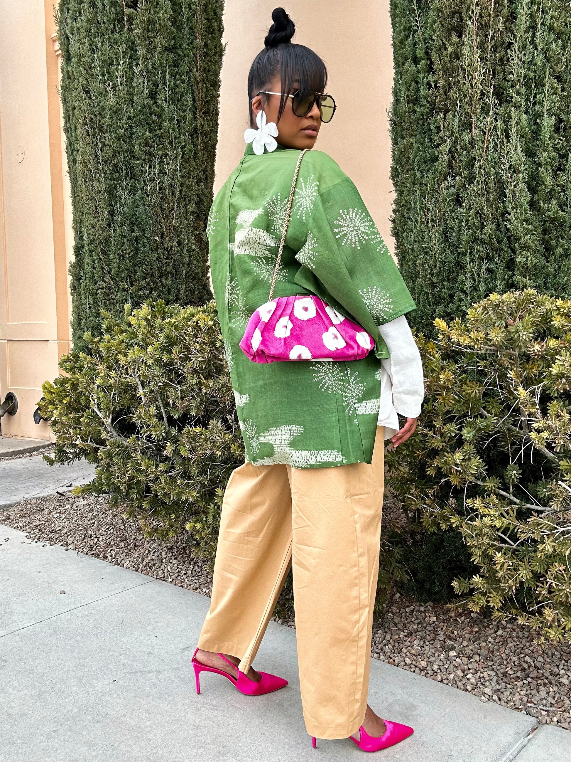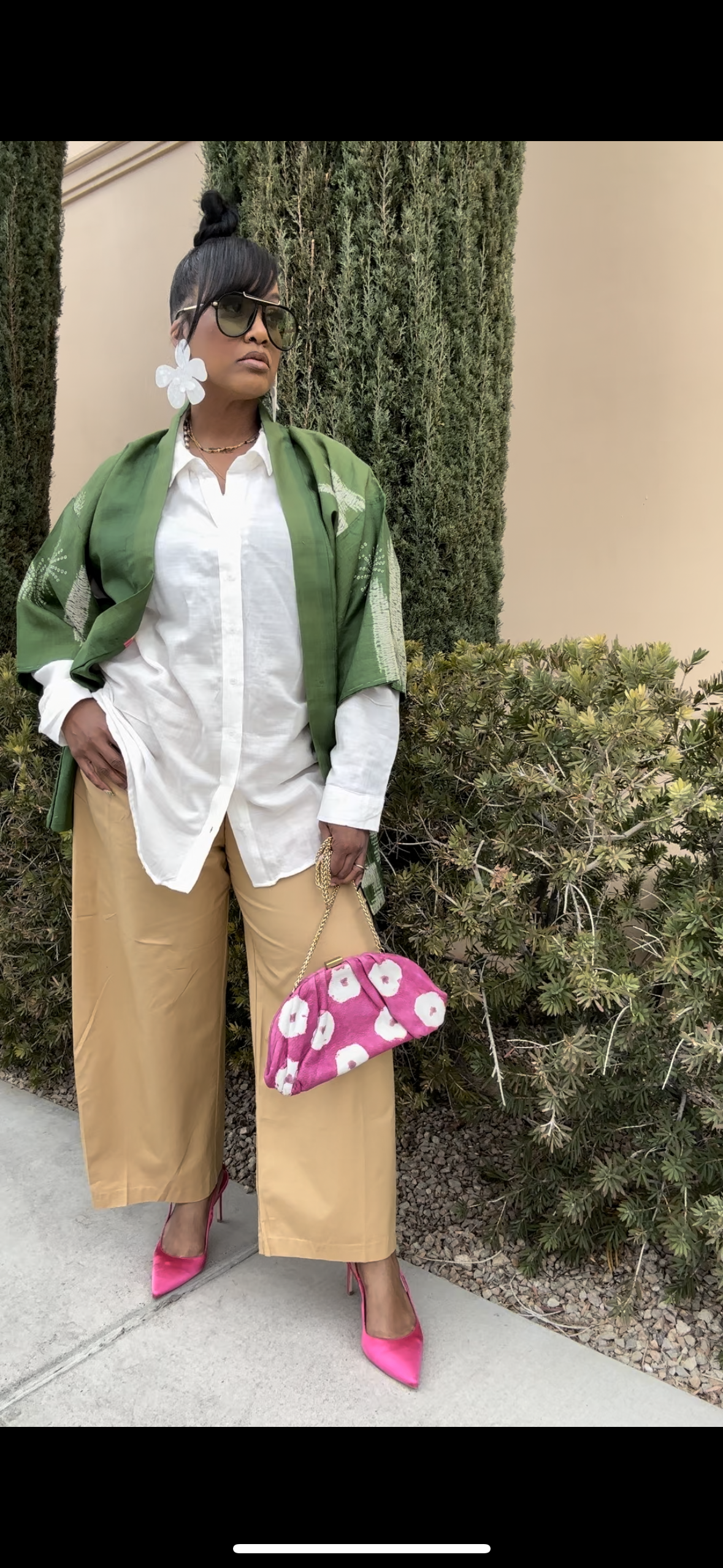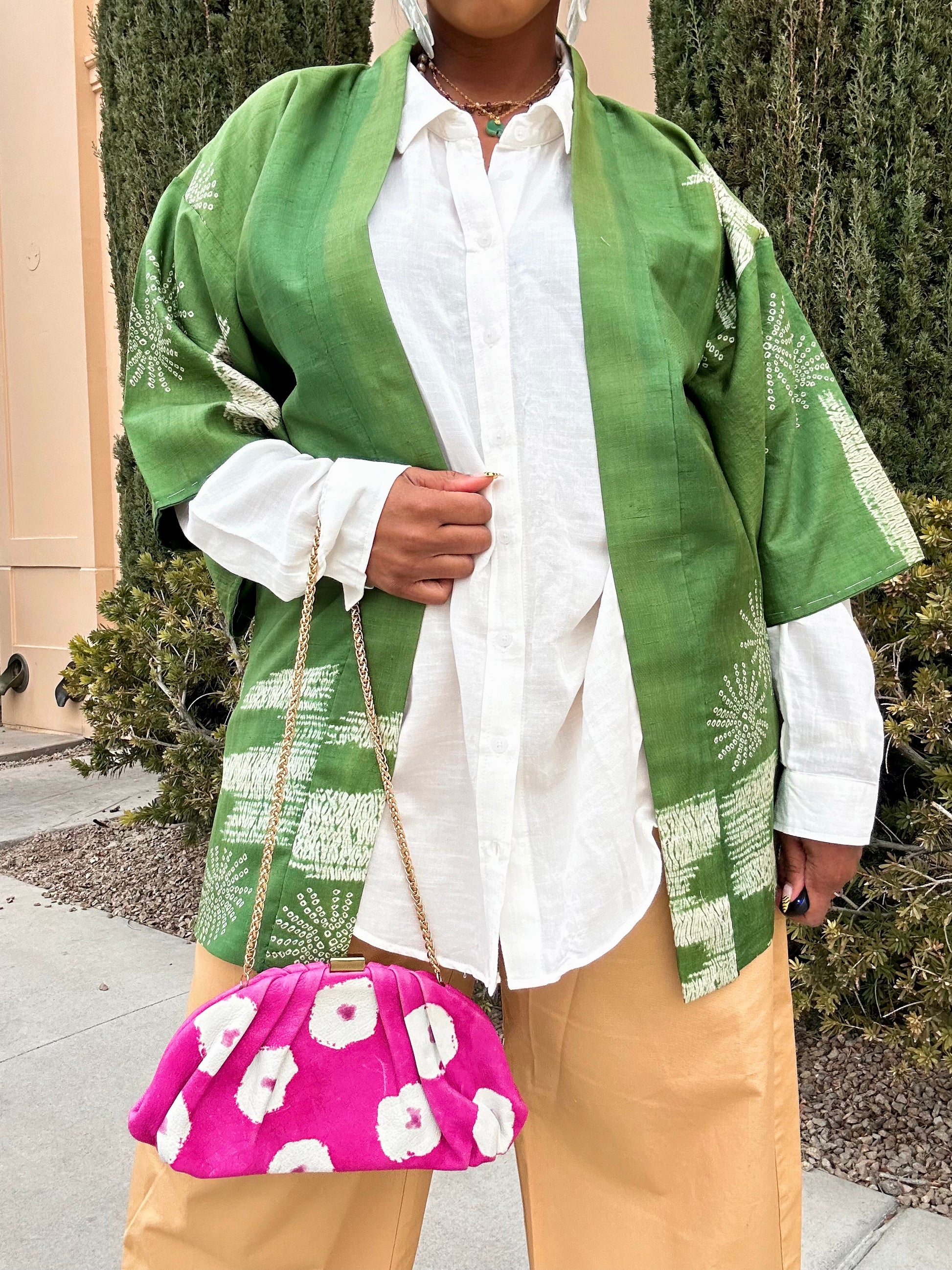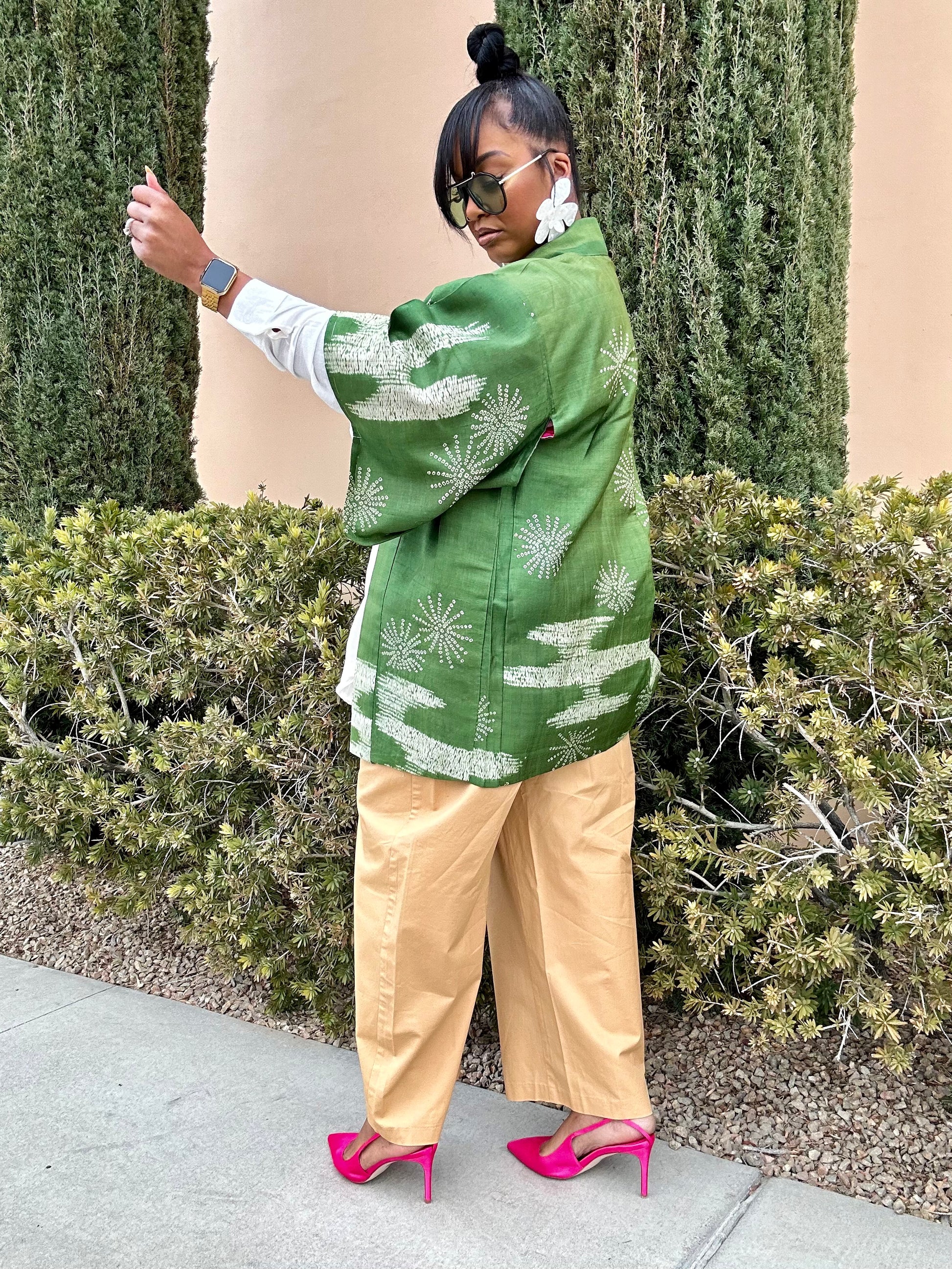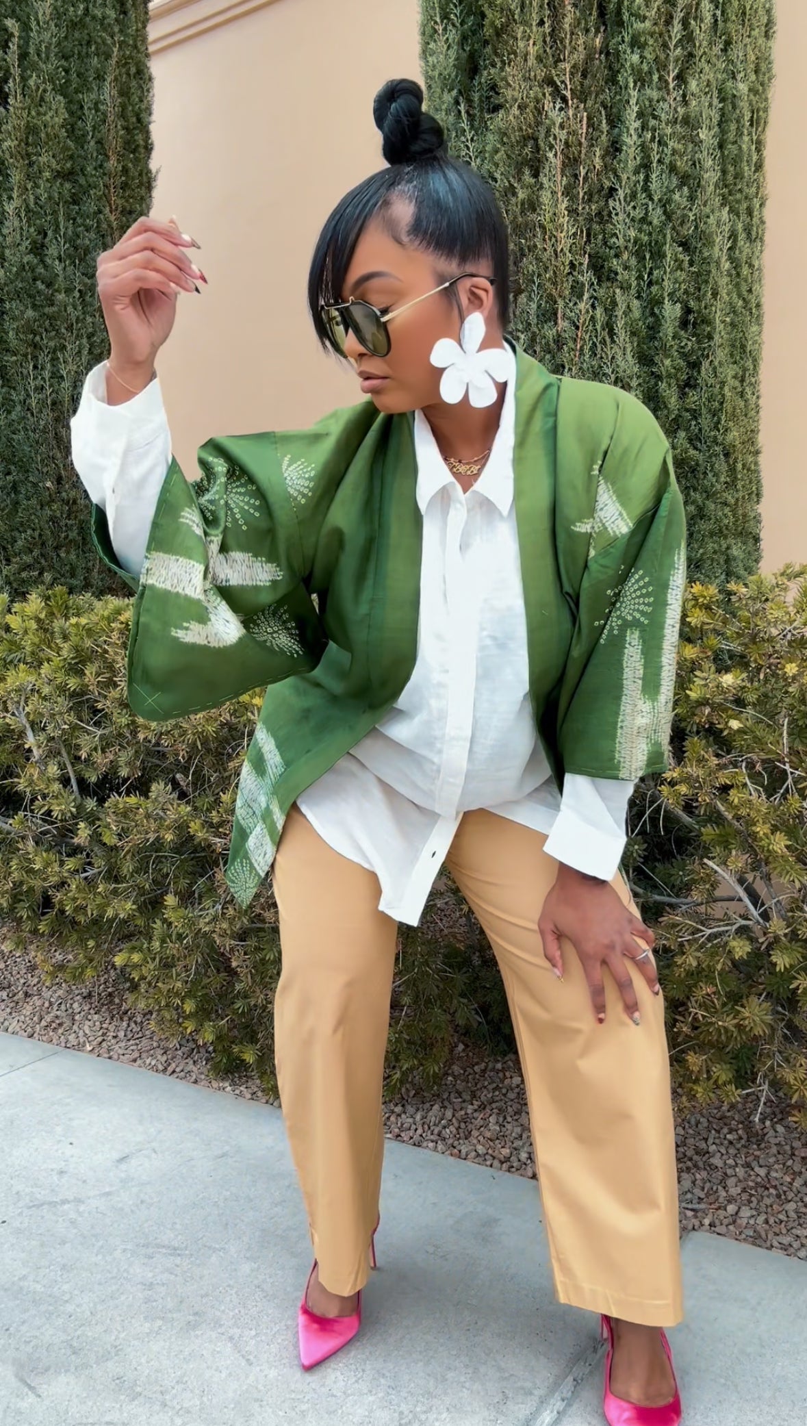 The Green is so rich in color it reminds me of a green apple 🍏 . This is for the woman who wants a Kimono but not the long silhouette. I love wearing this style lounging around the house. Pair this style with a tank, shorts, slacks, denim, or skirt.