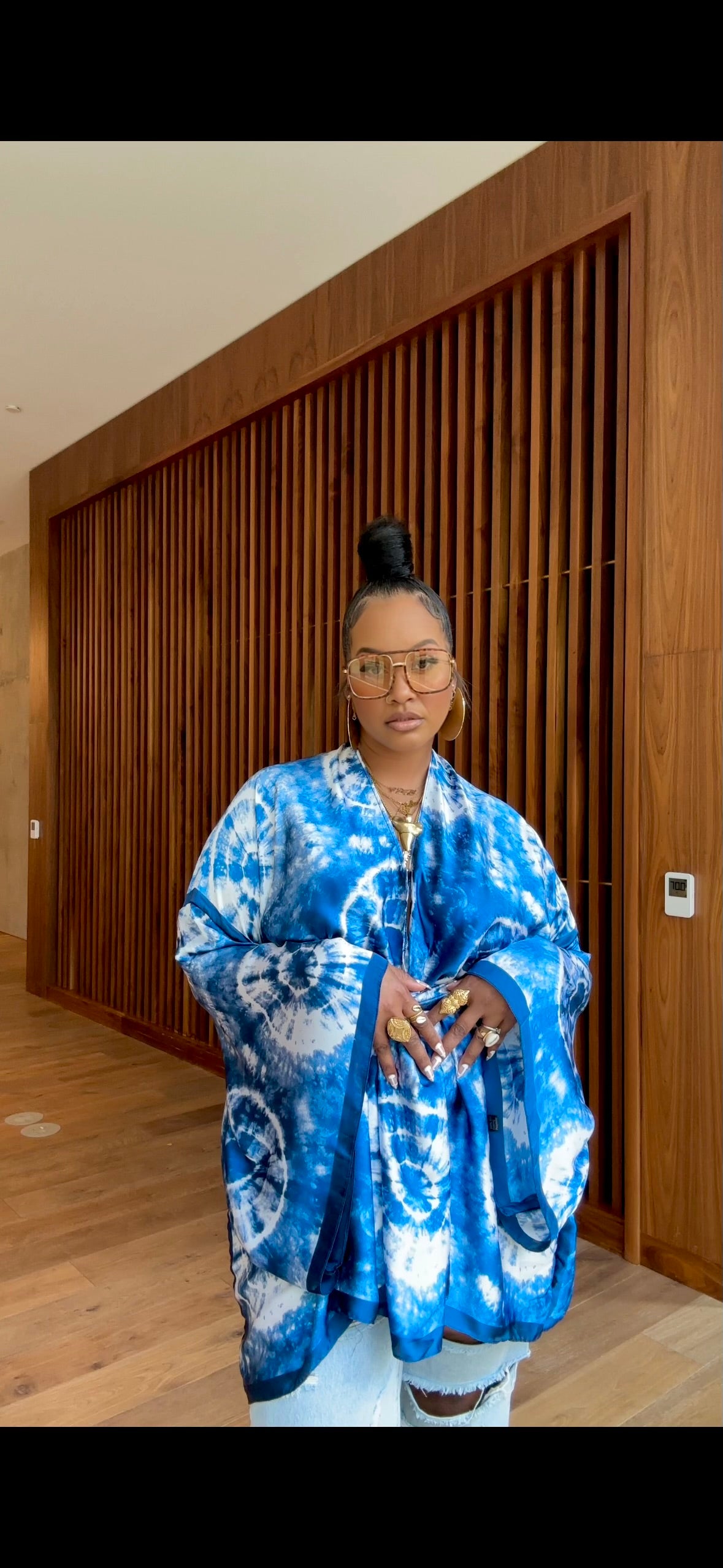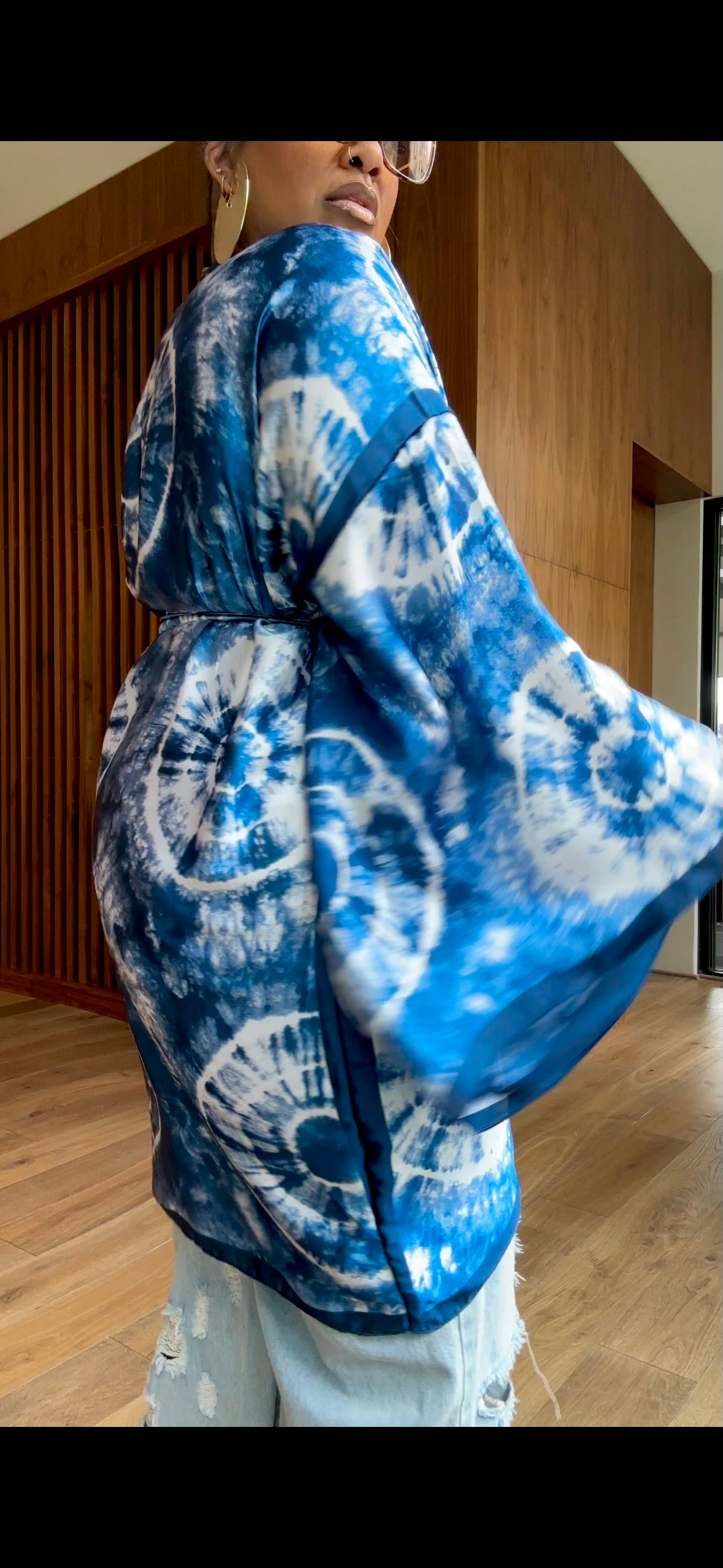 The Azure Robe is a bold, beautiful statement piece with an effortlessly luxe vibe. Designed in a silky poly fabric, this robe features a striking tye dye print . Its fluid drape and open-front silhouette make it perfect for layering.