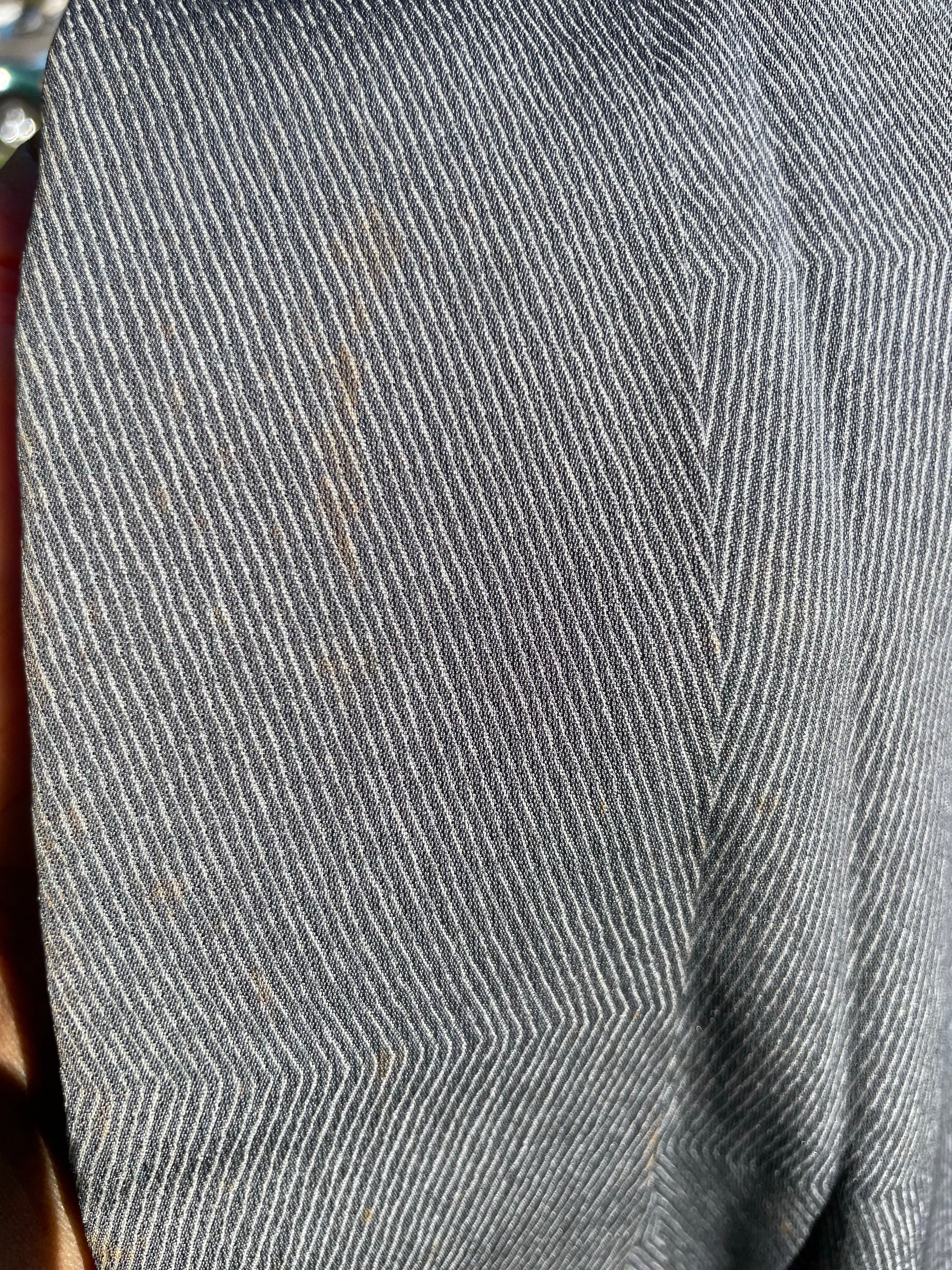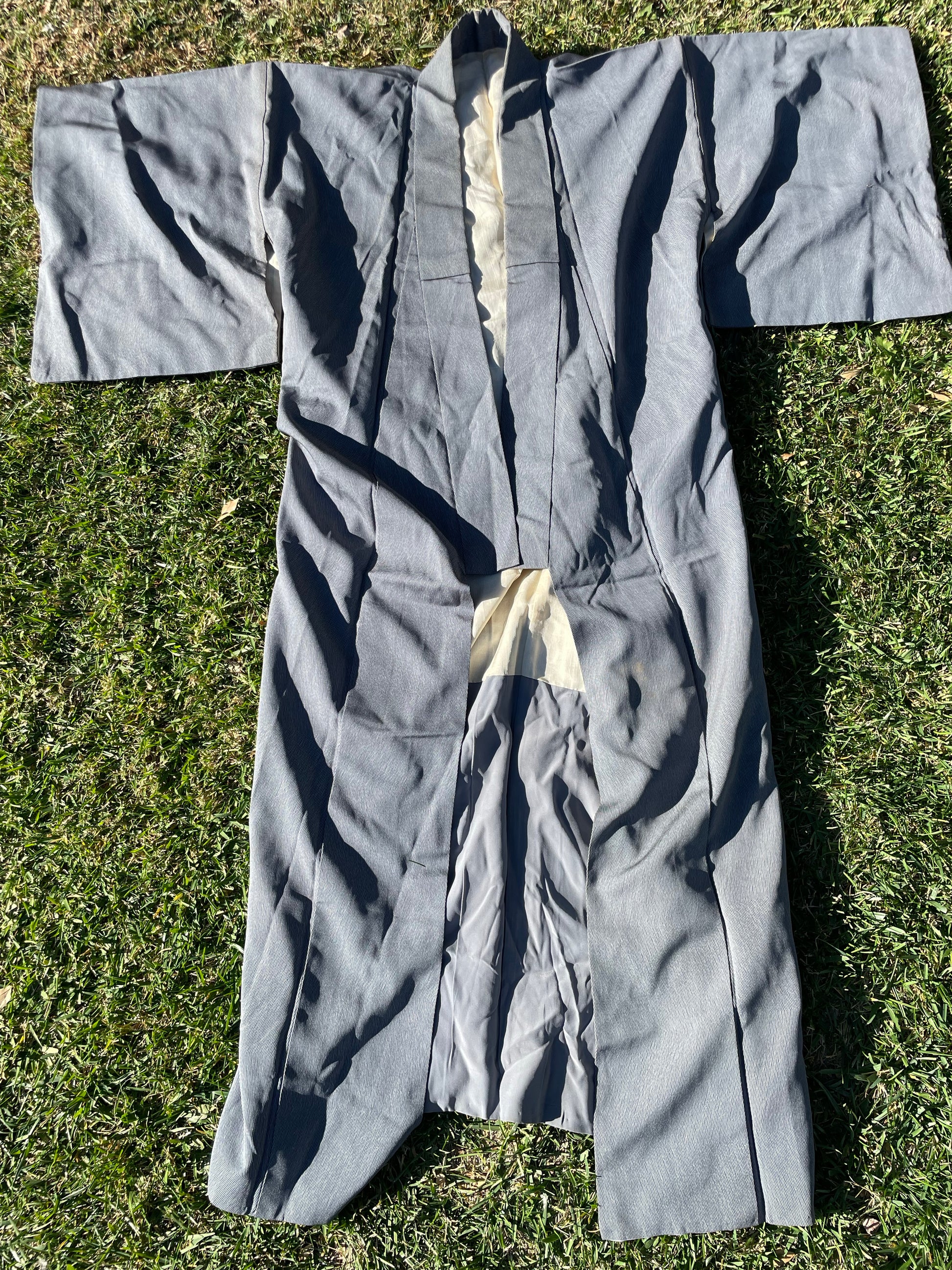 This kimono 👘 is Grey and on the heavy side. Has some spotting around the neck area .
