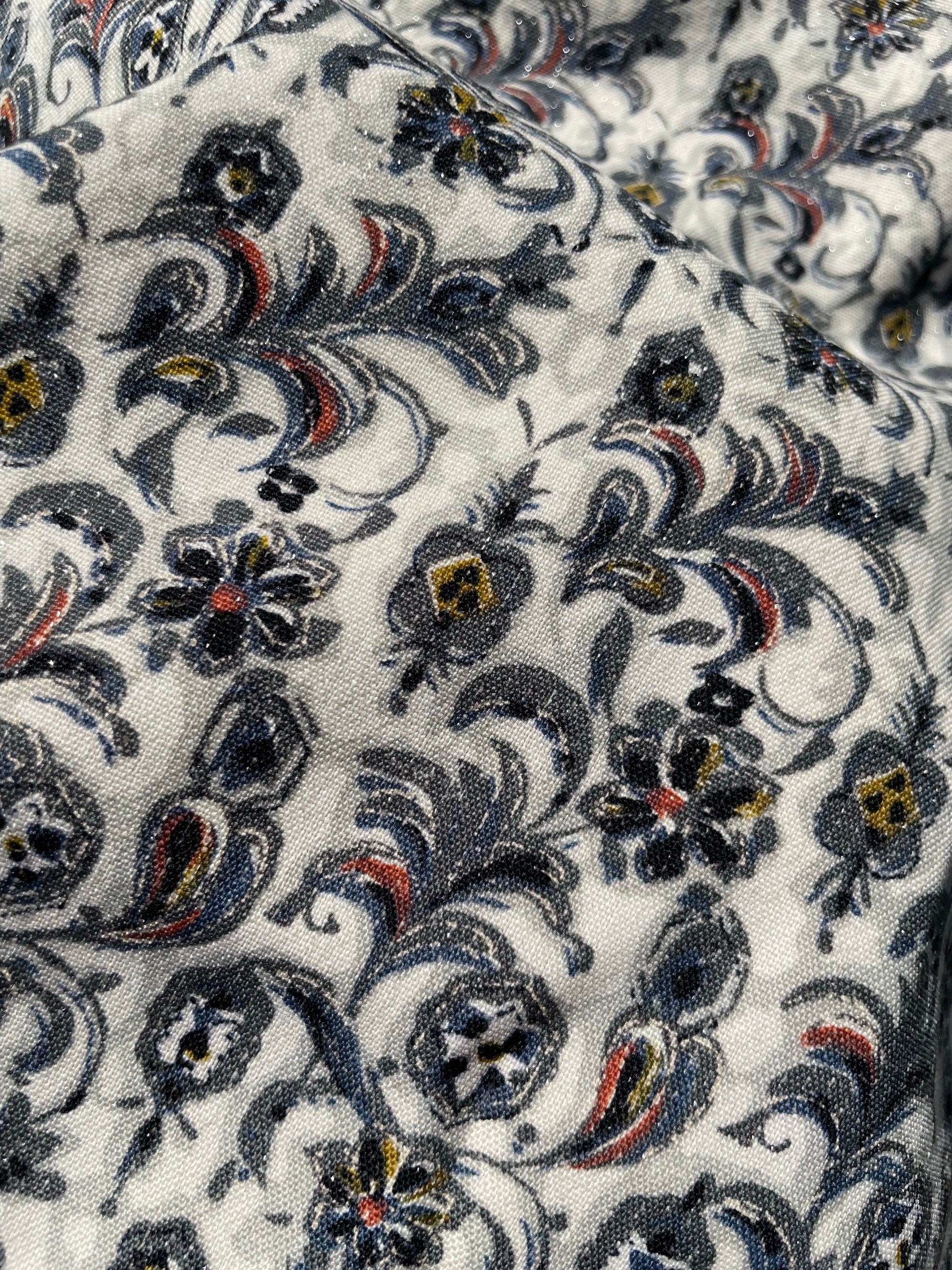 This paisley beauty is gorgeous with denim vibes. she has shimmer throughout the material. it’s in impeccable condition.