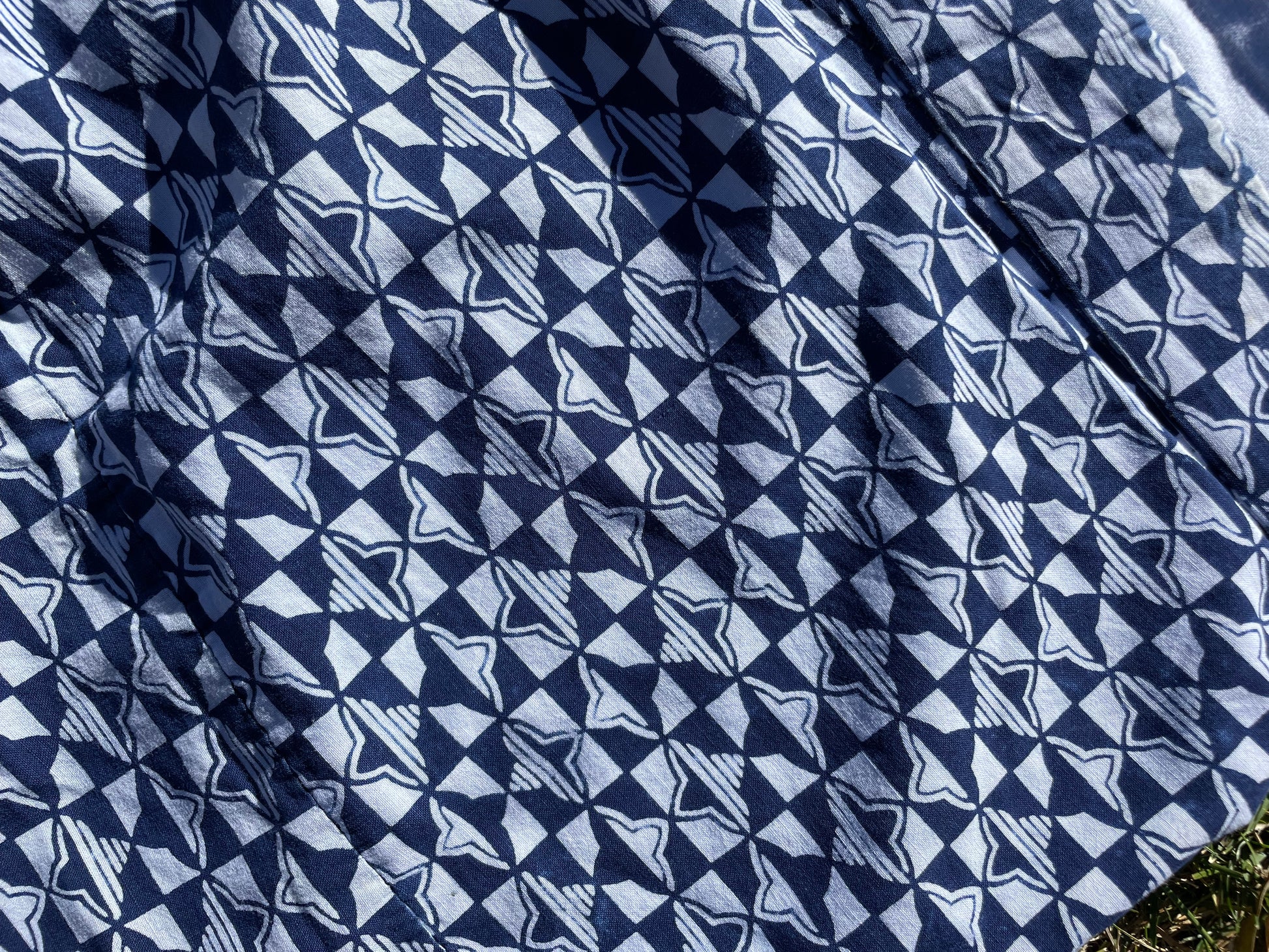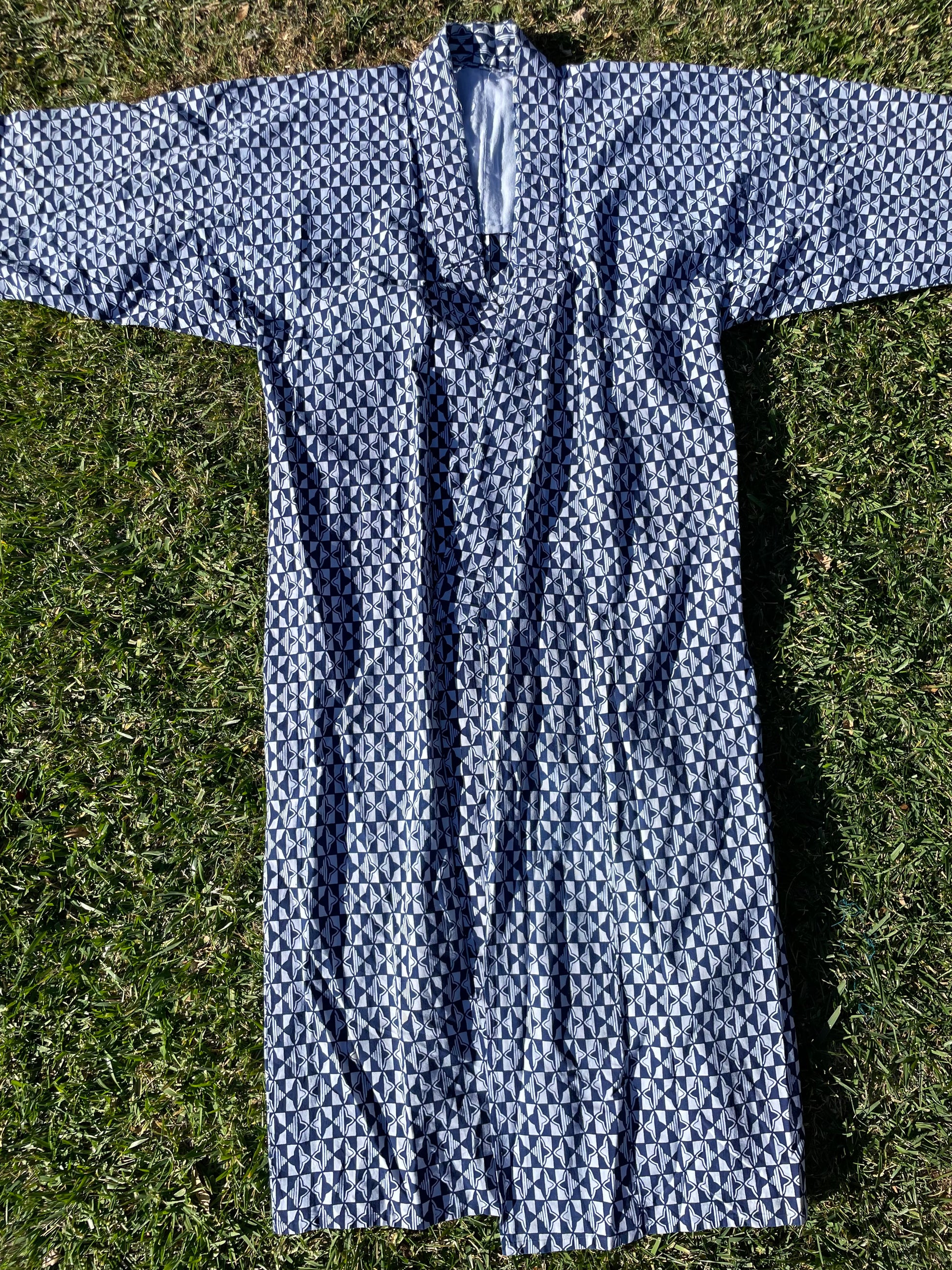 Cotton kimono in a navy blue and white pattern . Has small wholes around the neckline. please refer to pictures for detail.