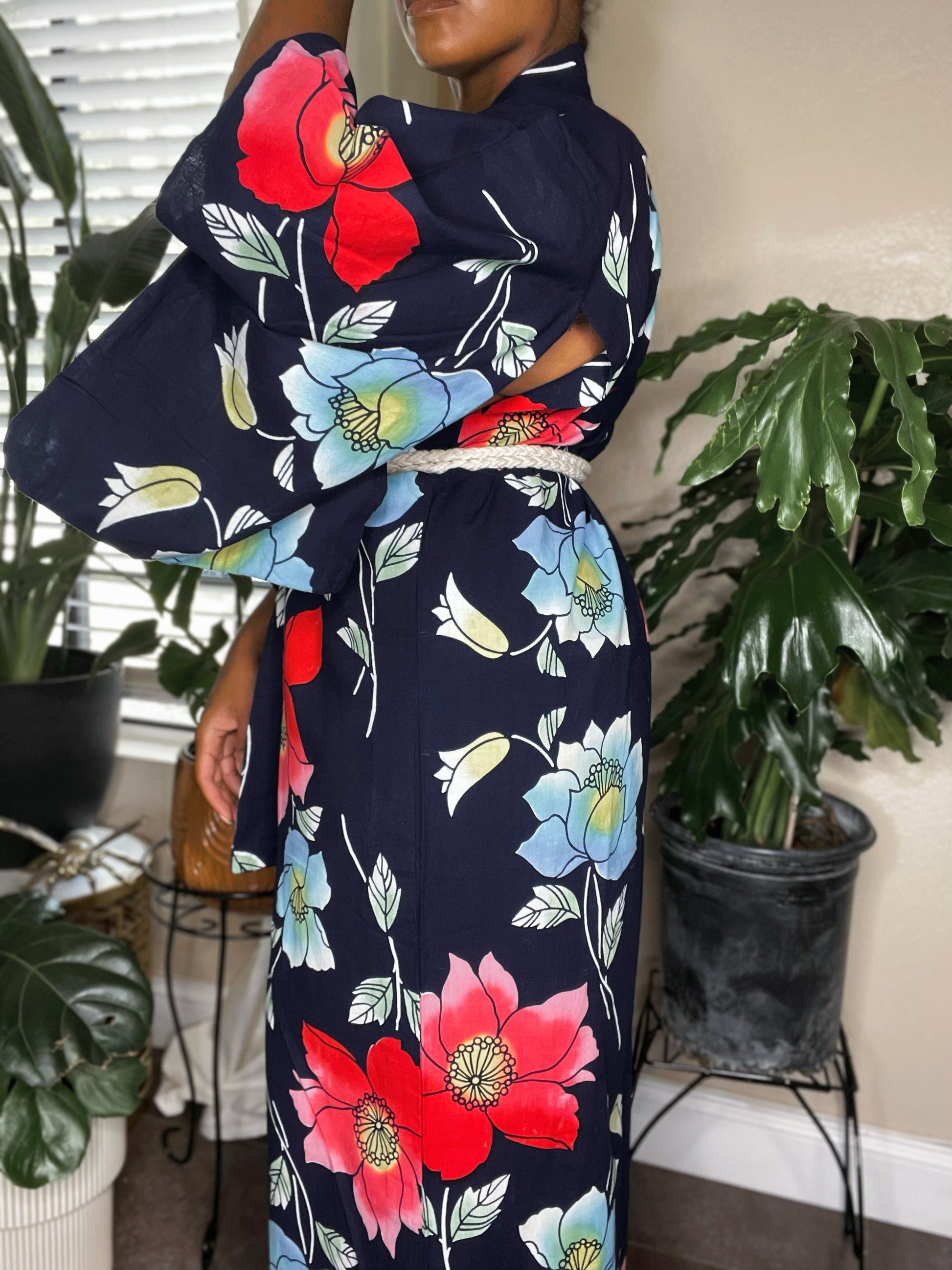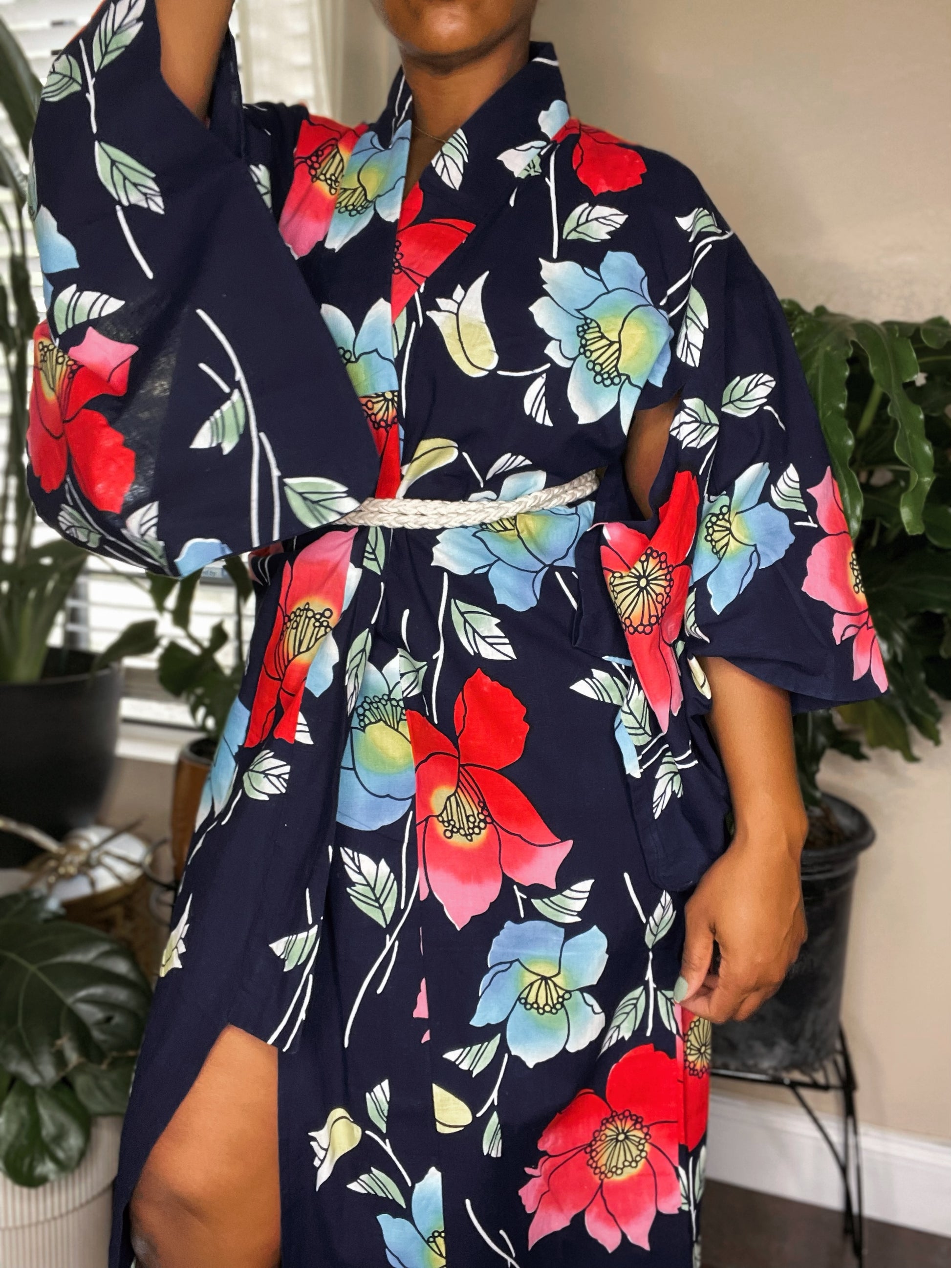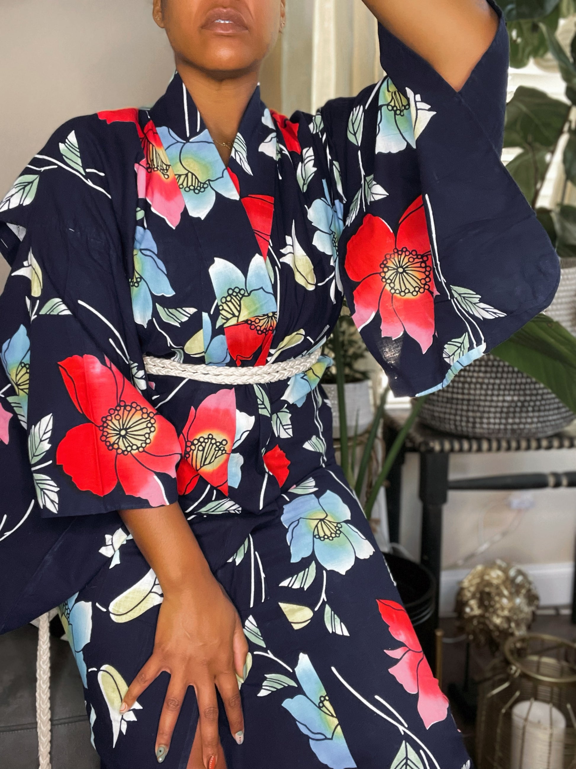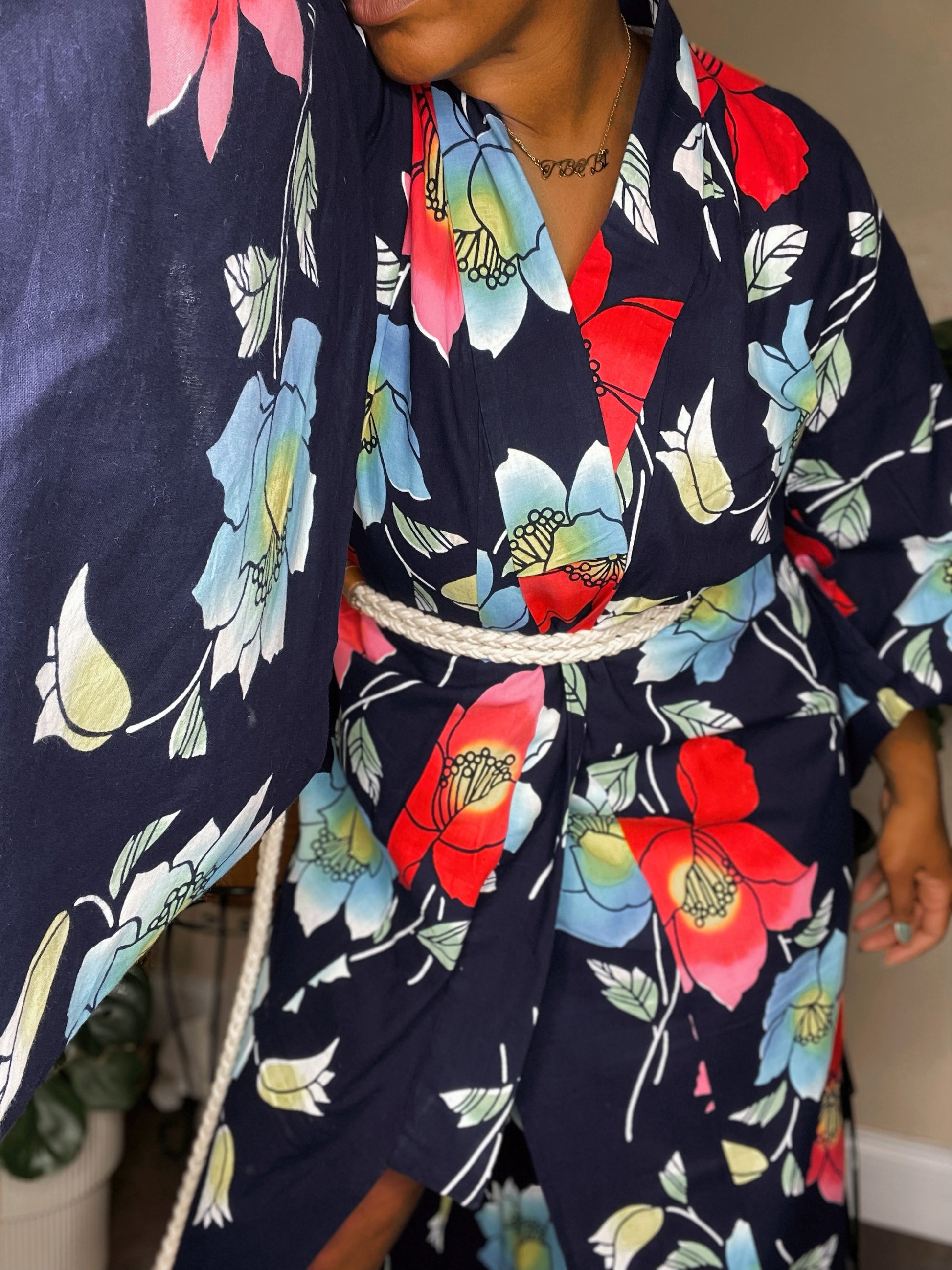 Stunning Navy vintage kimono with Daisies printed all over. This Kimono is thin, flowy, and perfect to pack for a getaway . I love this style to just lounge around the house in.