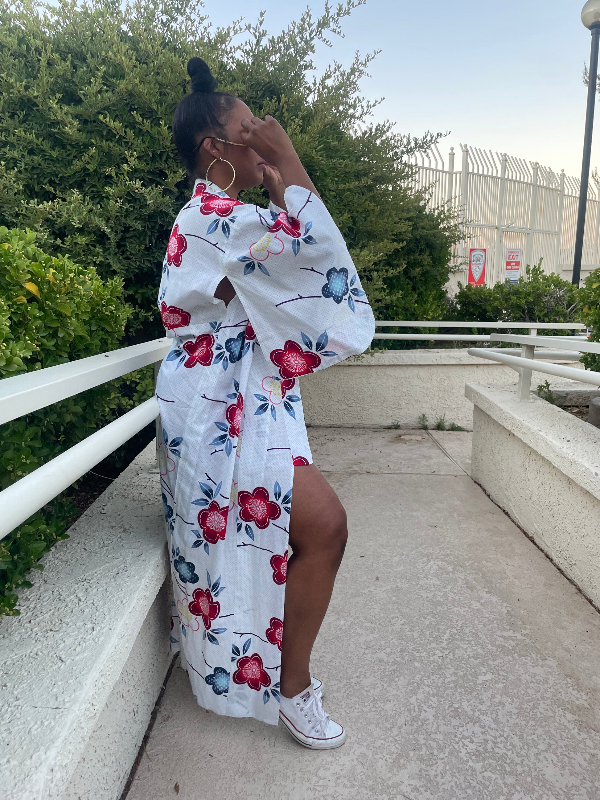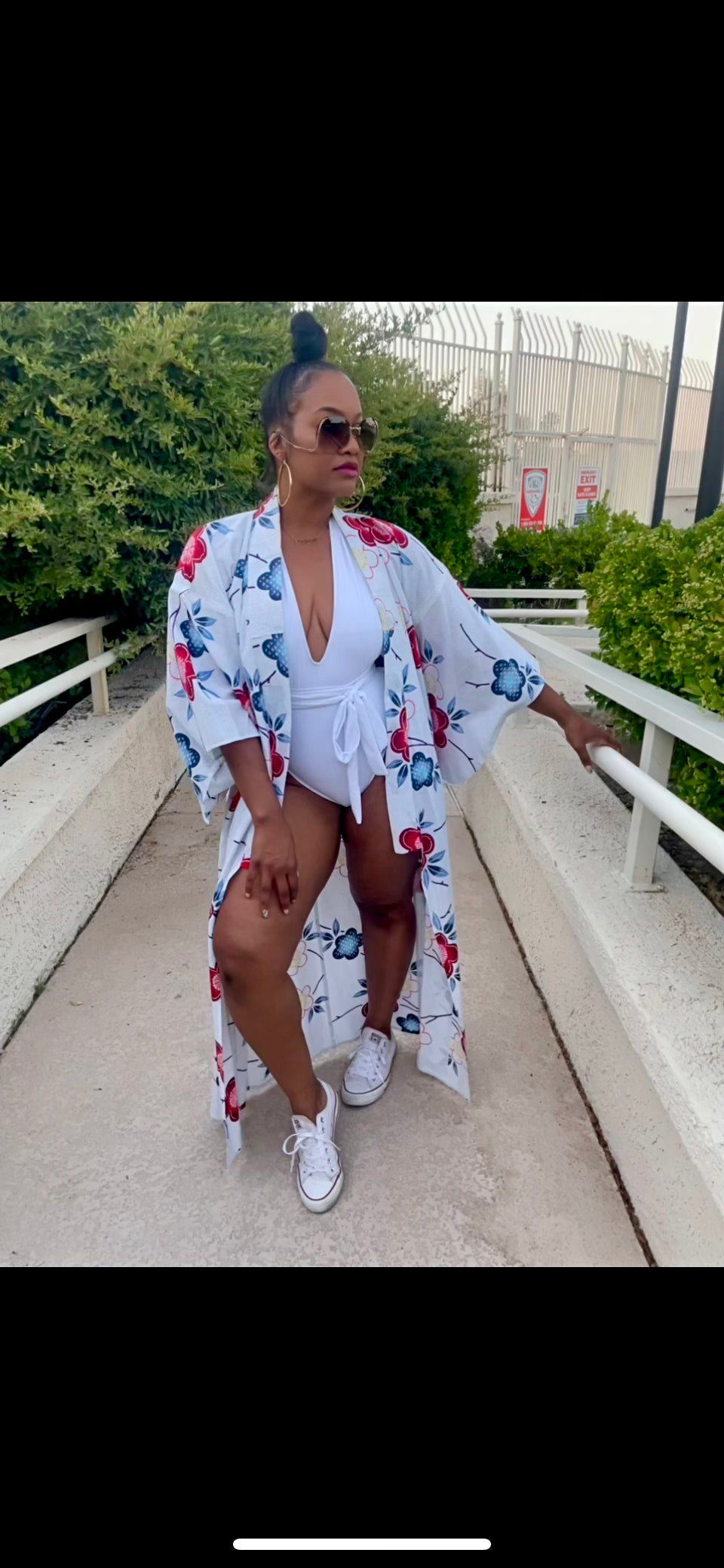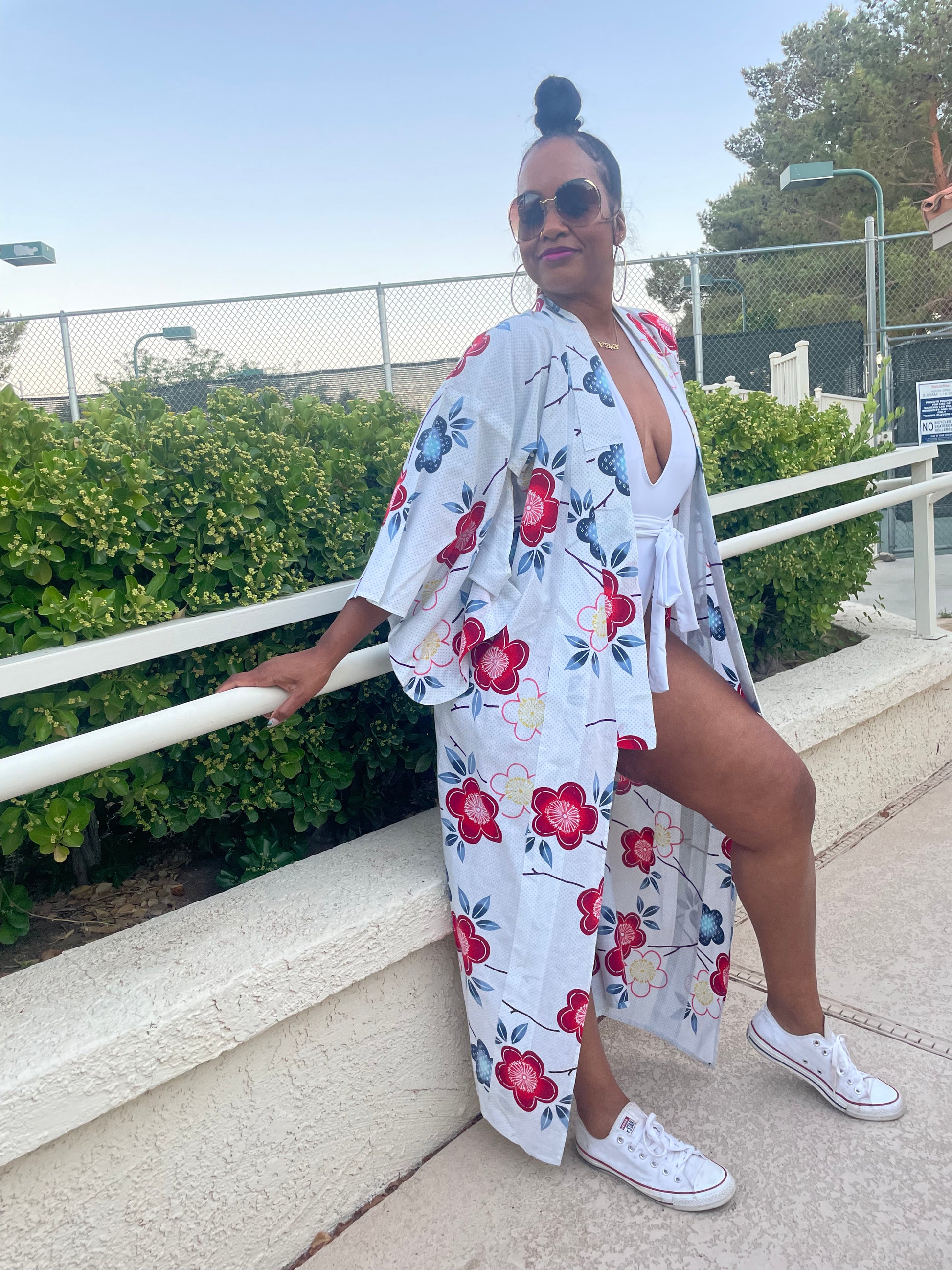 This pretty floral kimono is perfect for summer. and light weight fabric. Great as a cover up or lounging. Rock a kimono with sneakers and you’ll be comfortable all around.