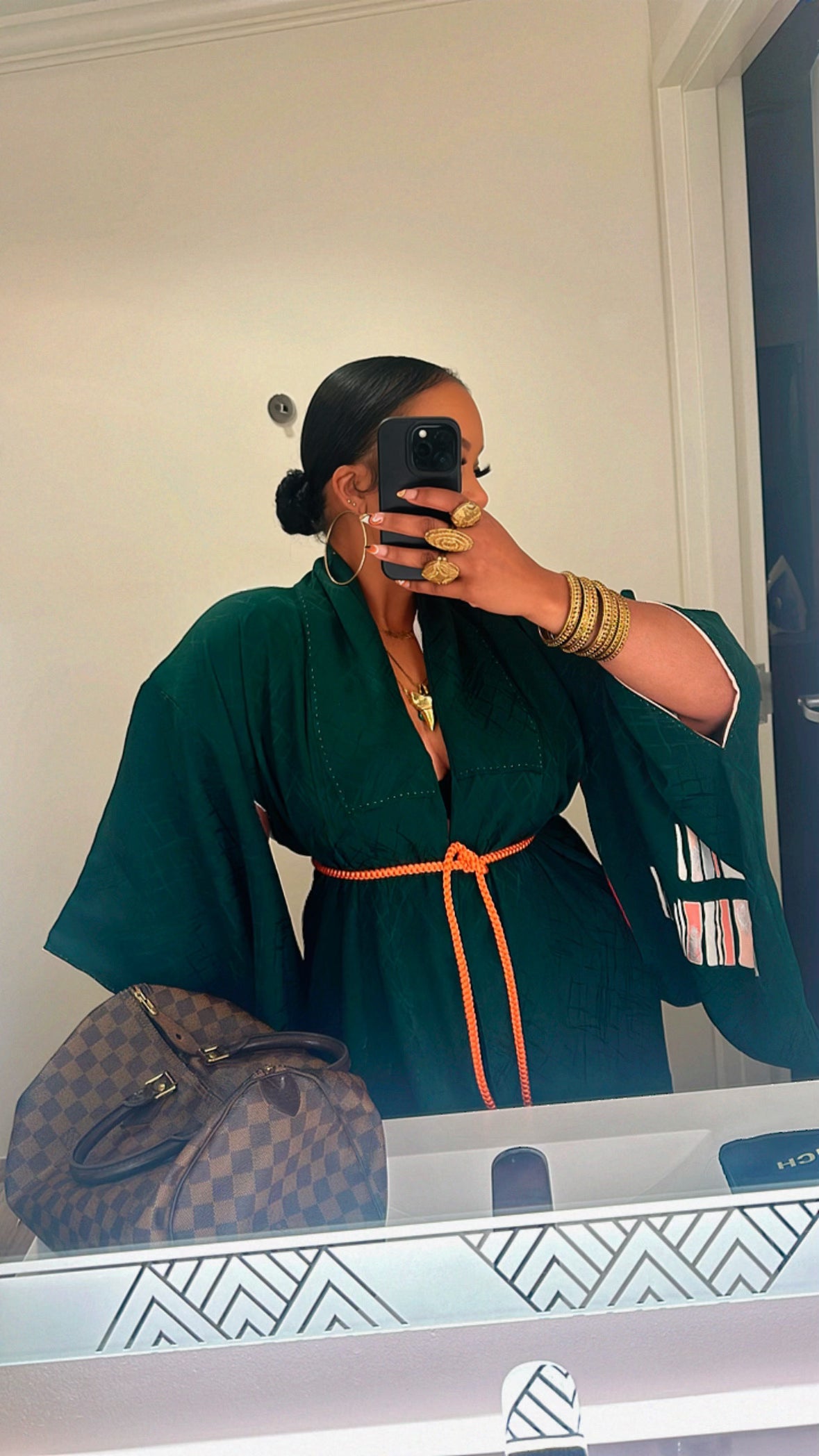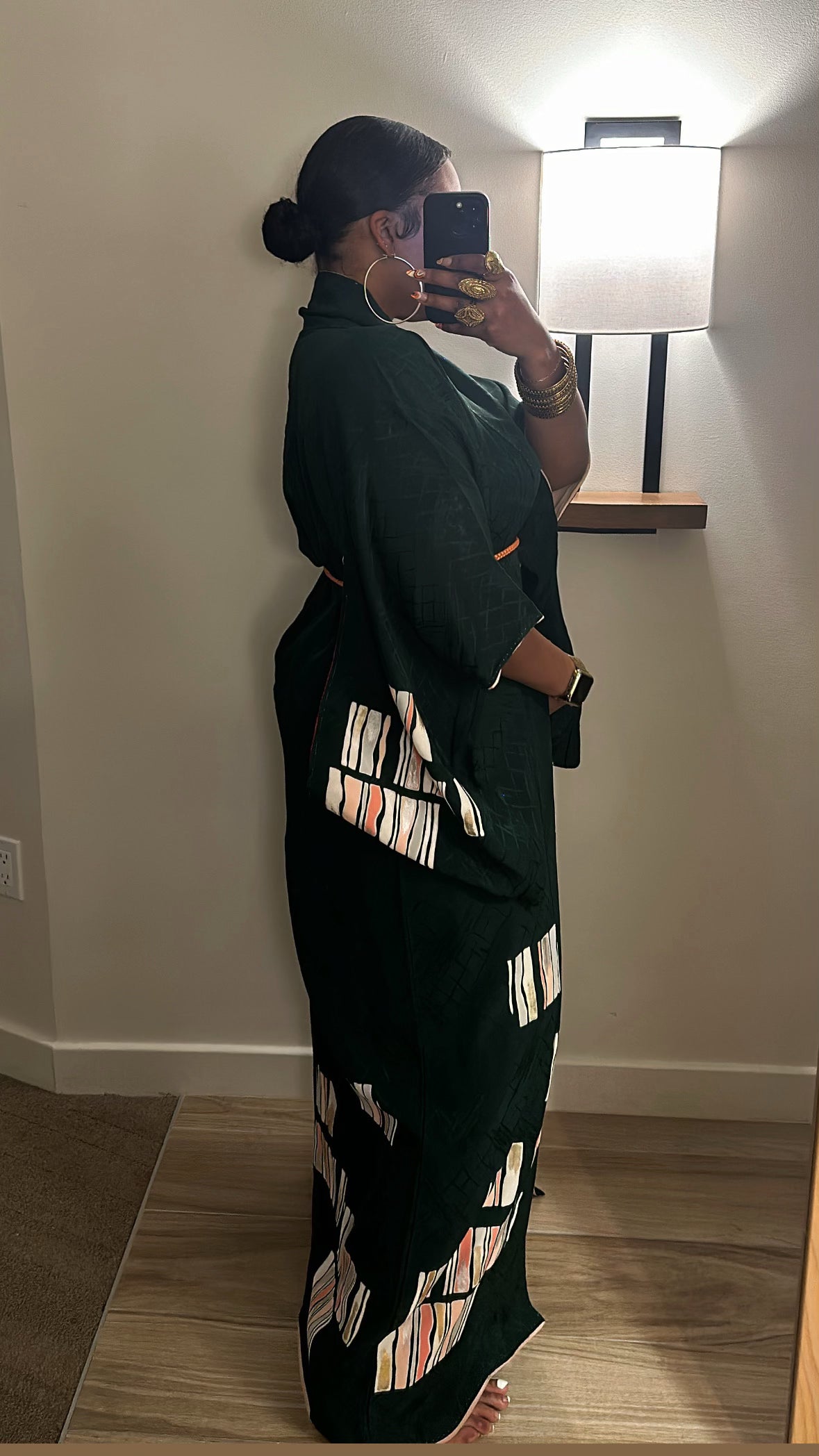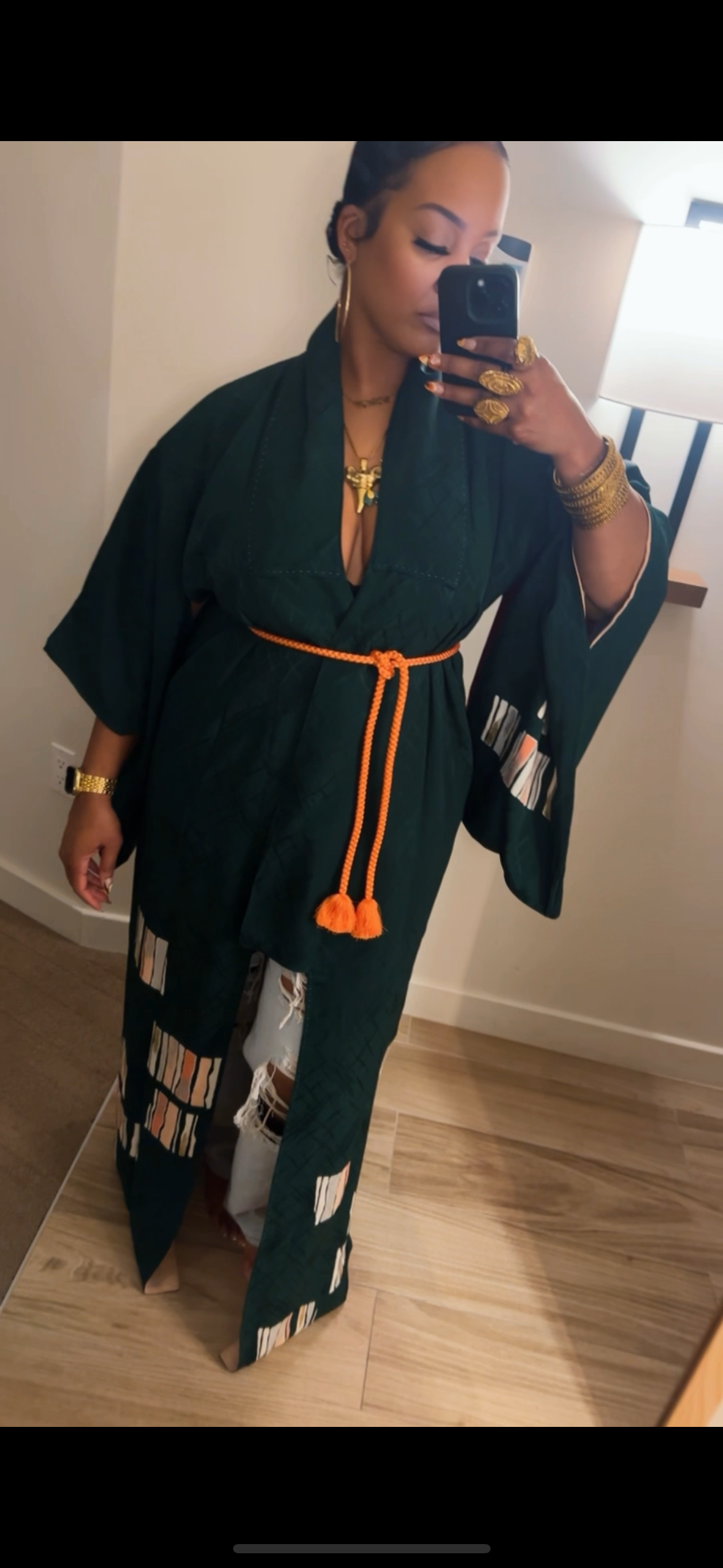 This Silky beauty is so sheik and unique. I Love the pop of peach & red lining that peaks . There is an abstract pattern that has a sheen finish . You can dress this piece up or down . Oversized and very long. Belt is included .