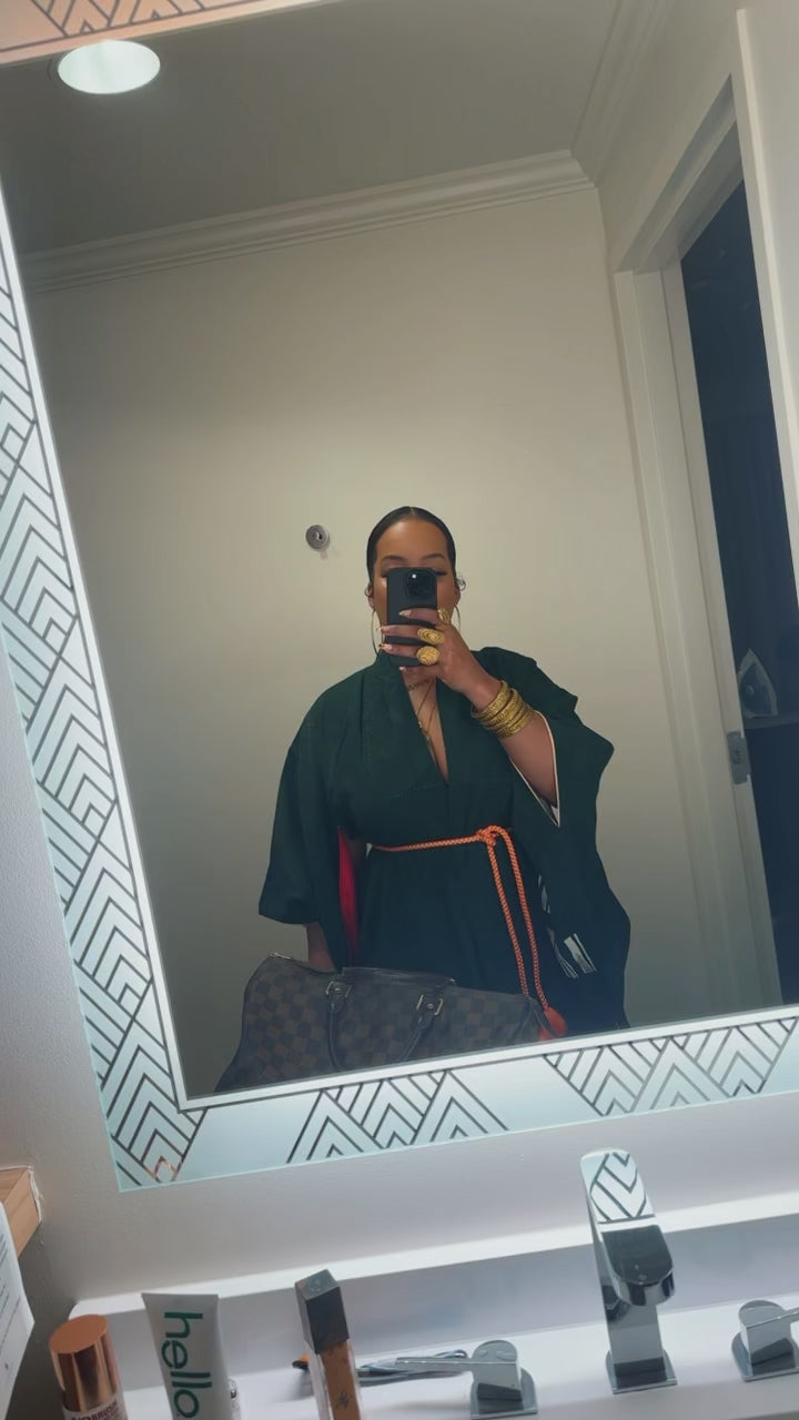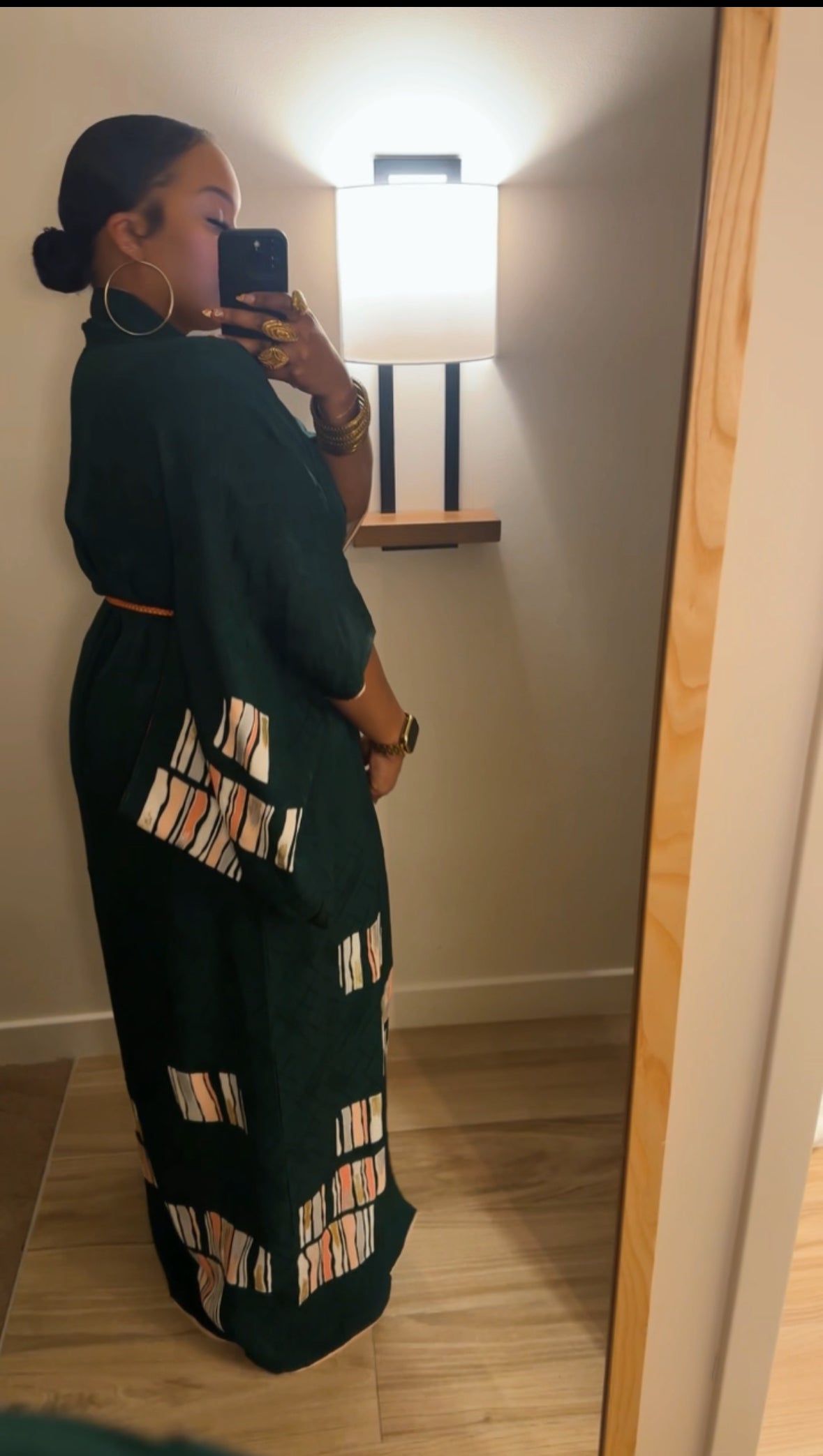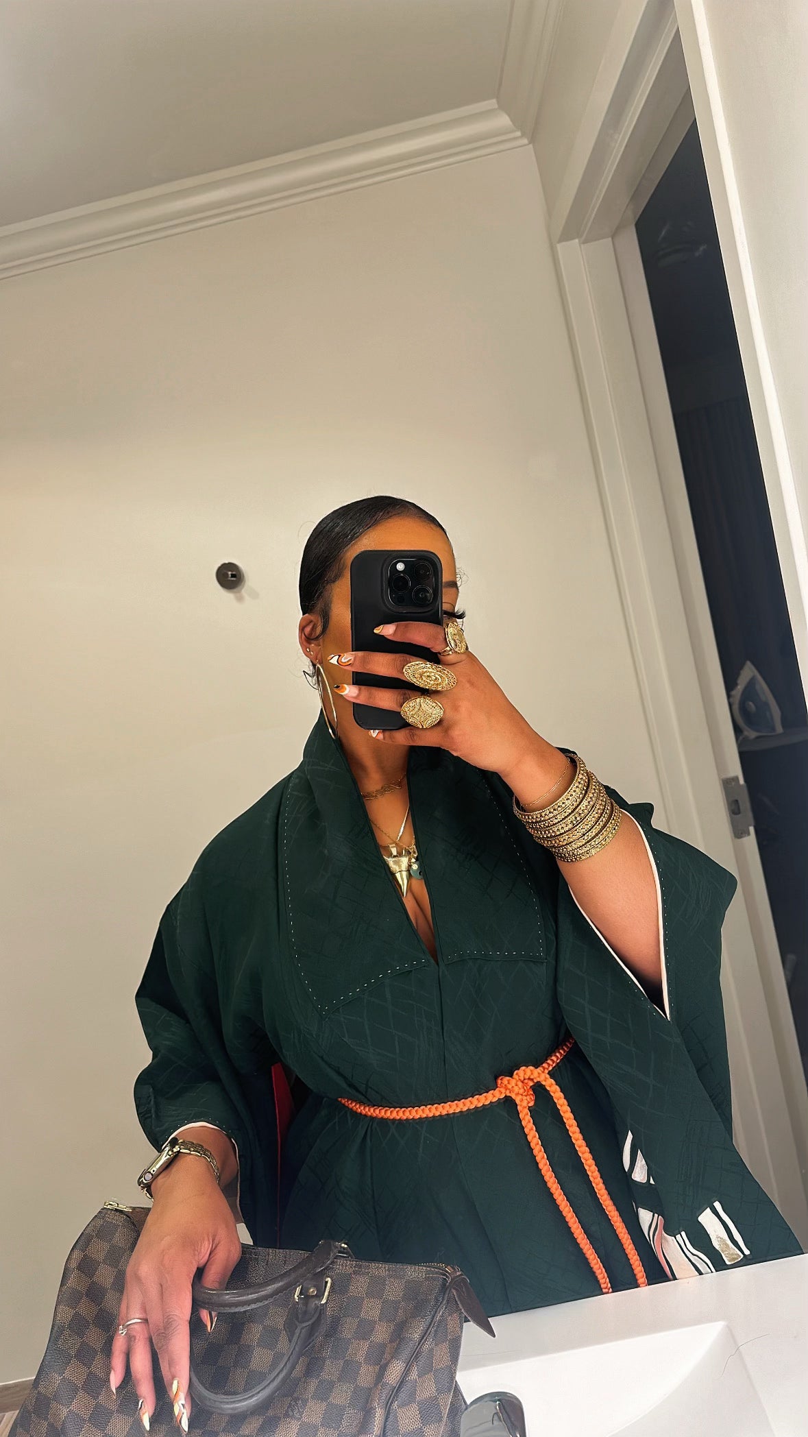 This Silky beauty is so sheik and unique. I Love the pop of peach & red lining that peaks . There is an abstract pattern that has a sheen finish . You can dress this piece up or down . Oversized and very long. Belt is included .