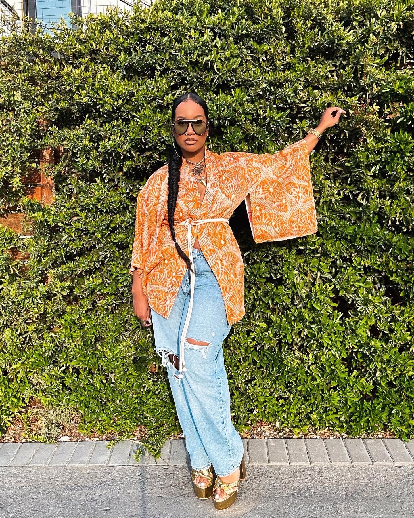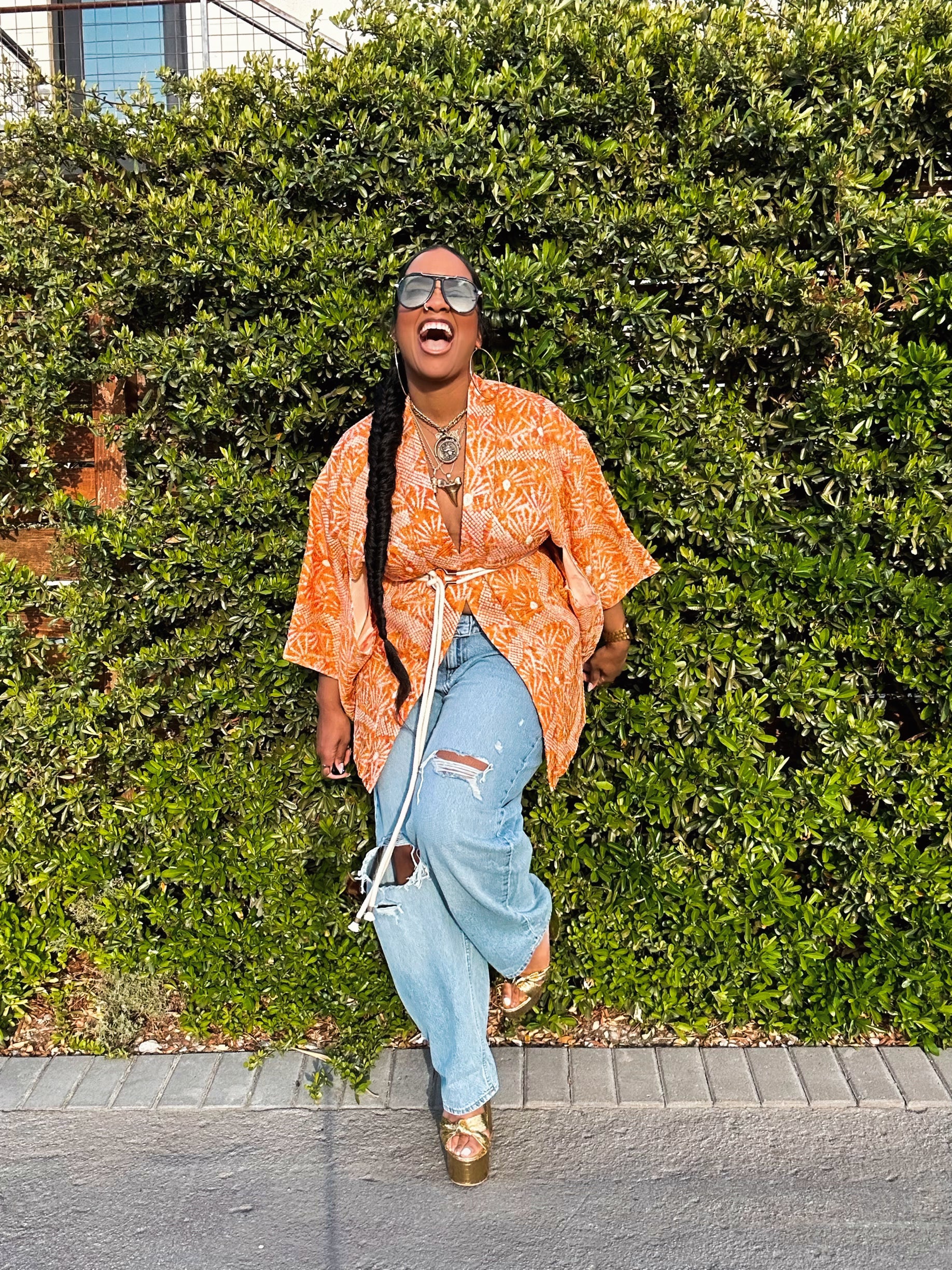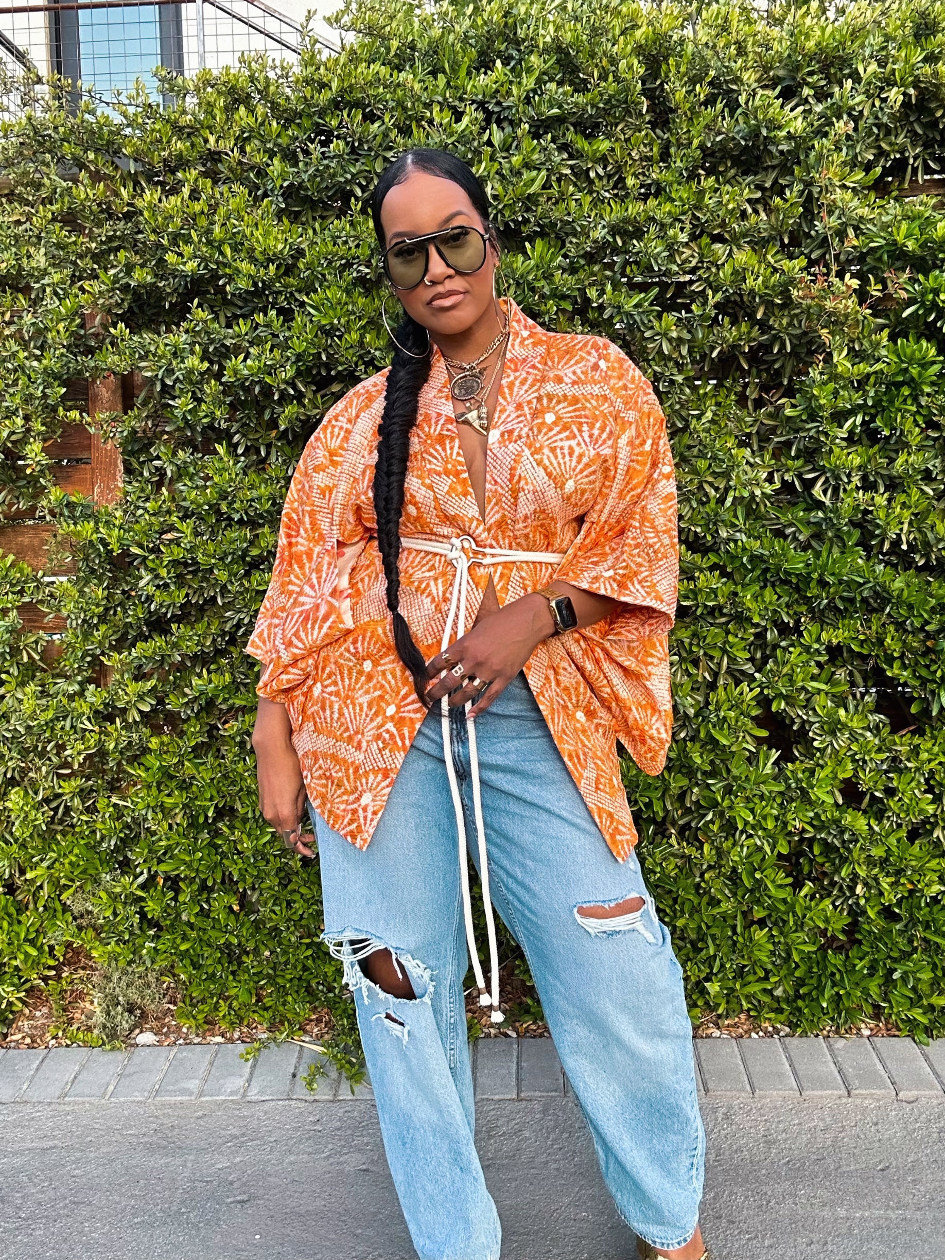 The kimono’s short haori design allows it to be perfectly paired with anything a closet has to offer. The vintage piece is a stunning combination of fun, comfort, and elegance with its loosely draped shape and large open sleeves.