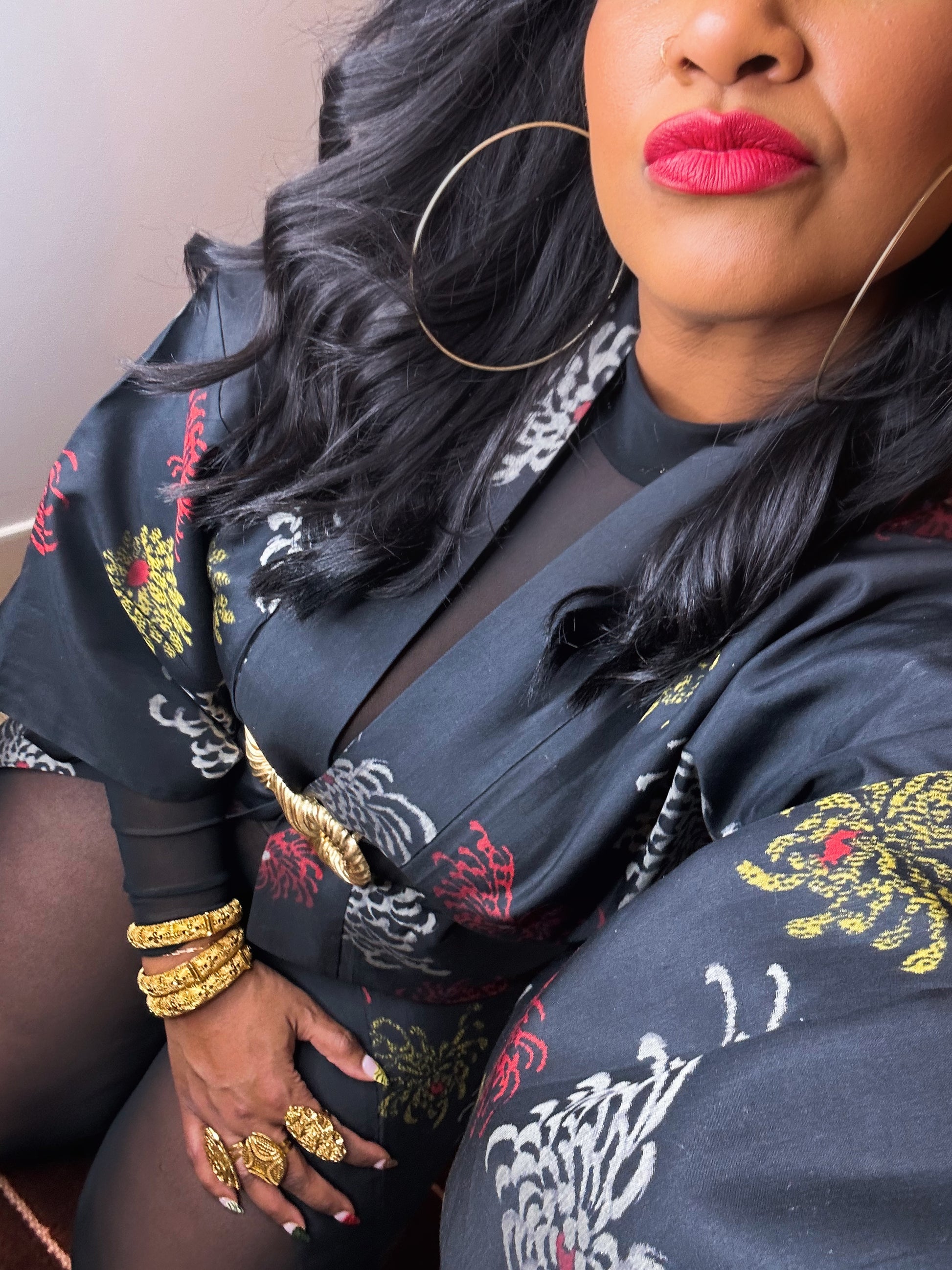This kimono is so unique. The color combination is my absolute favorite. I think of so many lovely ways to wear this . She is heavy enough where you can wear her at night as a jacket. This kimono is medium length so she is perfect for a petite or tall woman.