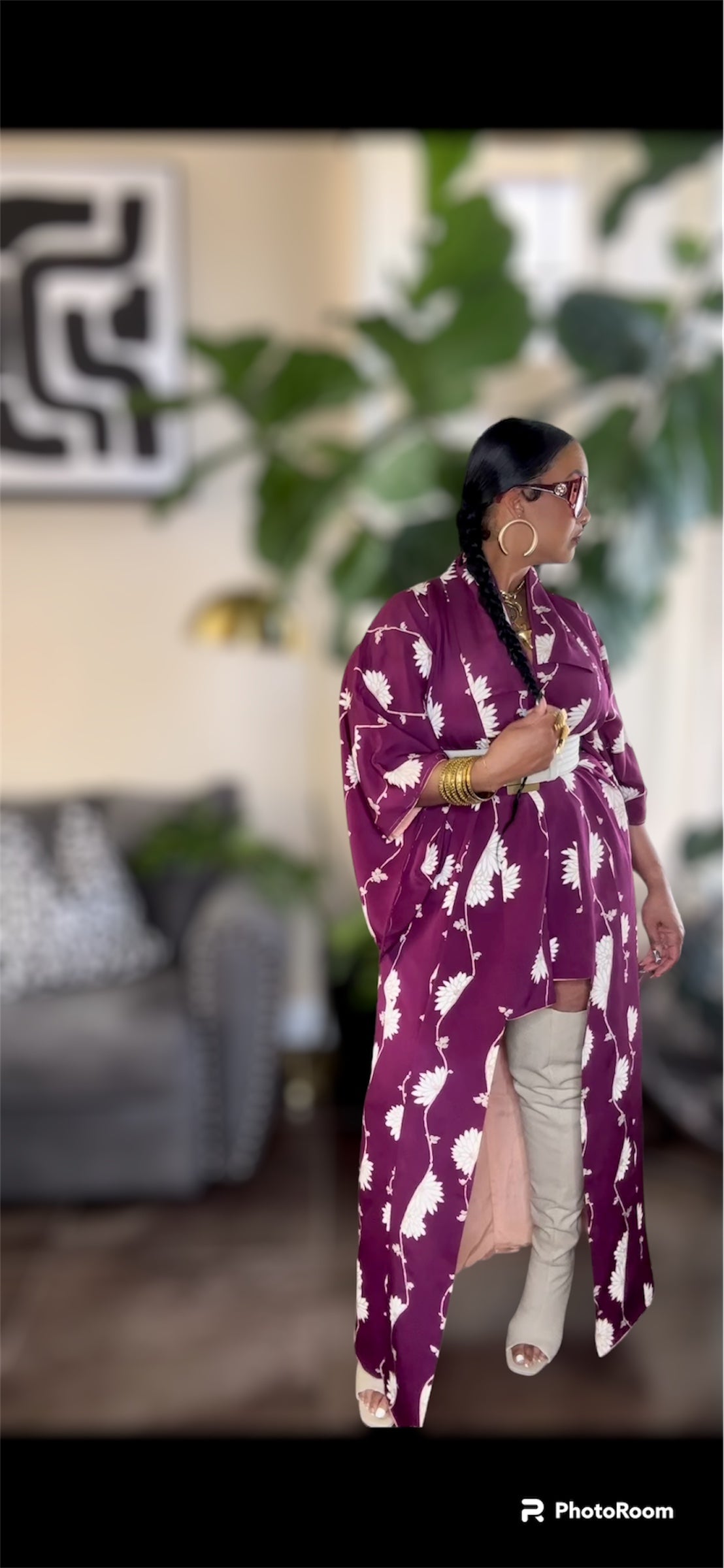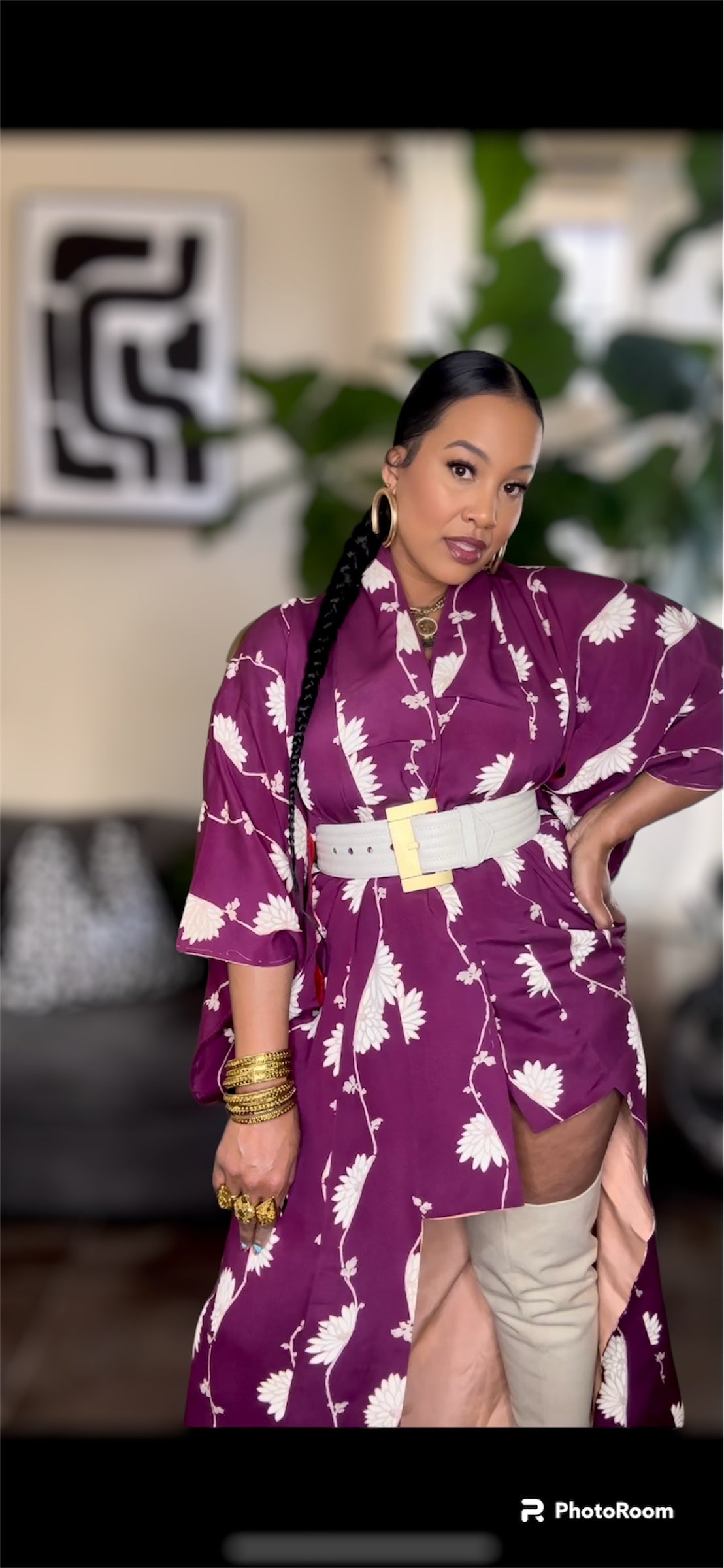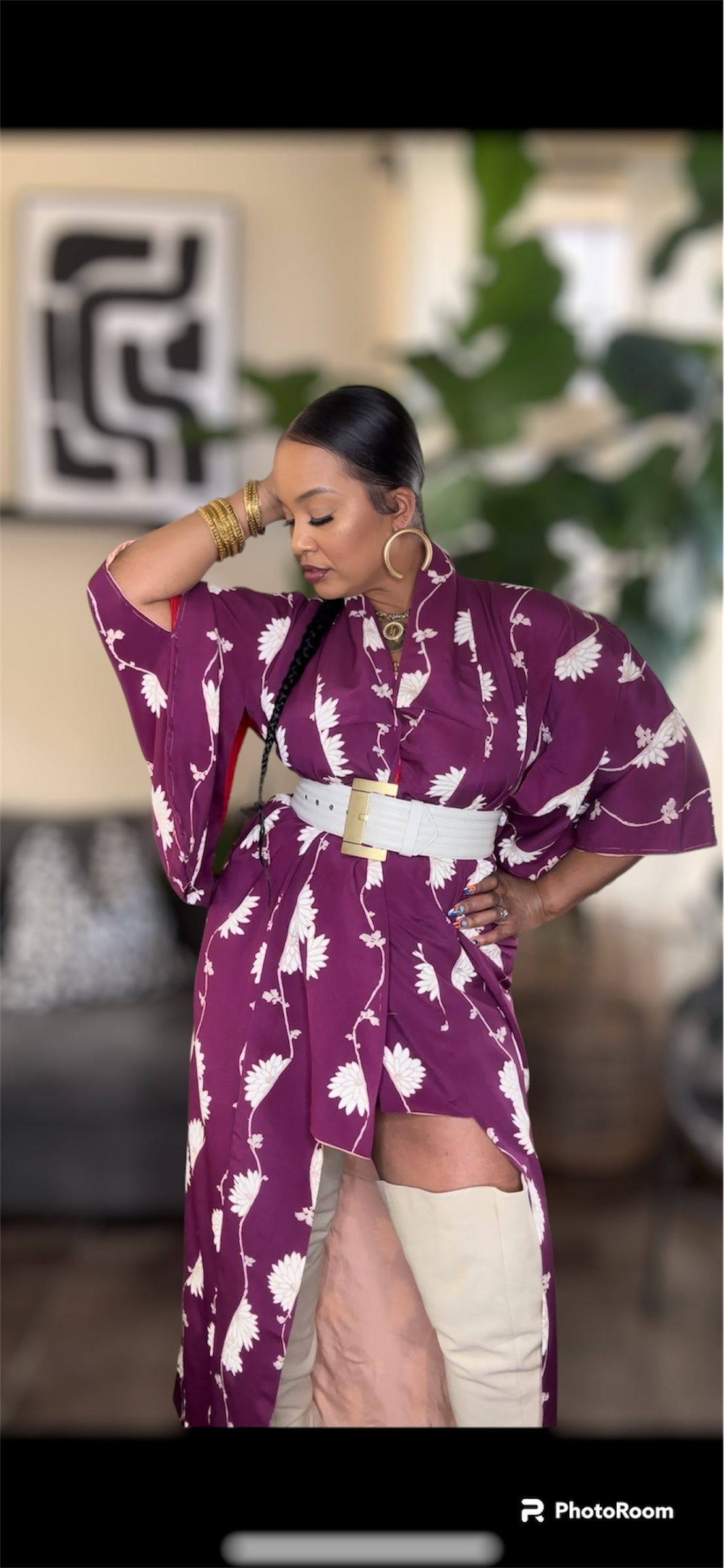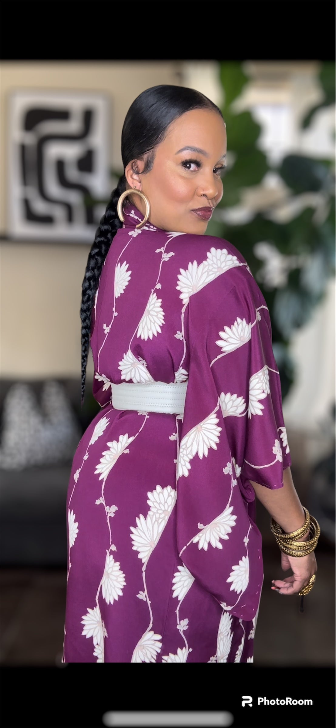 Gorgeous silk kimono in a vibrant purple color with floral print all over. The ultimate kimono robe, it feels so luxurious. Very silky and can be used for going out or just wanting a beautiful piece to lounge around the house.