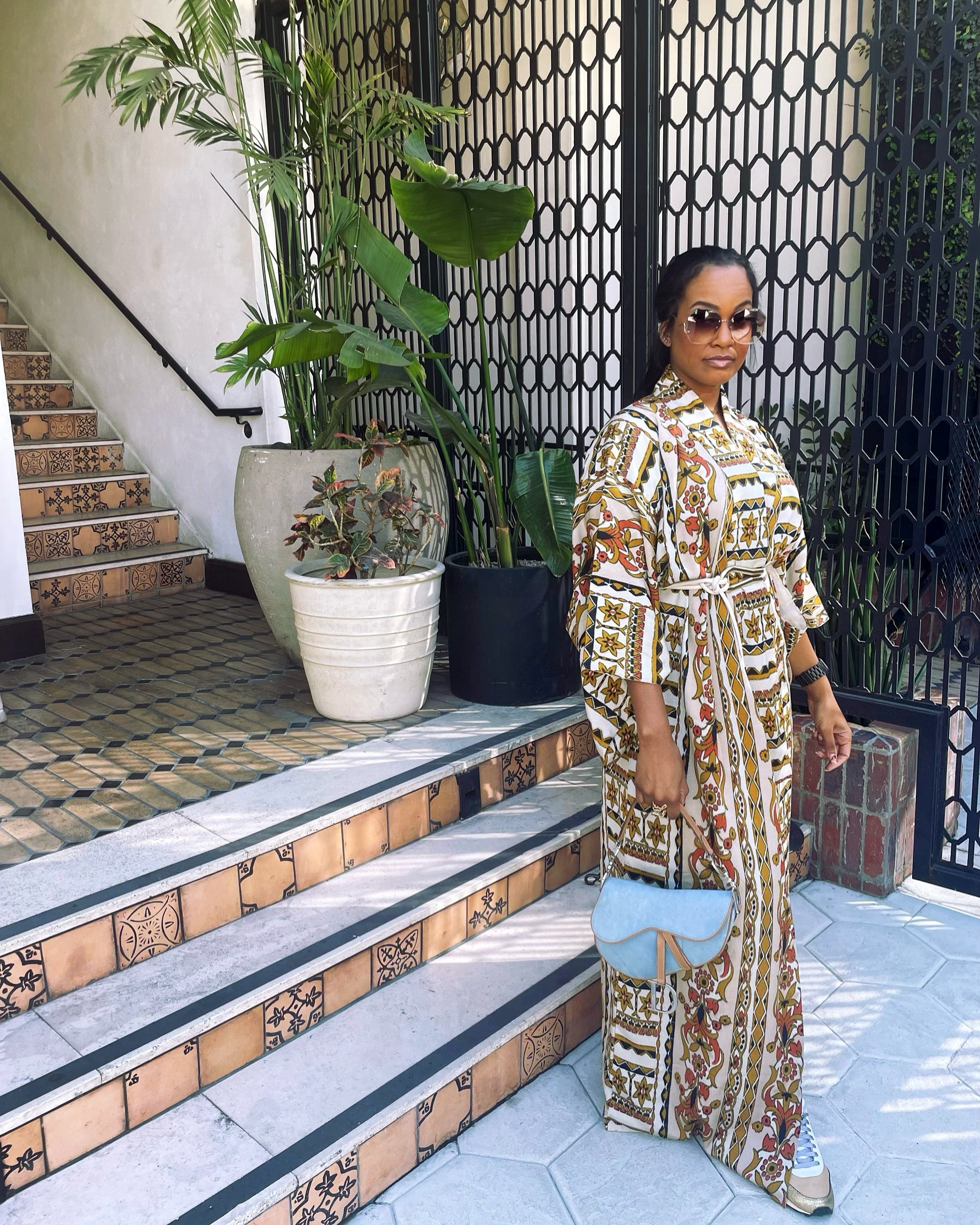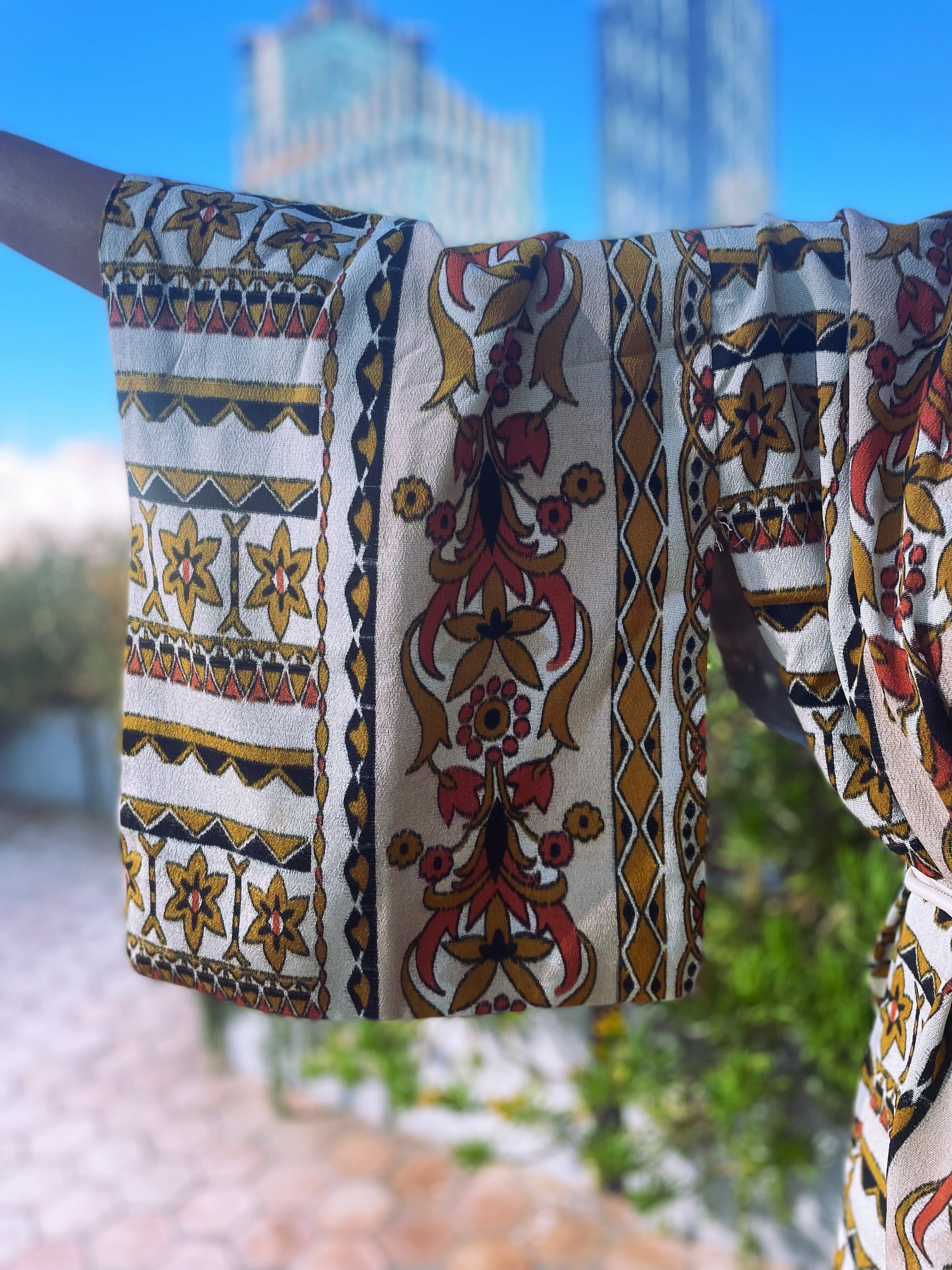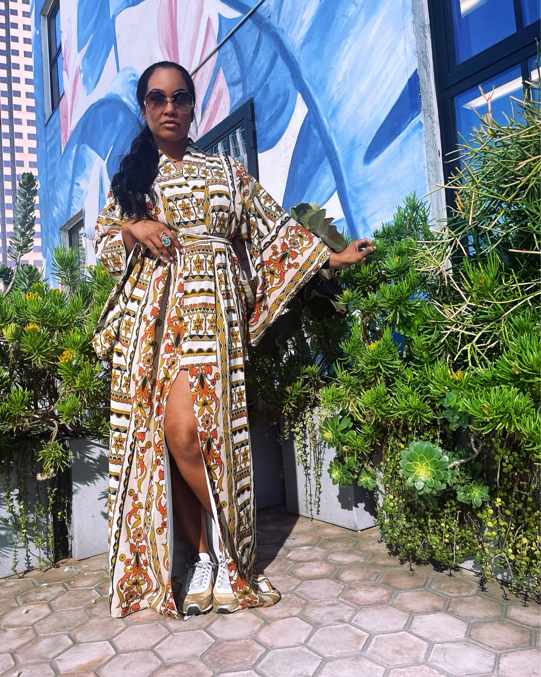 - So effortlessly eye catching and made to turn heads . This vibrant kimono is a lightweight fabric and beautiful worn like a dress . Just add a belt & sneakers for a effortless vibe.