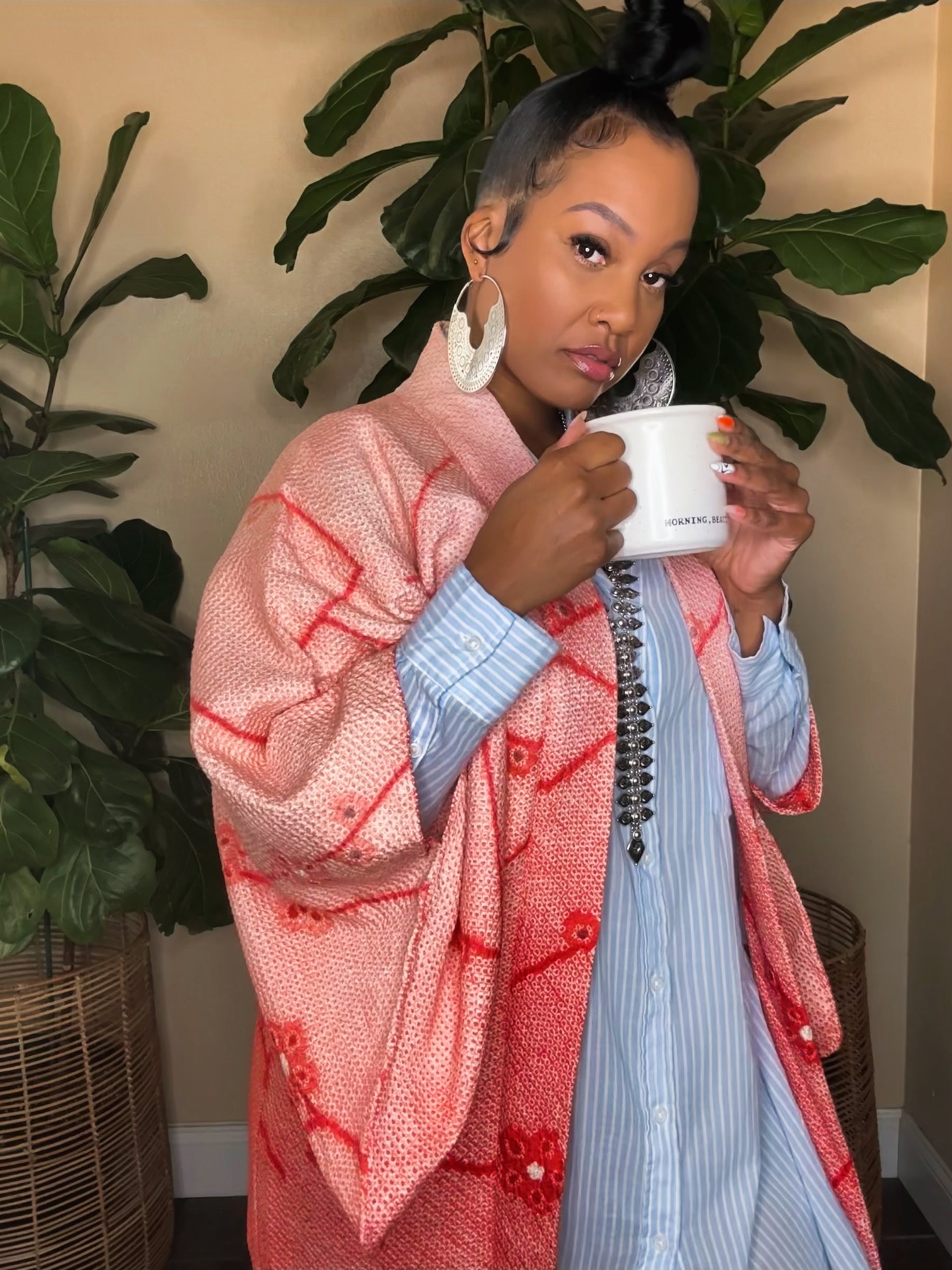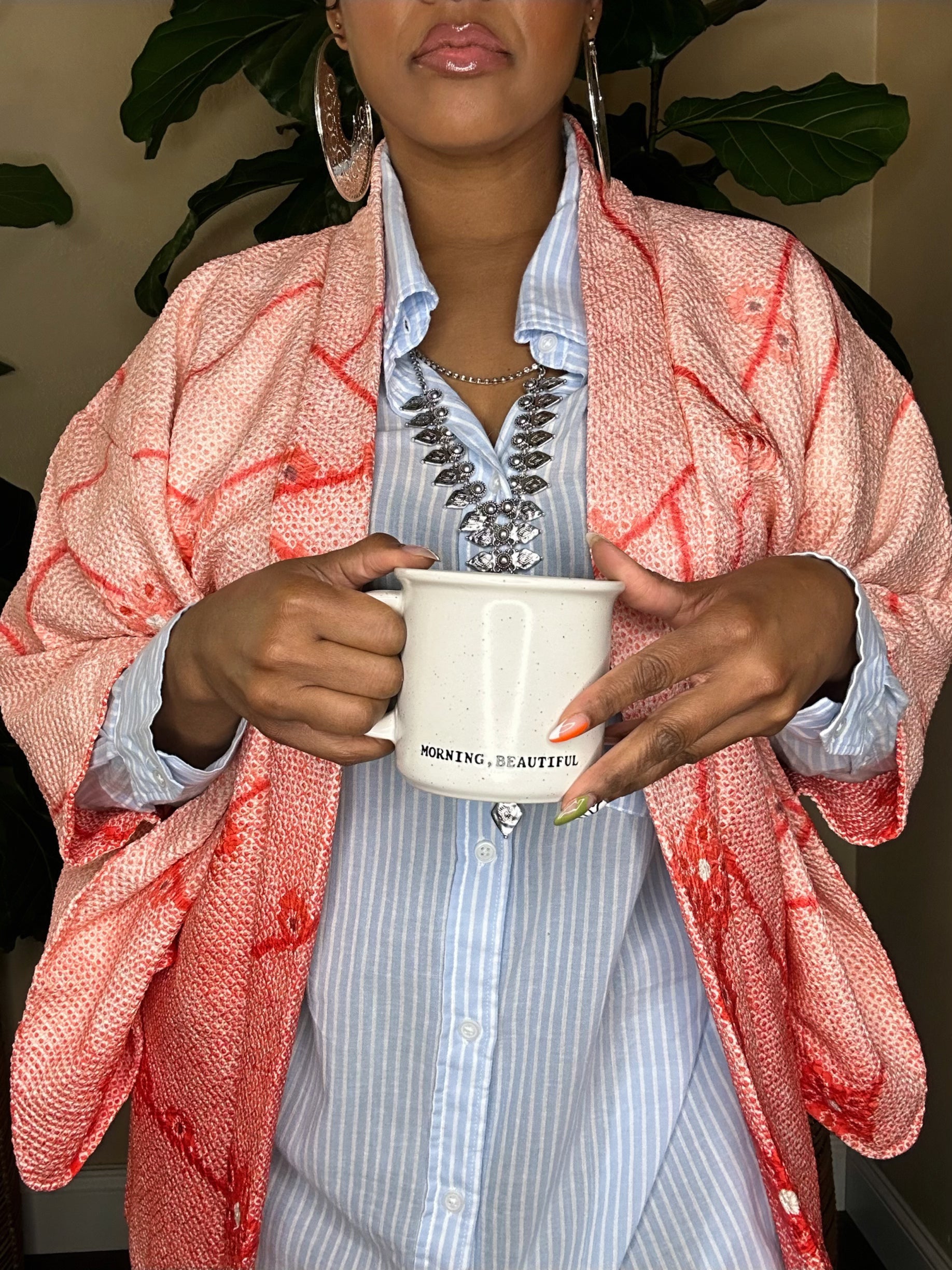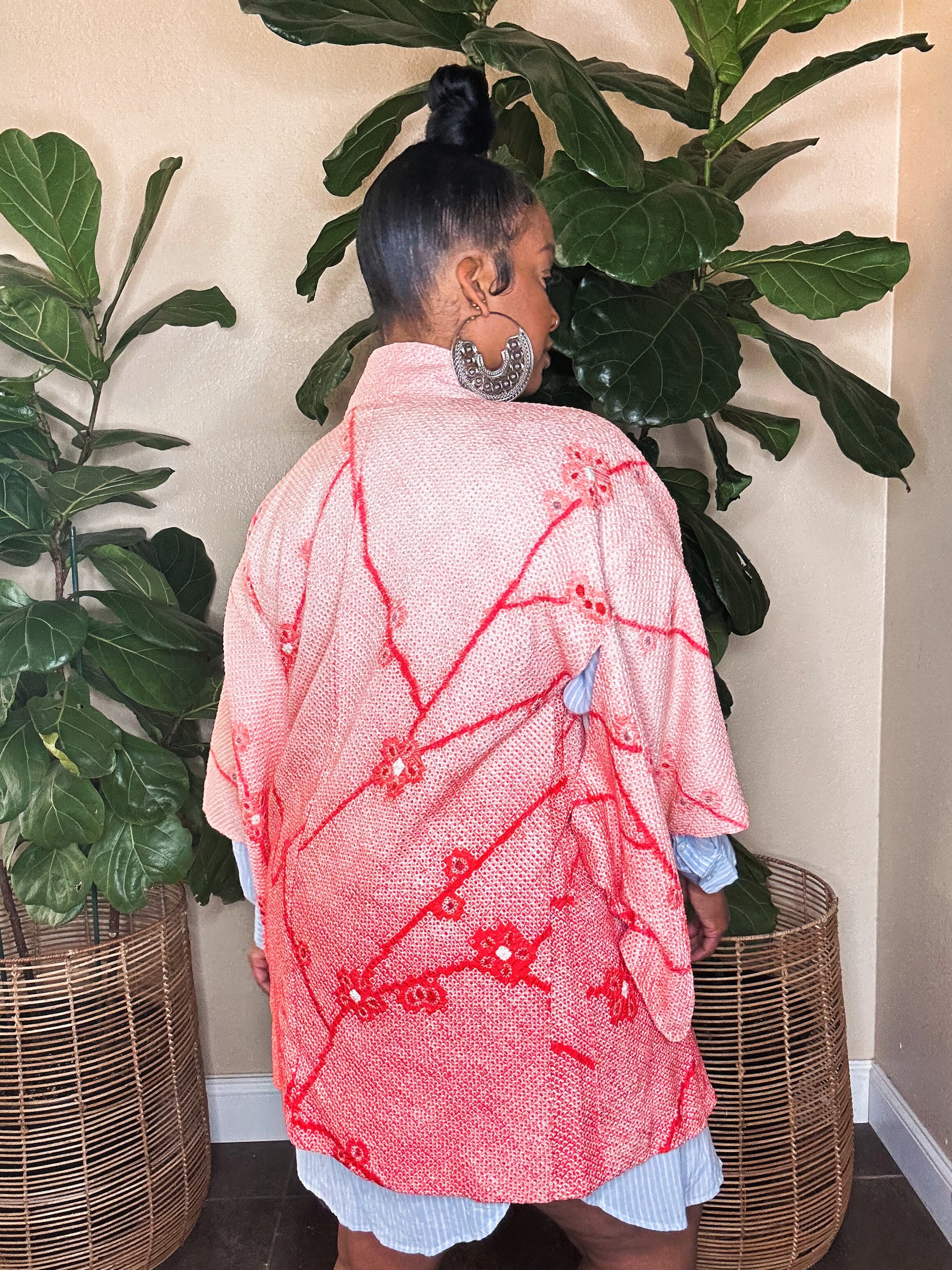 The kimono’s short haori design allows it to be perfectly paired with anything a closet has to offer. The vintage piece is a stunning combination of fun, comfort, and elegance with its loosely draped shape and large open sleeves.