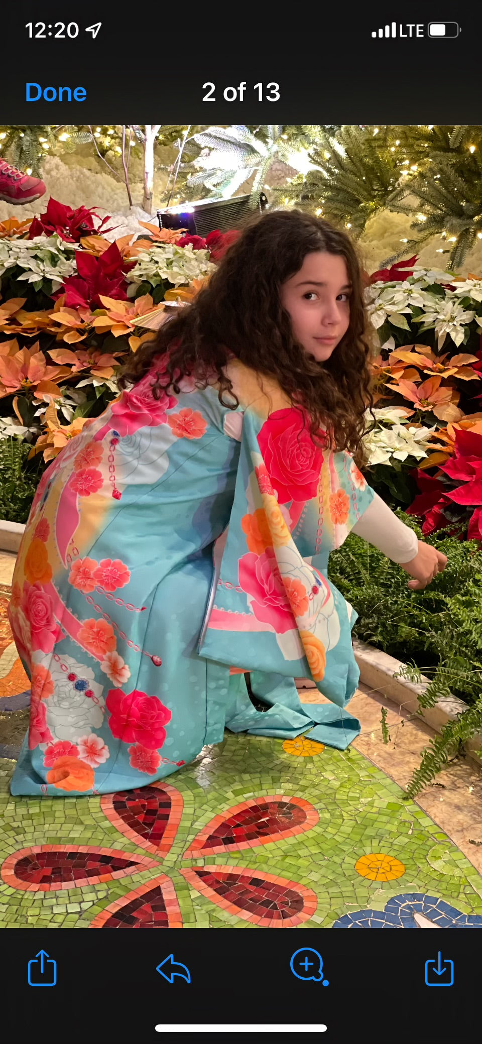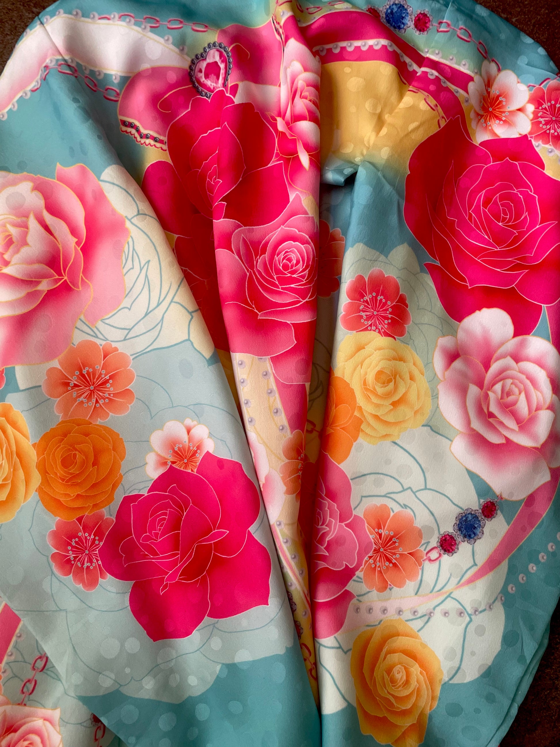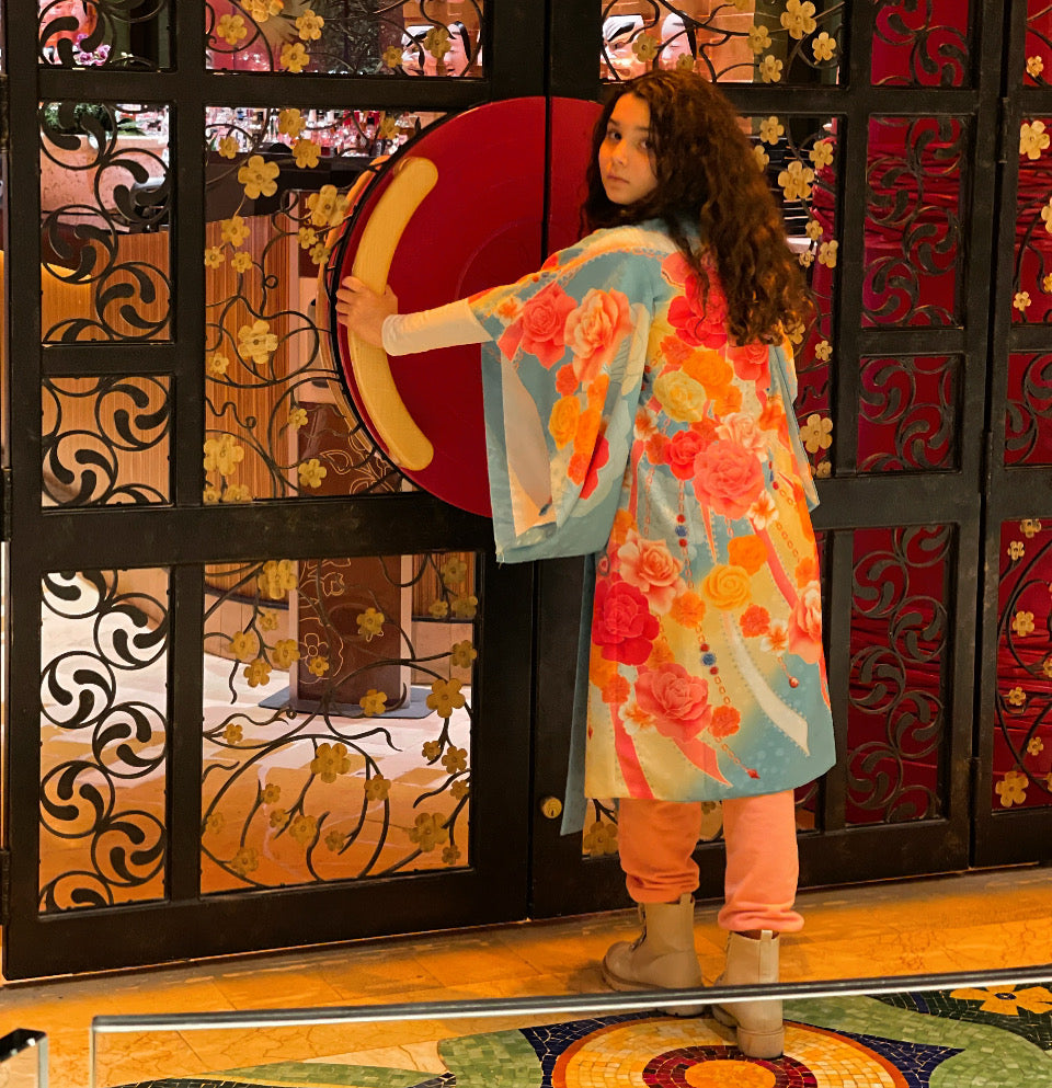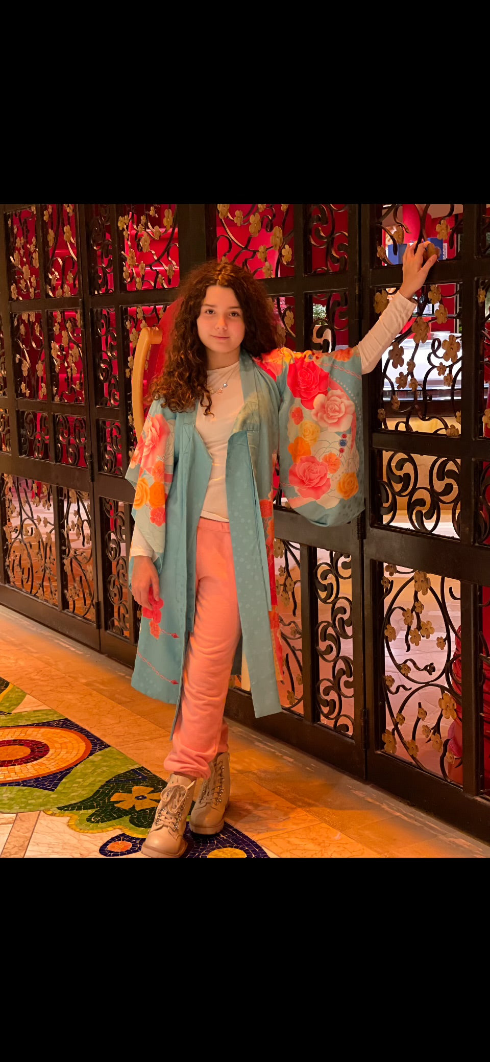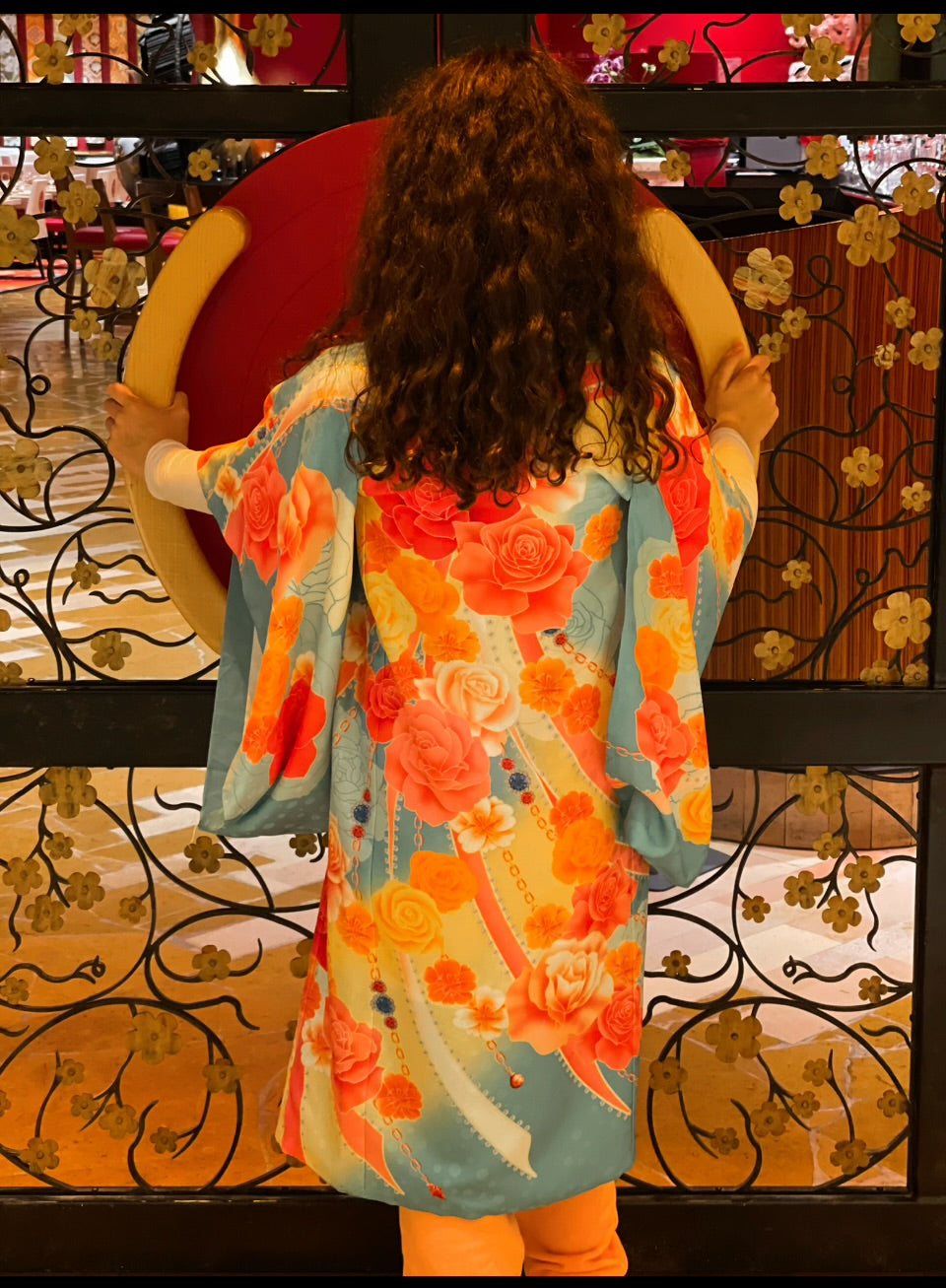 This beautiful pink, coral and turquoise Yukata is made for the girly girl. The print has roses and jewels all over . The butterfly-styled sleeves add additional charm that any little girl will love. This is an authentic Kimono that is made in Japan. This kimono fits size 10-14