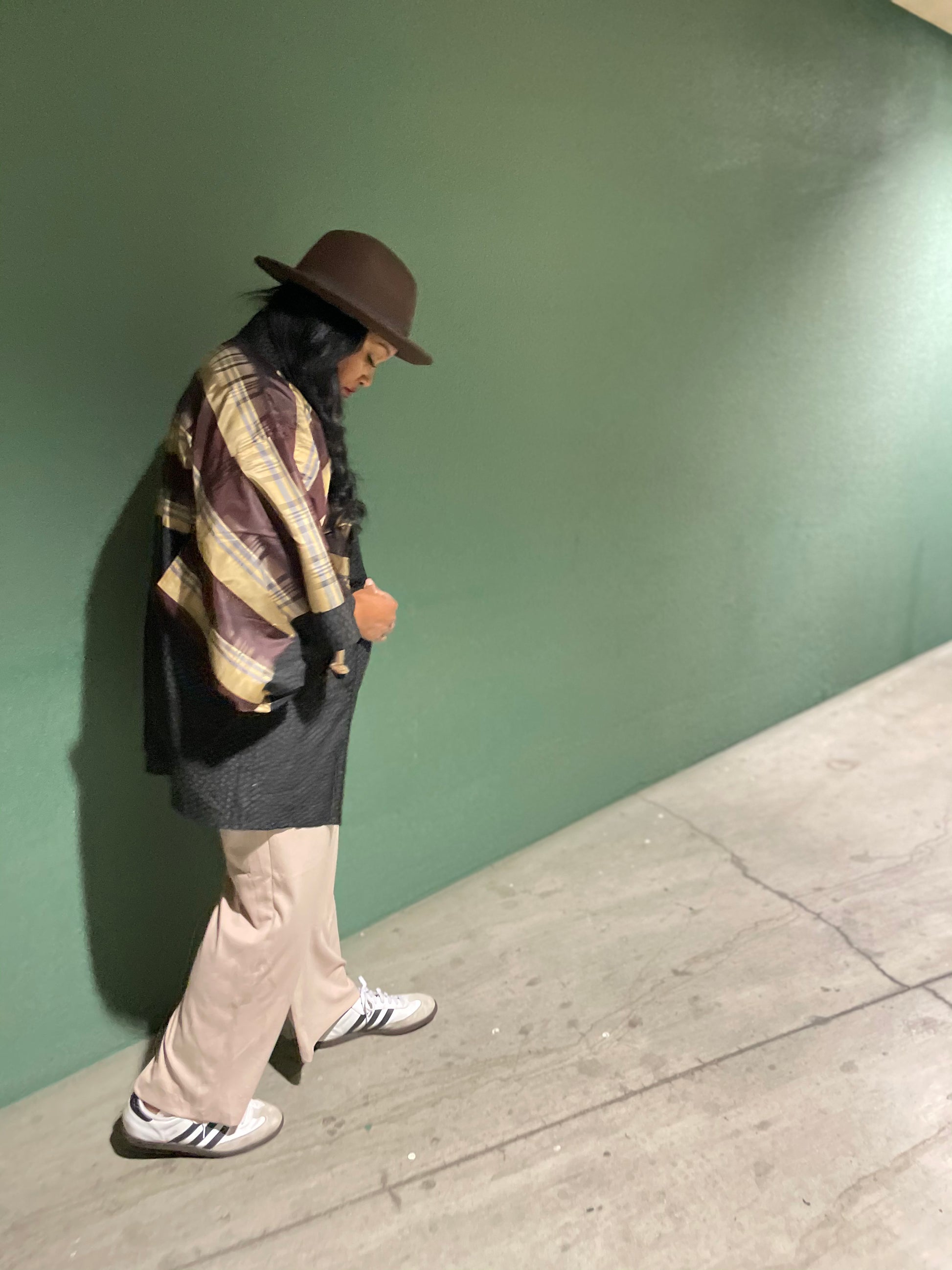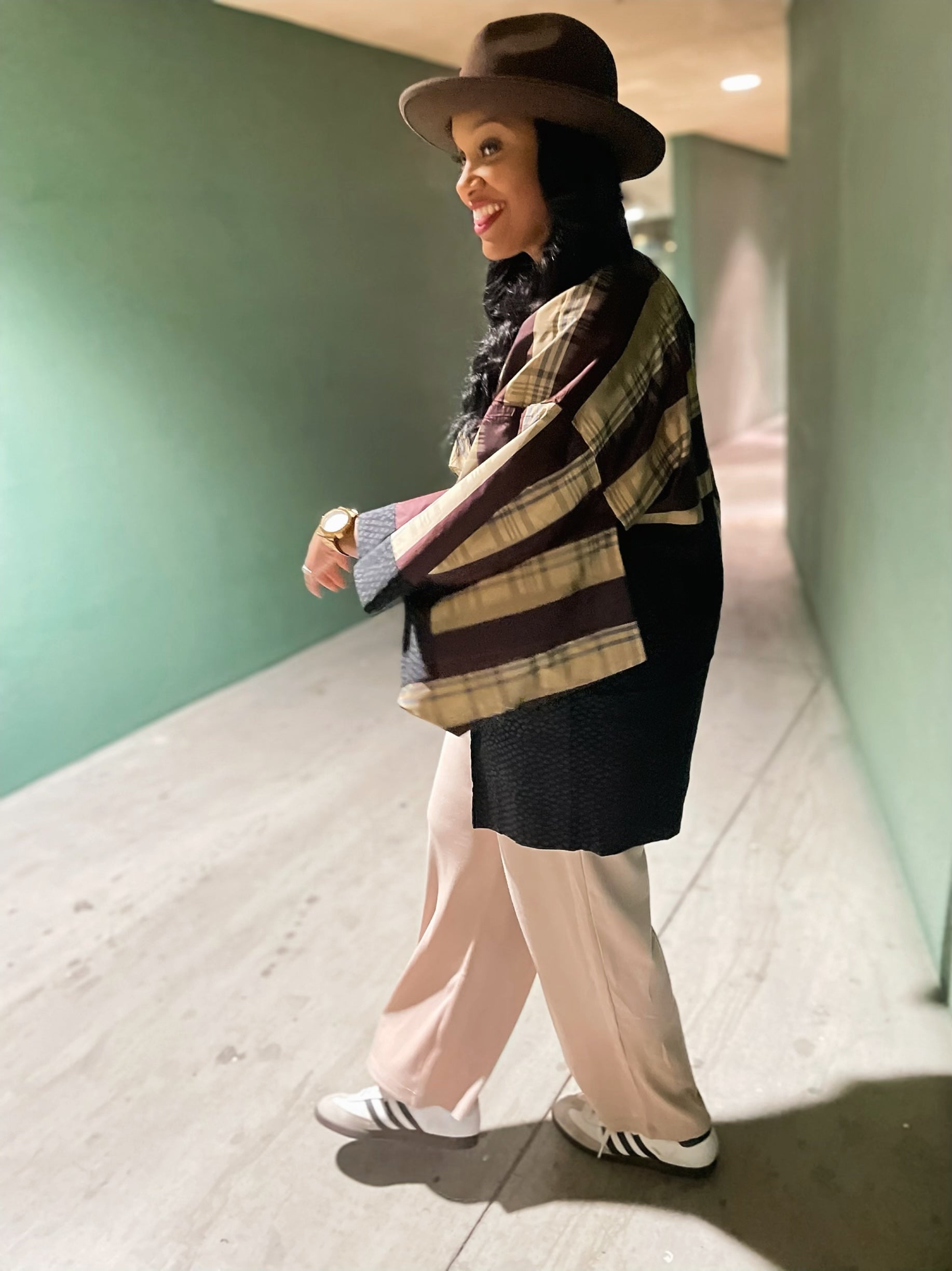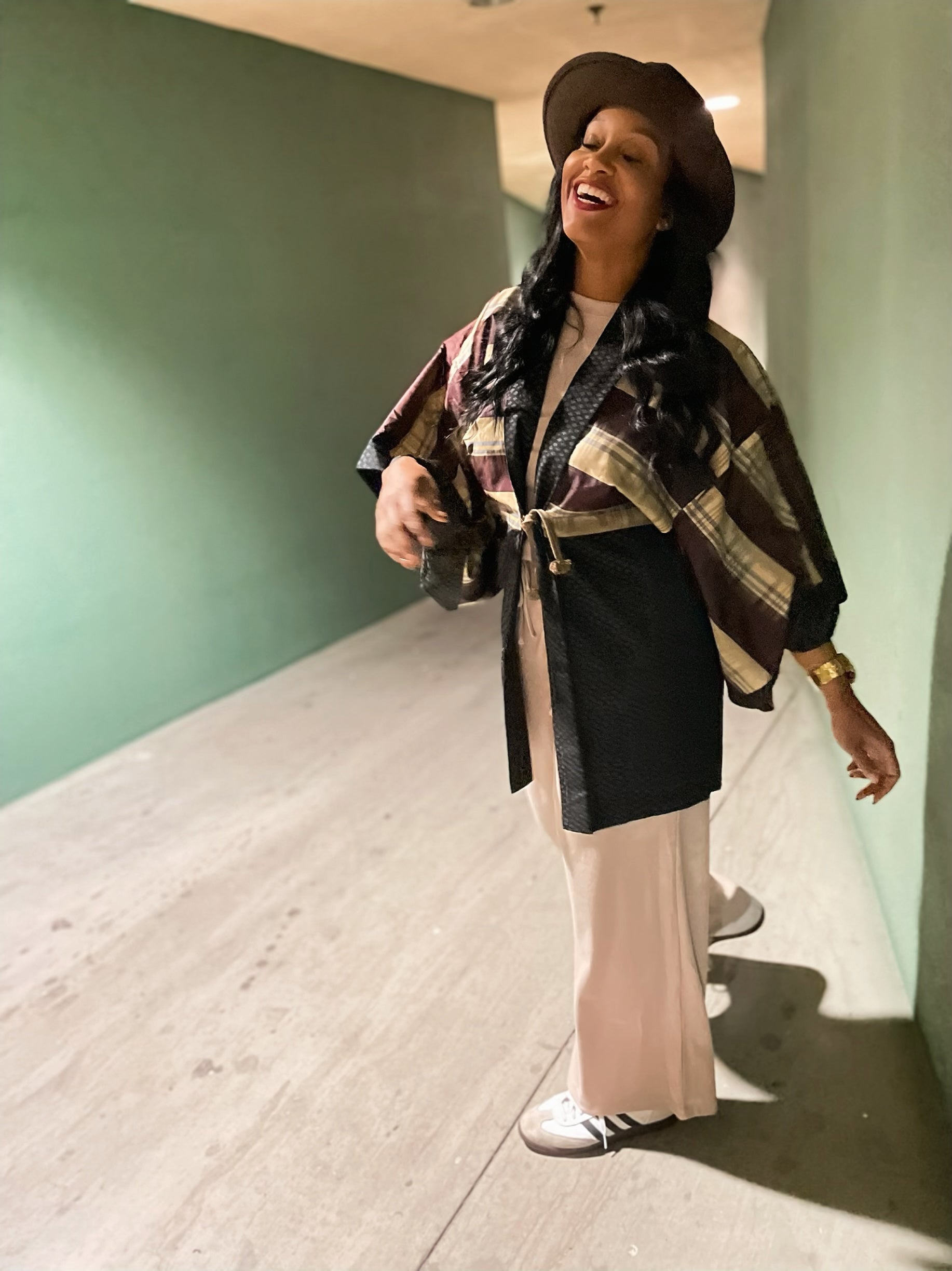 This Kimono is perfect for the woman who doesn’t want the long oversized vibe. The Haori is light weight and can be worn even tucked in. It comes with a waist tie. The lining has a unique print and can be worn reversed. Her vibe reminds me of an oversized mens blazer. I love to pair her with a turtleneck, wide leg pants and a sneaker. Oh and you can't forget a fedora! Use her in the summertime with shorts, crop top, and Birkenstocks.