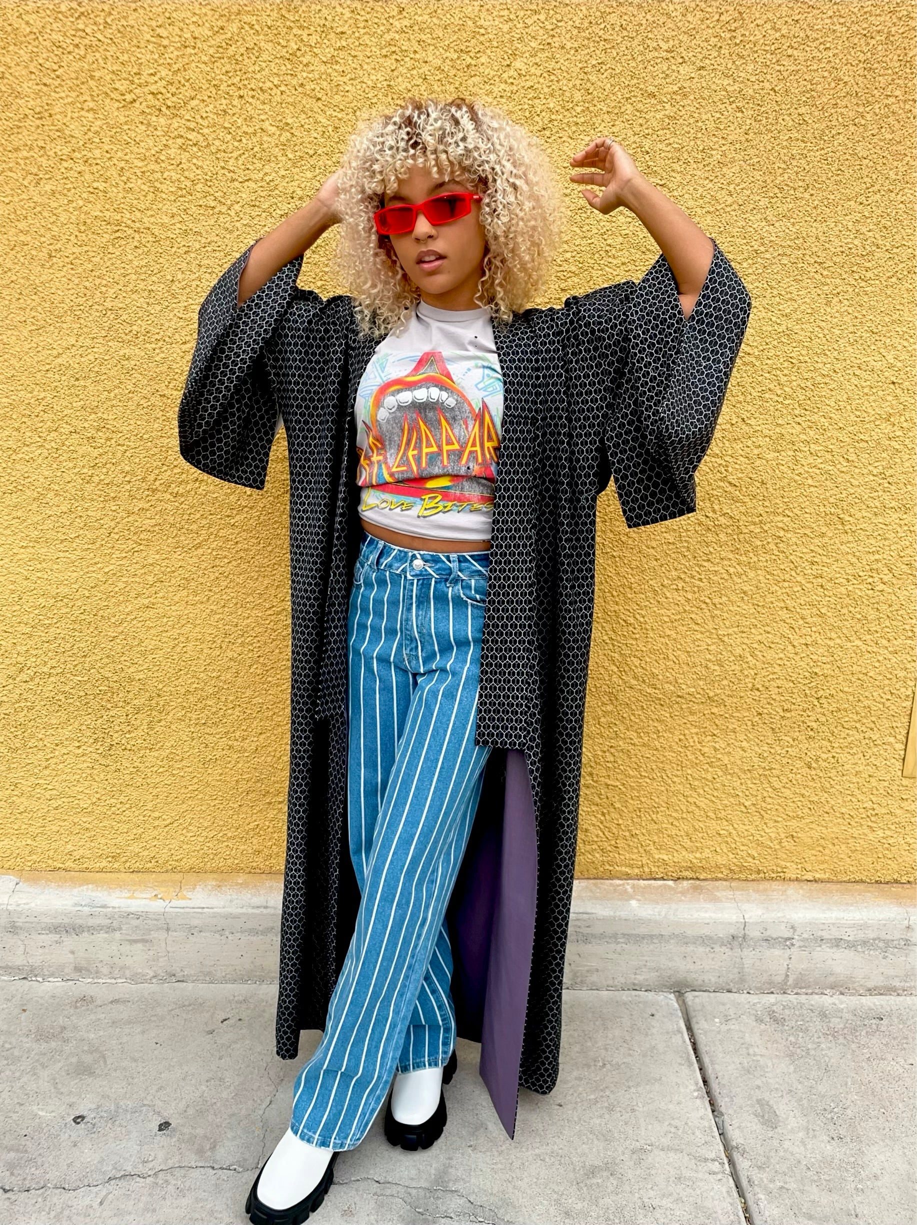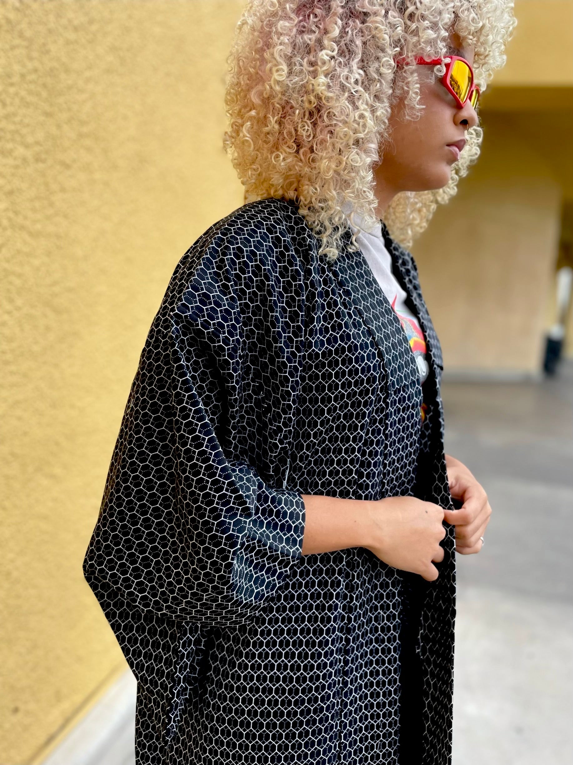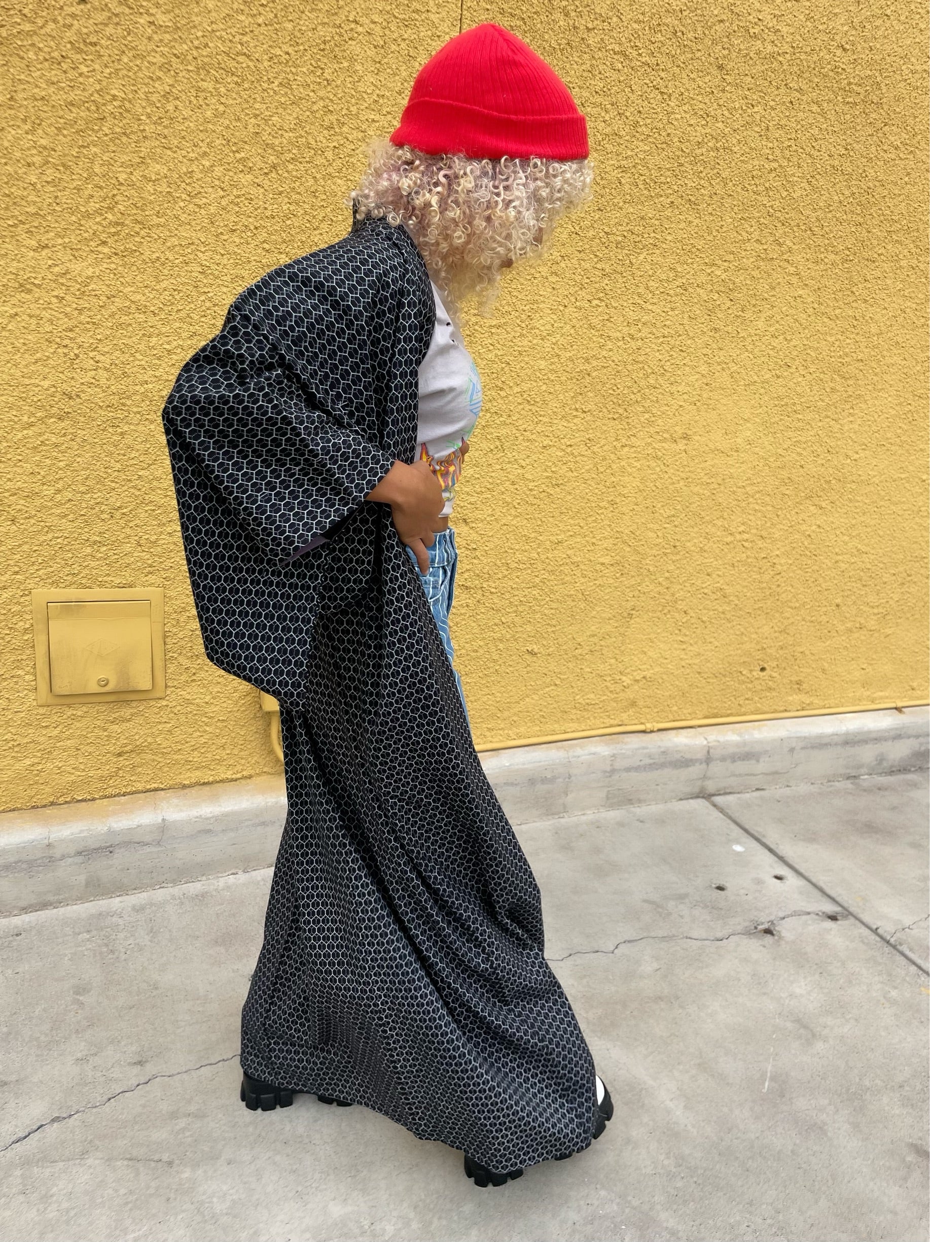 This kimono is hemp material but still flowy. Classy enough where you can wear her at night her as a jacket. This kimono is the perfect length and if you’re shorter than 5’6 you will need to get altered.