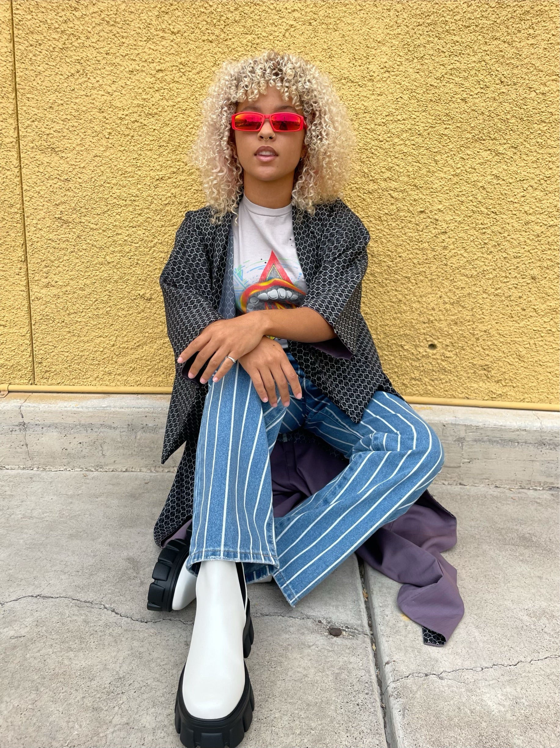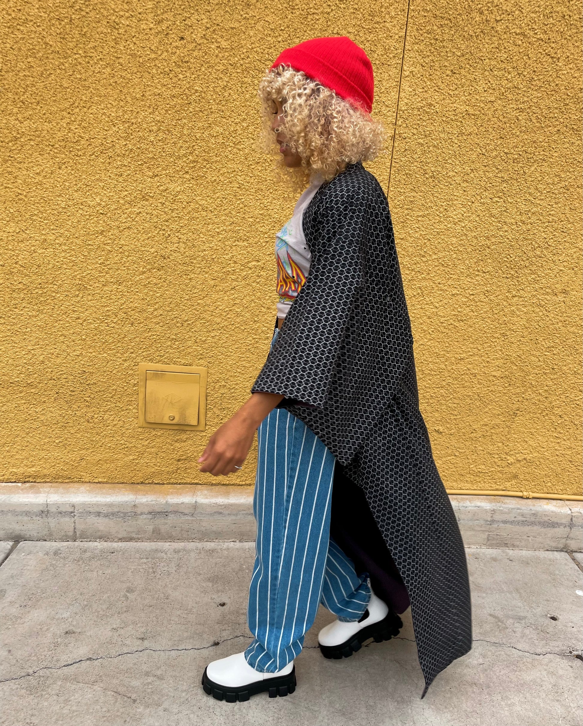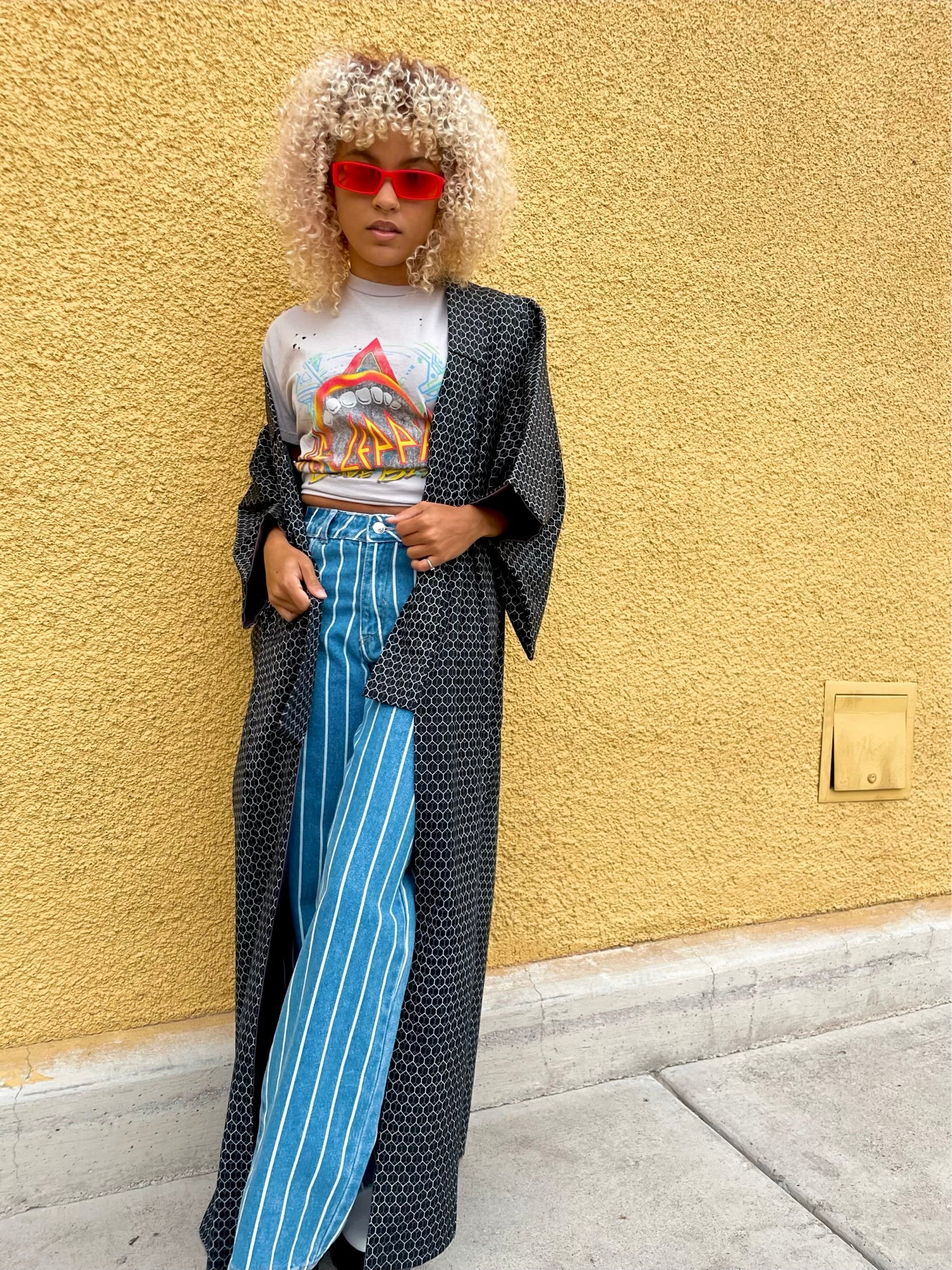 This kimono is hemp material but still flowy. Classy enough where you can wear her at night her as a jacket. This kimono is the perfect length and if you’re shorter than 5’6 you will need to get altered.