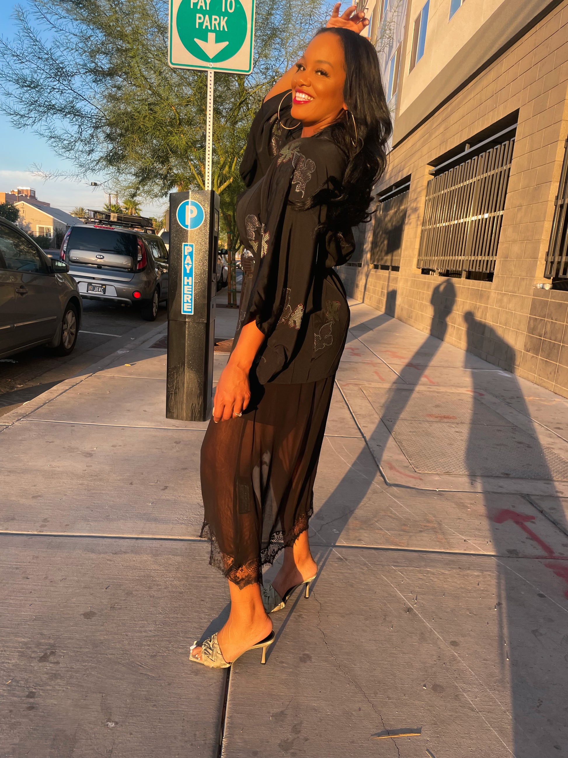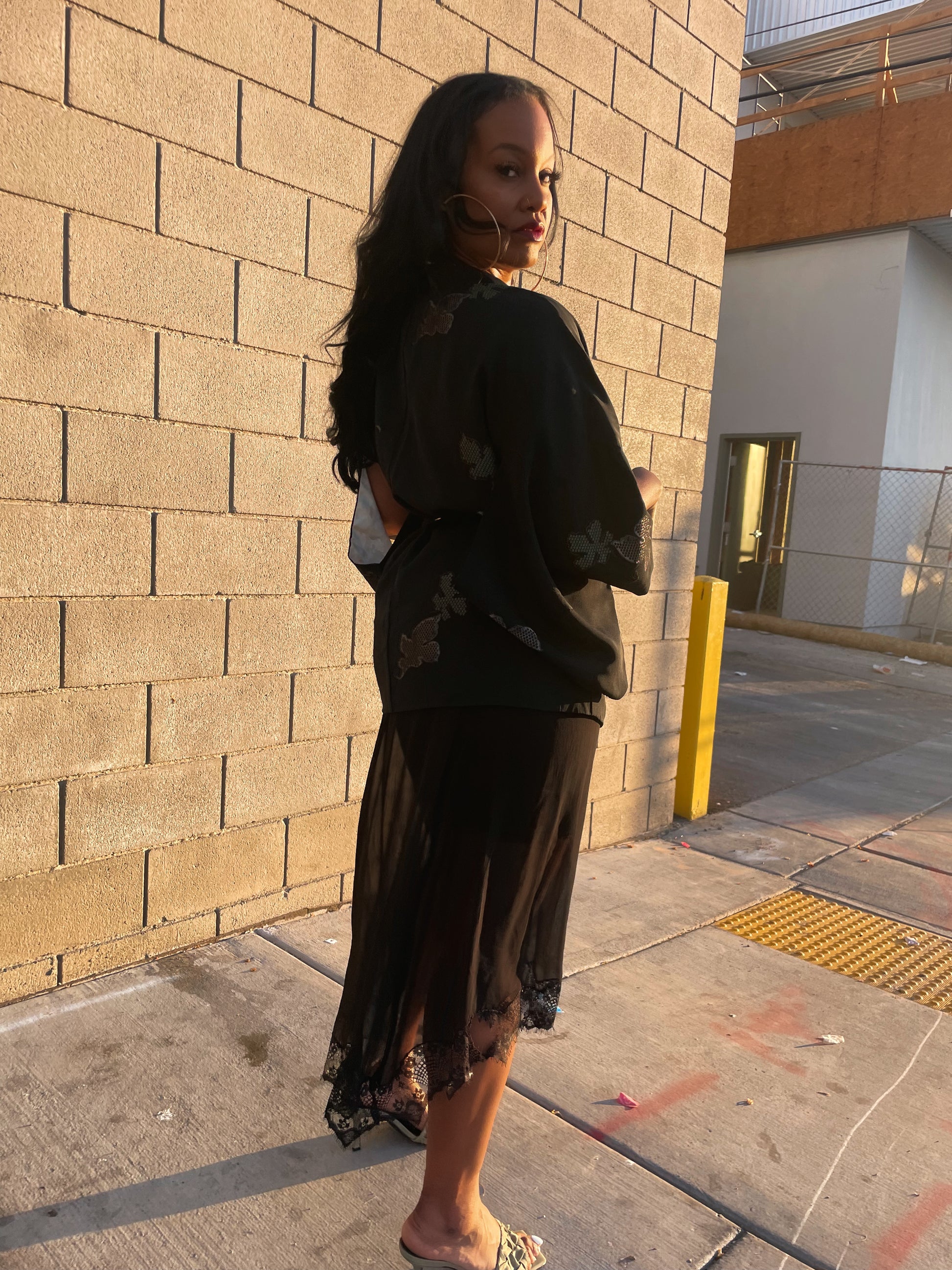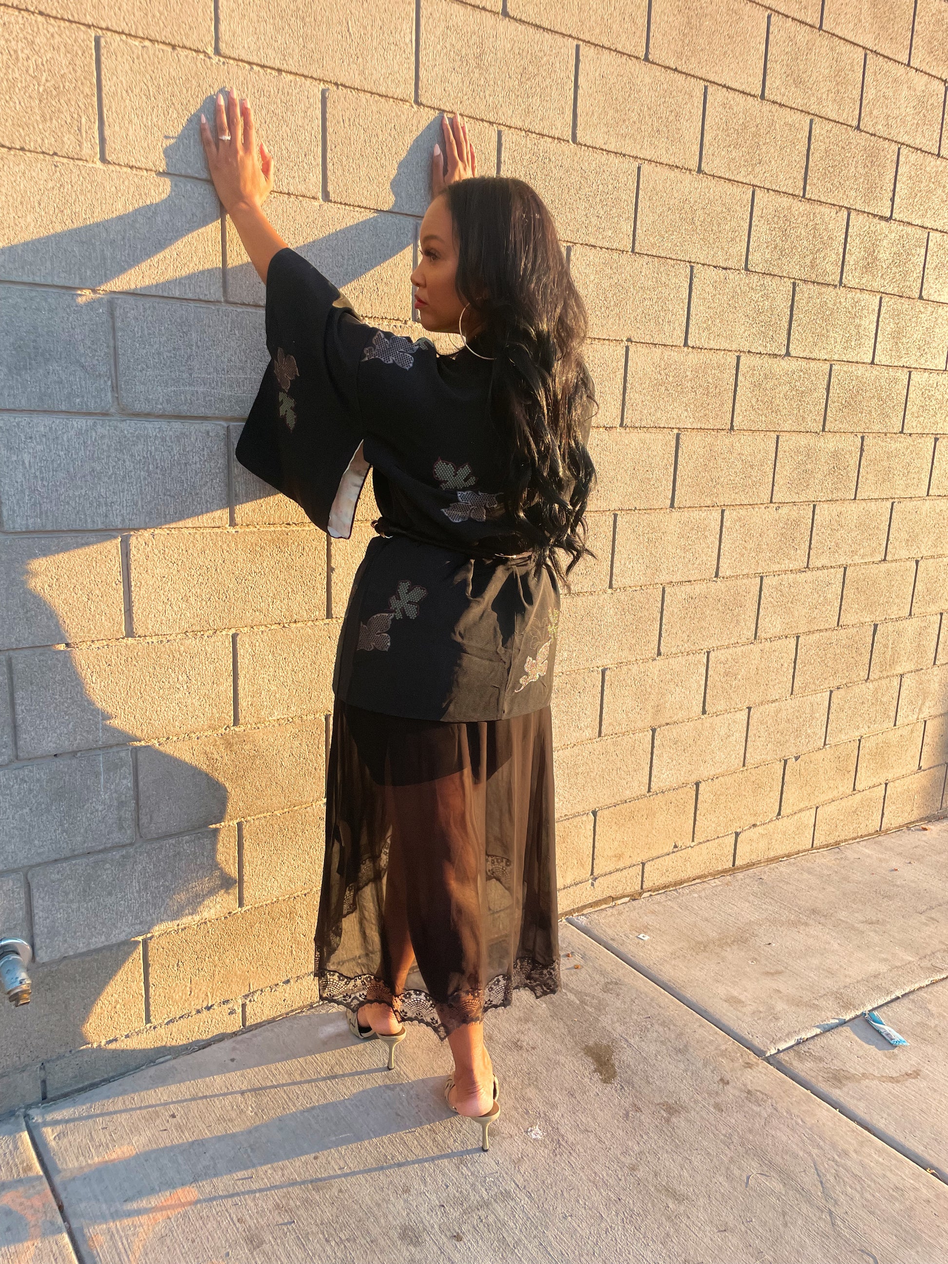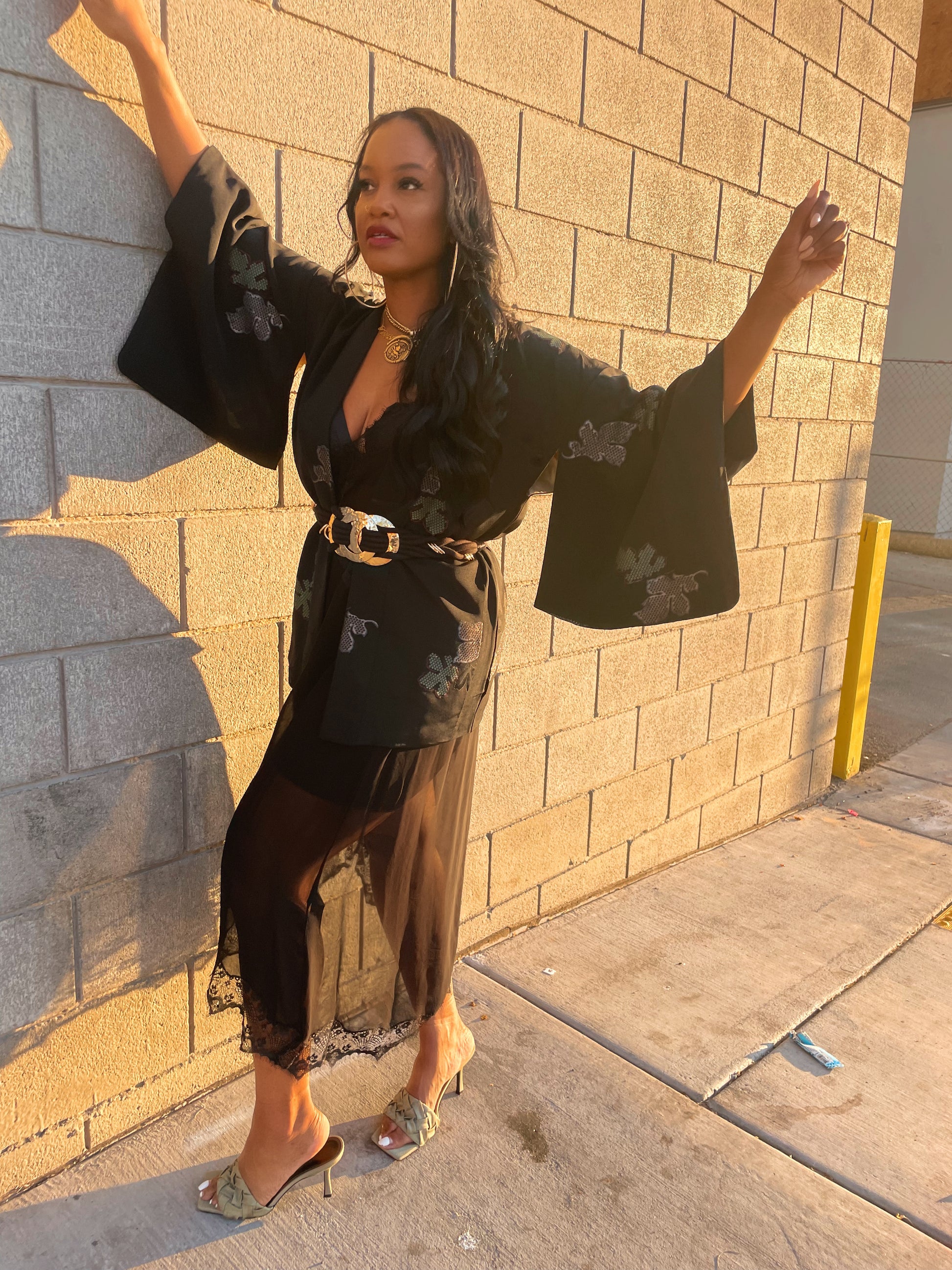 I love the metallic color on this Haori. If you love a vibrant statement piece this is the one for you. This mix of black, gold and silver is the color for this season . This piece paired with a solid jumpsuit or solid color pants is effortless. Belt your waist to accentuate your curves. Add a sneaker or heel.