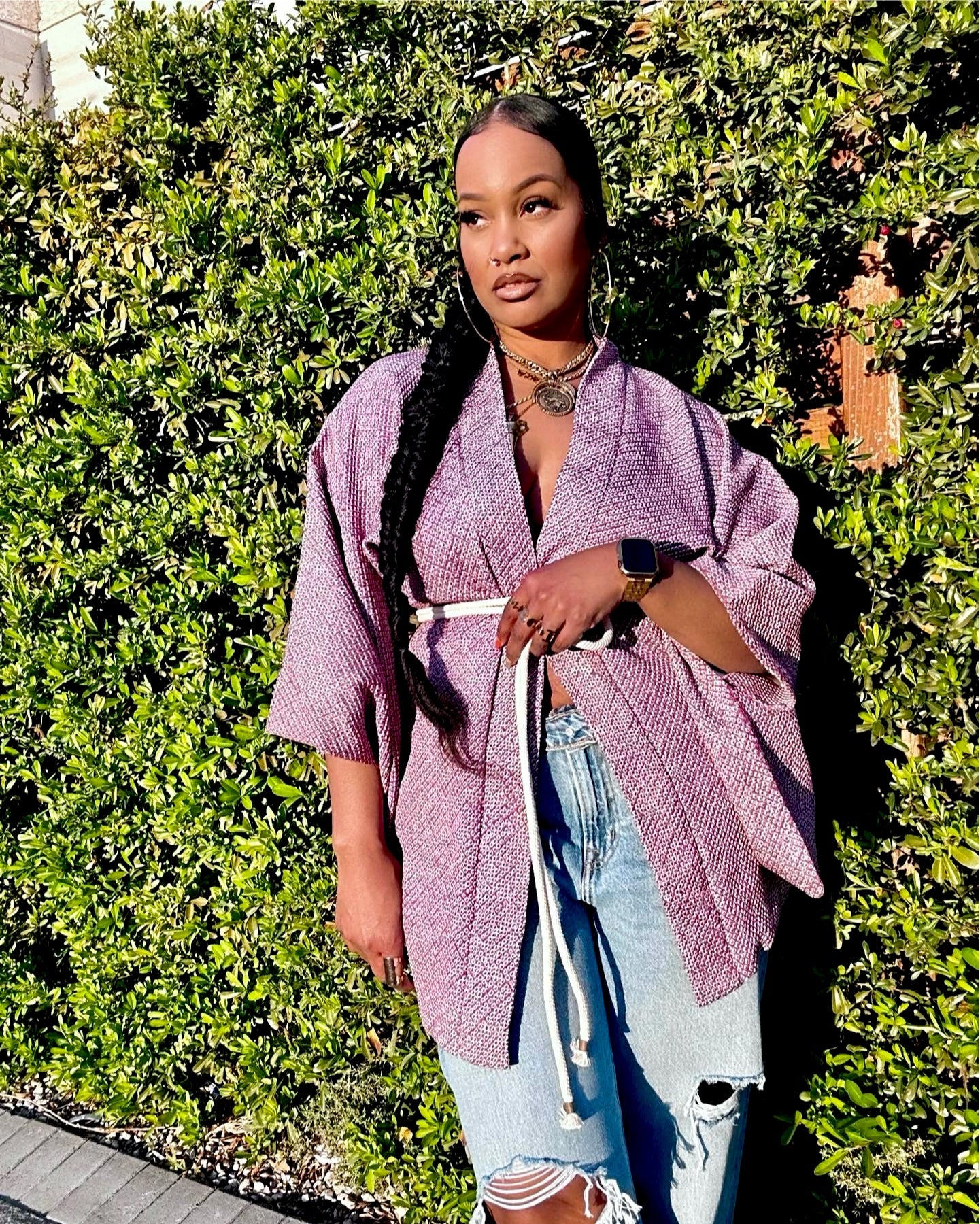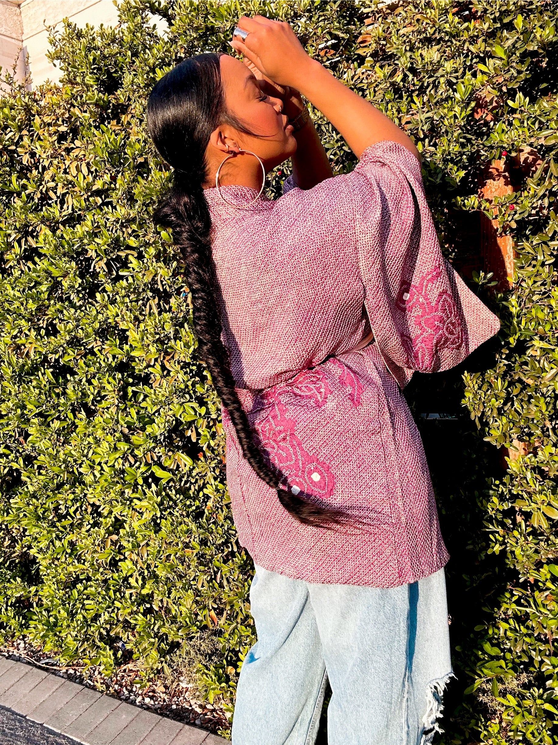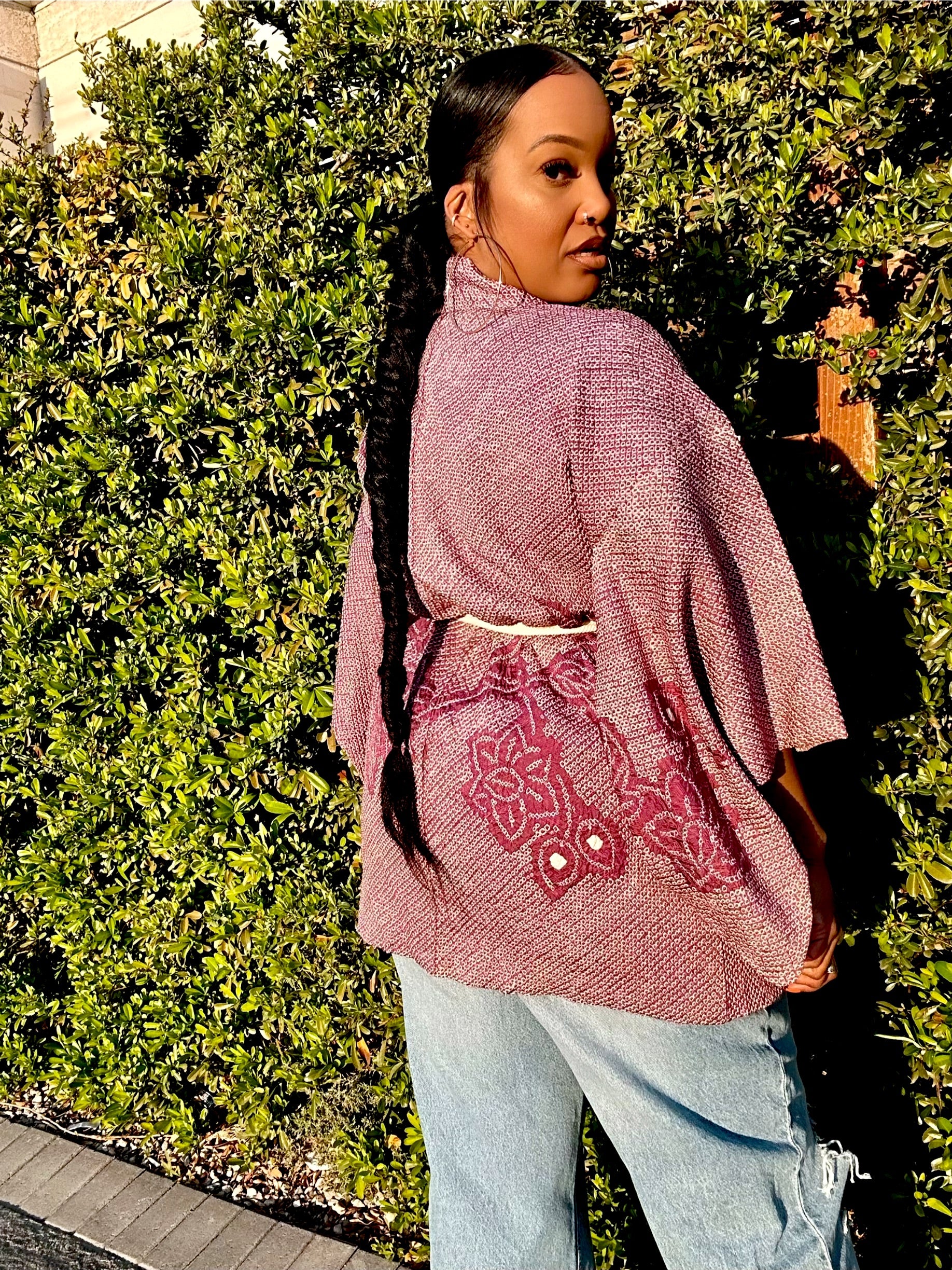 The kimono’s short haori design allows it to be perfectly paired with anything a closet has to offer. The vintage piece is a stunning combination of fun, comfort, and elegance with its loosely draped shape and large open sleeves.