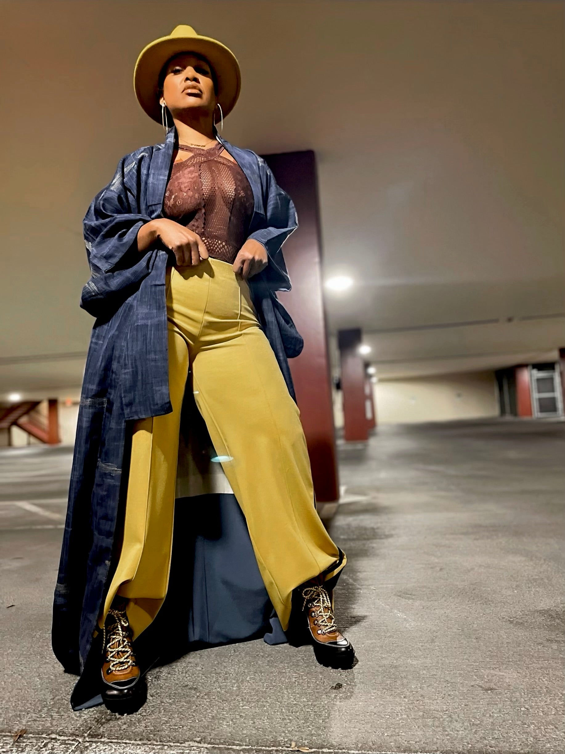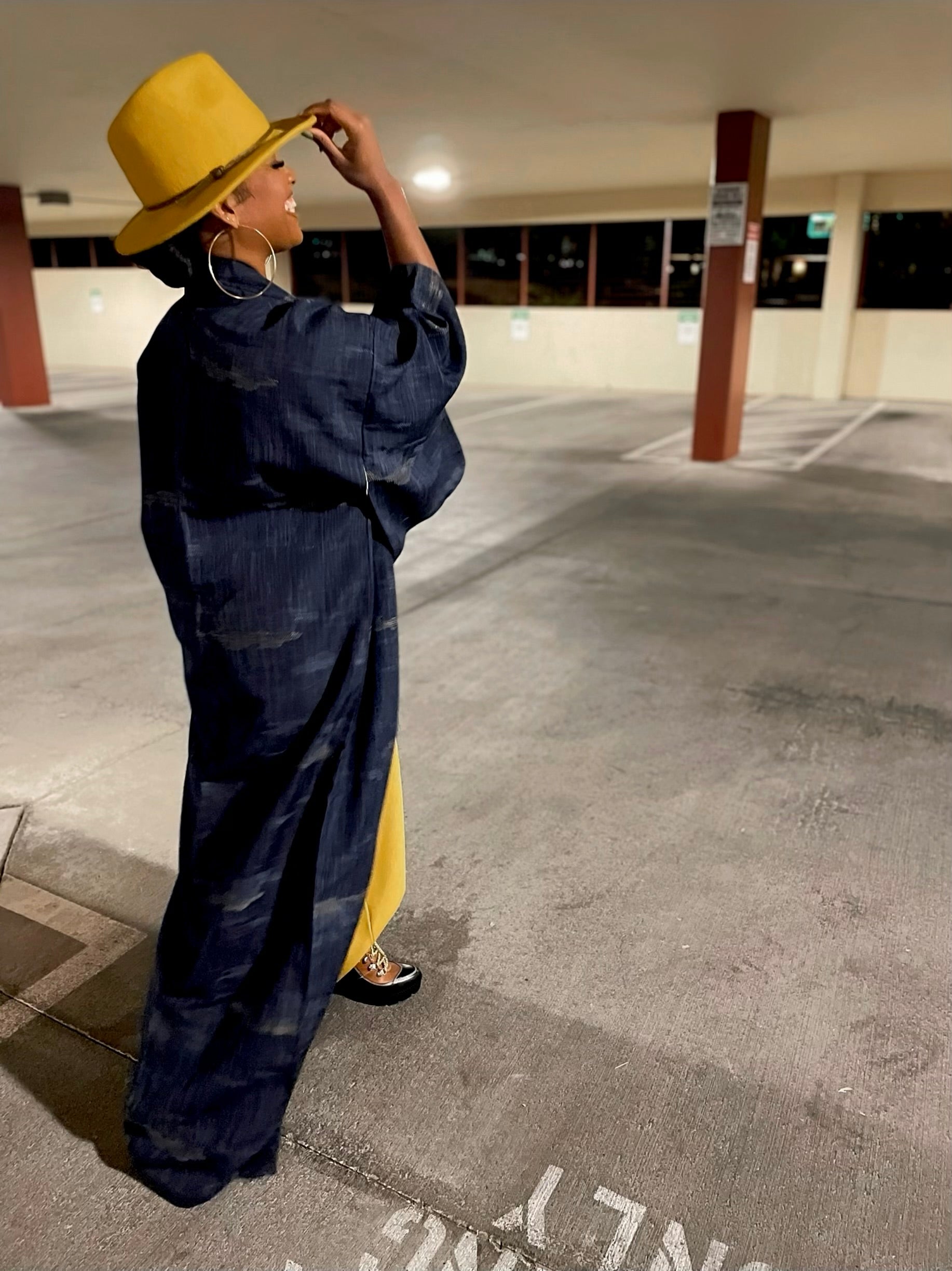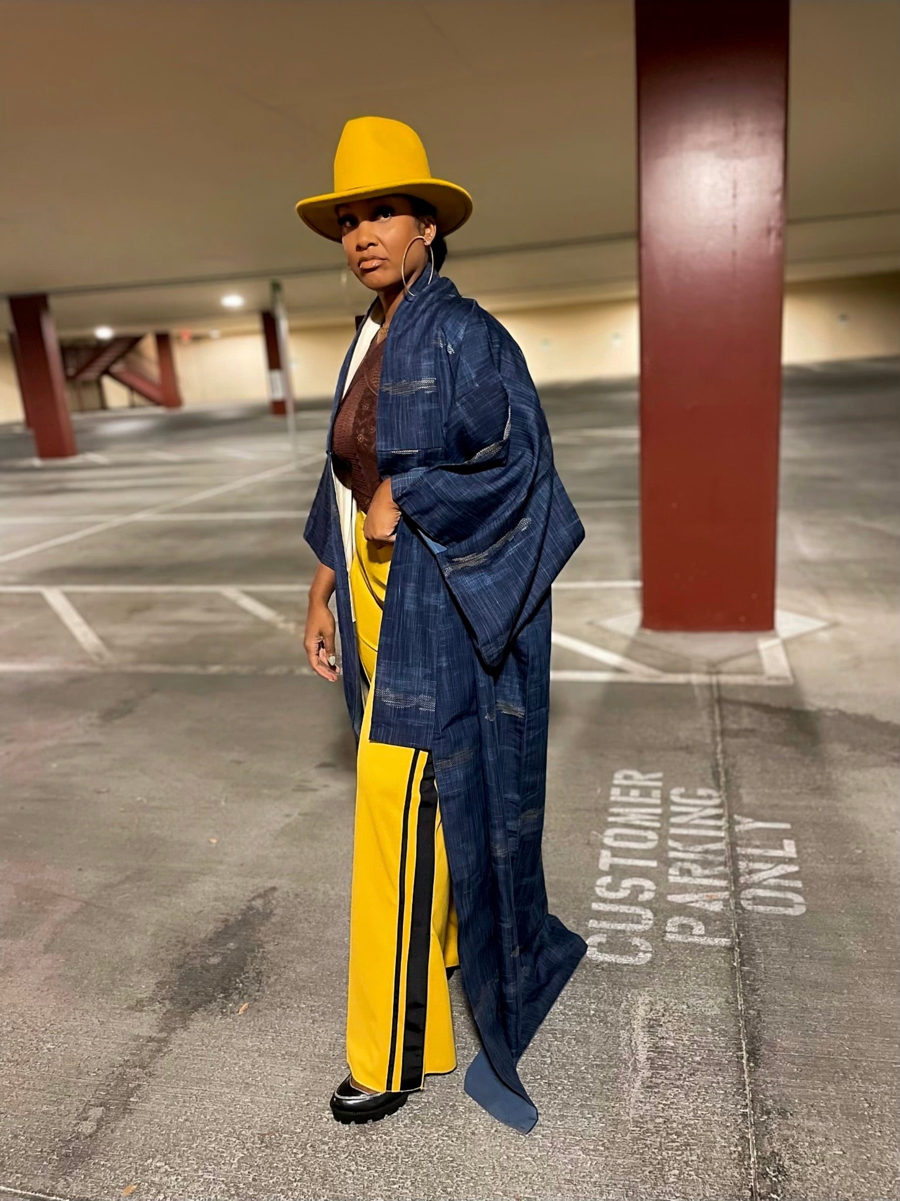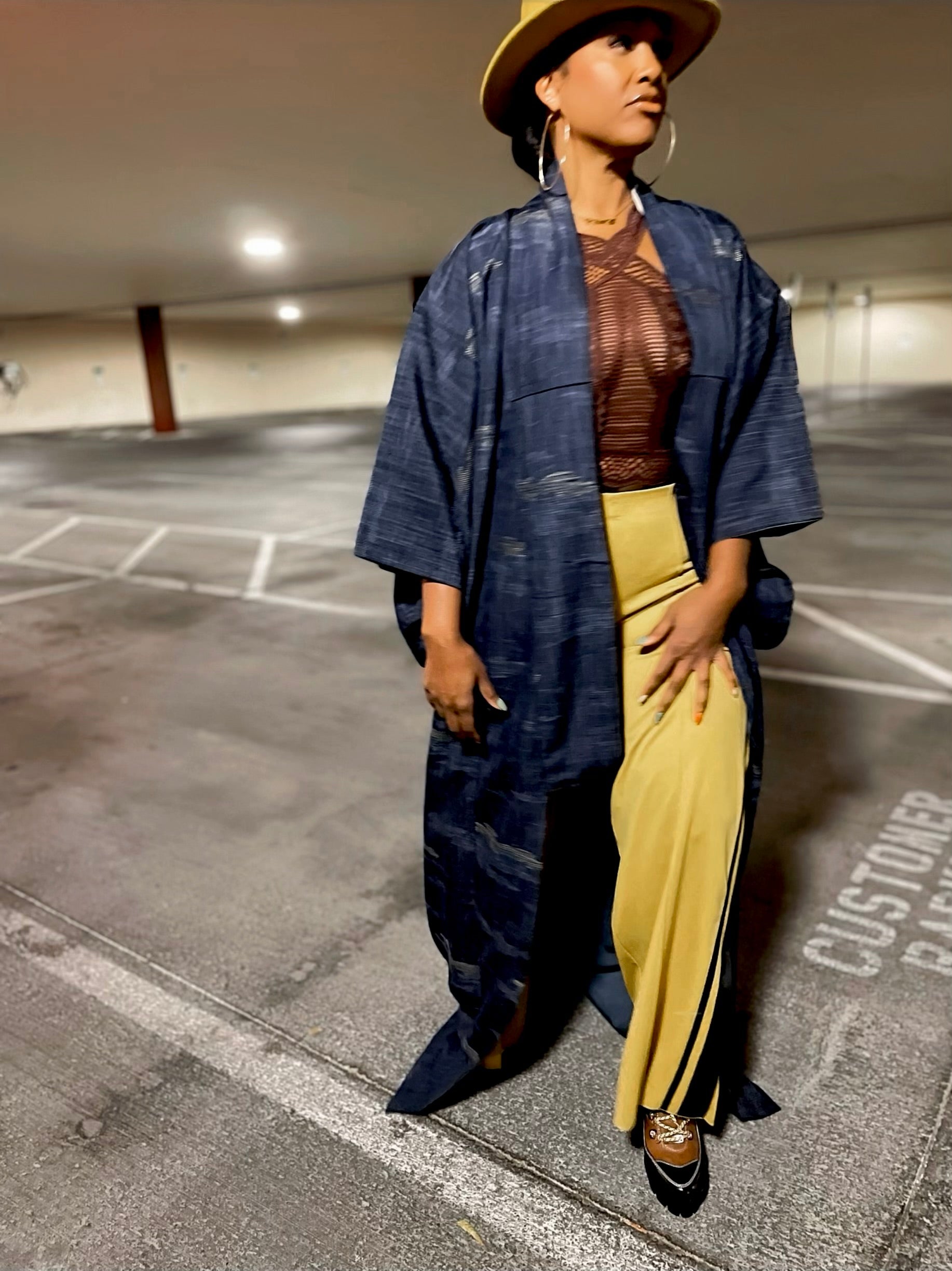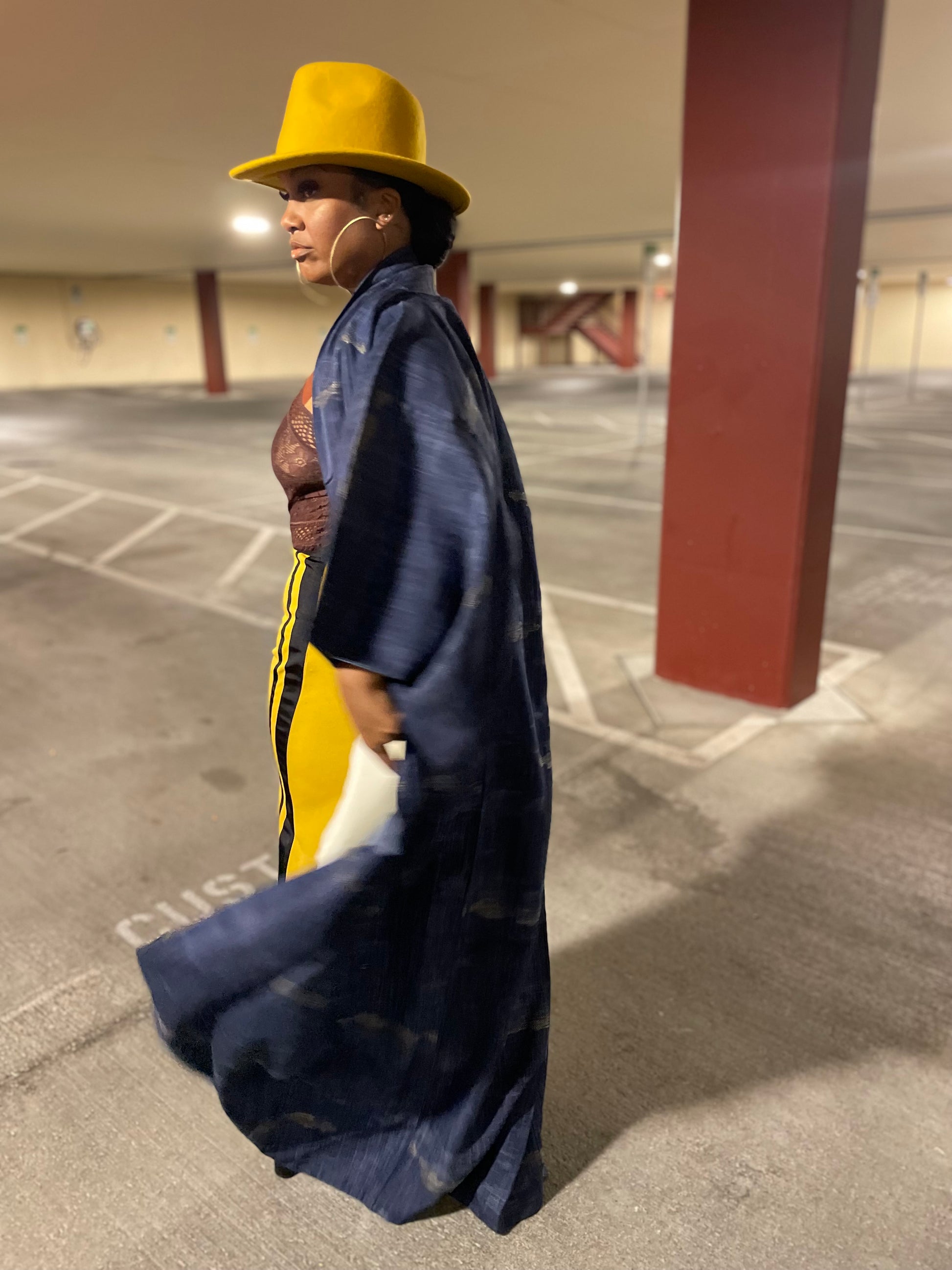 This beauty almost didn’t make it to the website! She is a navy and looks like denim. This beauty has Tan lines thru out the material. This kimono is heavy enough to wear as a winter coat. I love her dressed up and dressed casual as pictured. Metallic accessories will compliment this Kimono 👘. She is heavy and full of Style! This beauty is definitely a statement piece. This piece is also very long and oversized .