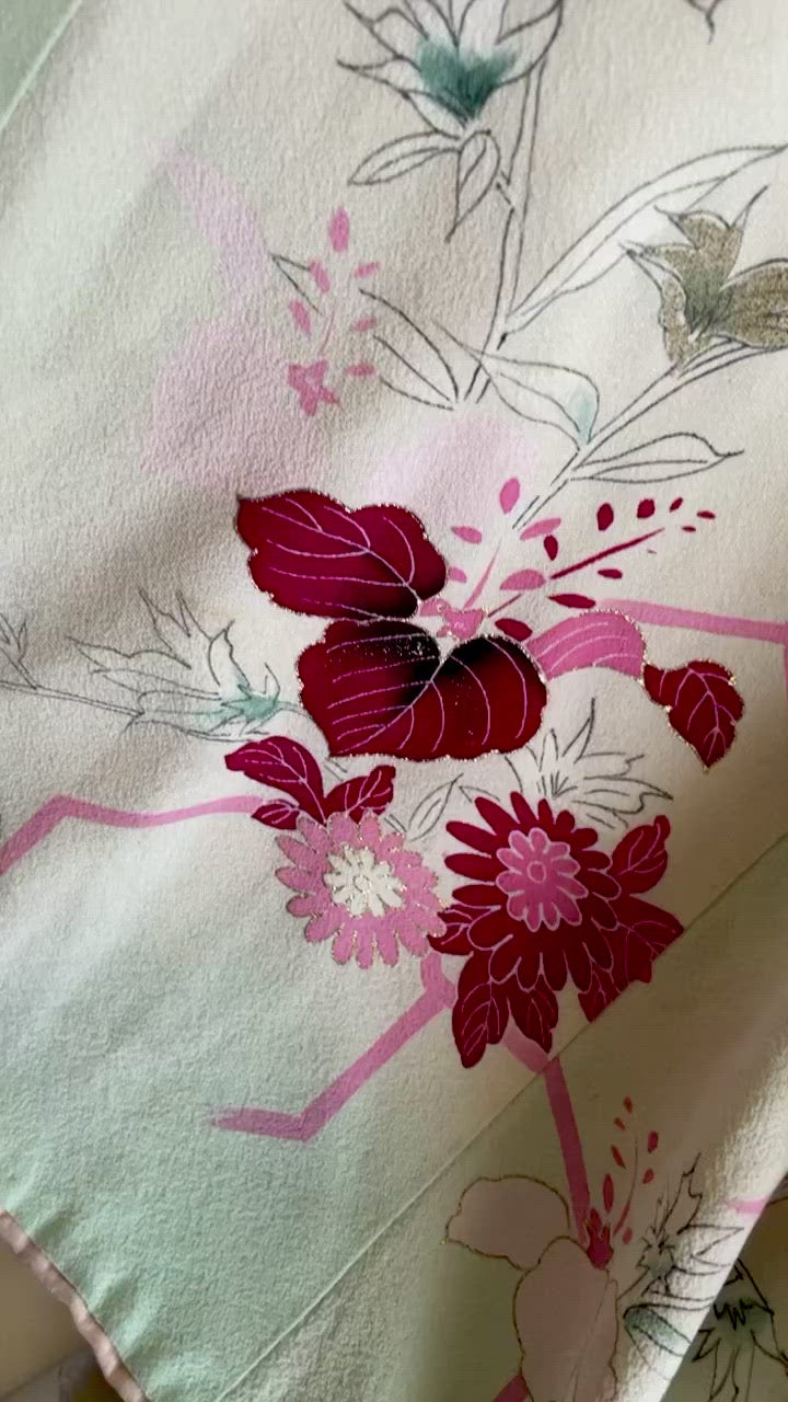 This beautiful mint green color vintage Kimono with a floral print . This beauty can be worn going out or just for lounging. This color looks amazing with greens, beige, and other brown tones.