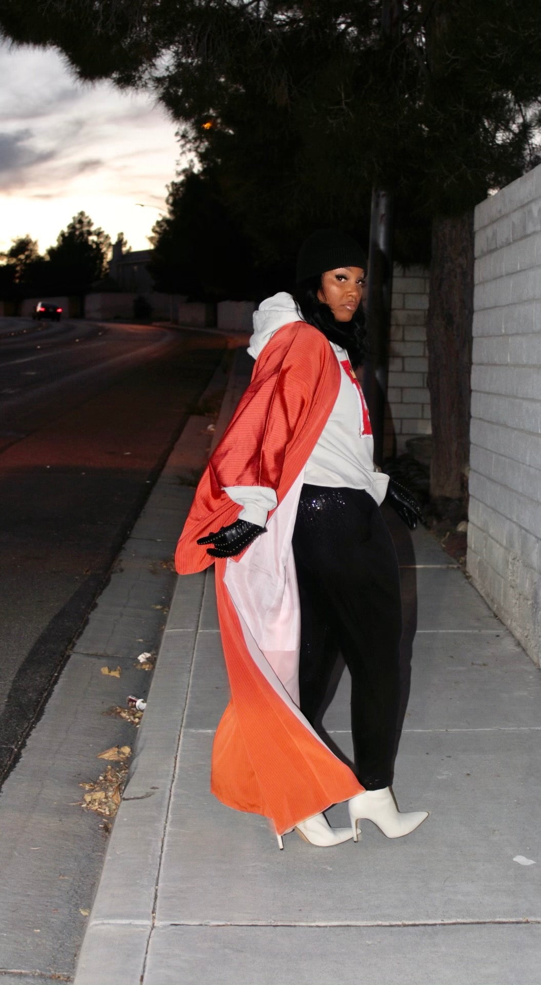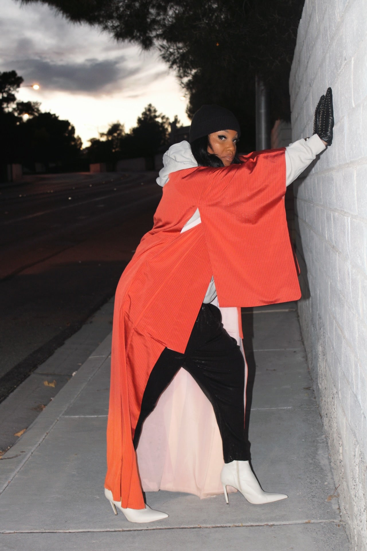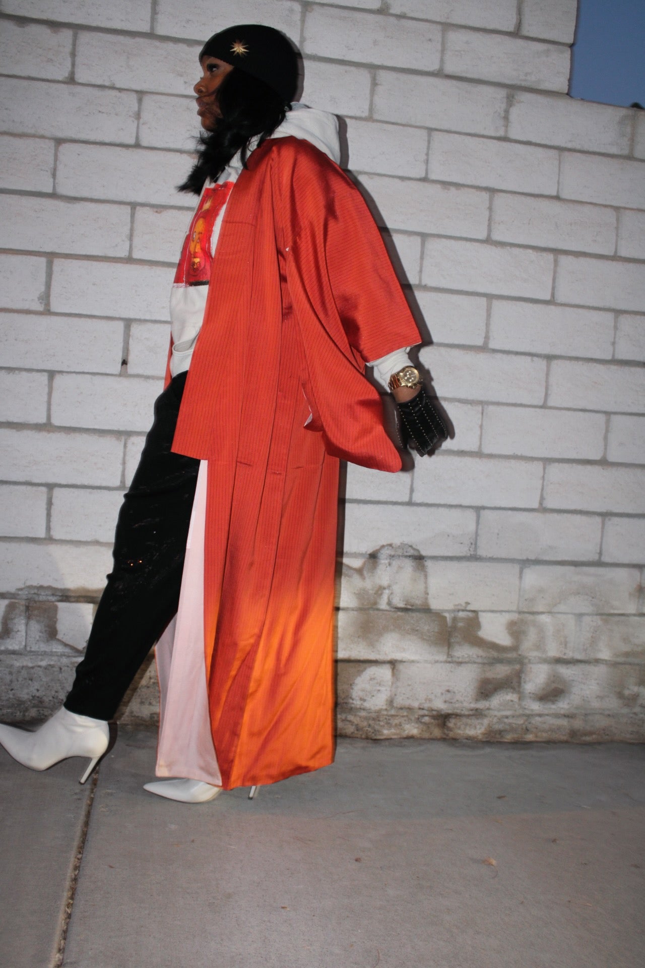 This Kimono name speaks for itself. She is a showstopper. This beauty is bright and Flowy . I loved rocking her as a layering piece over a hoody and sequin pants. This piece is so long you will definitely have to get her altered if you are 5”7 or shorter.