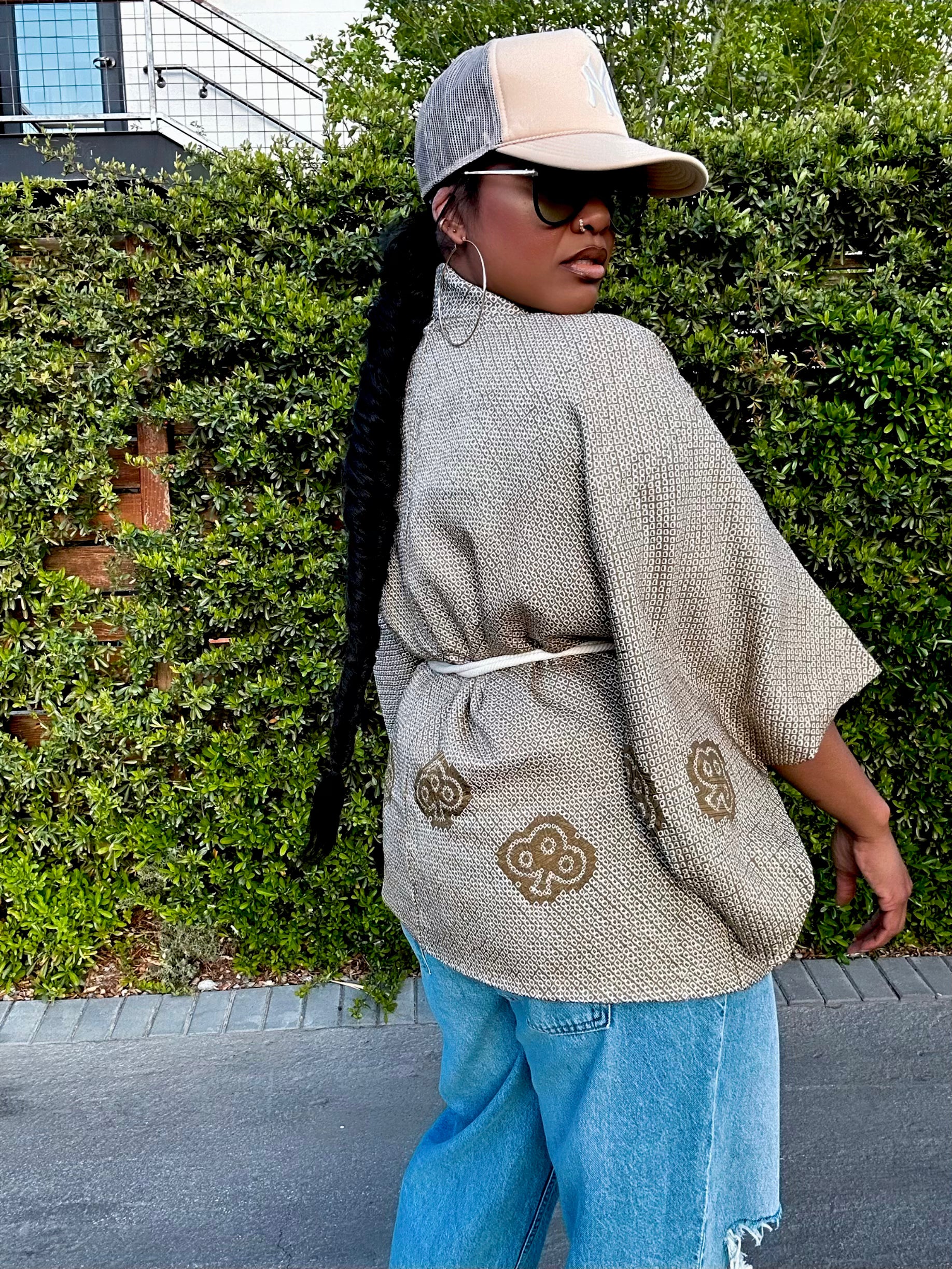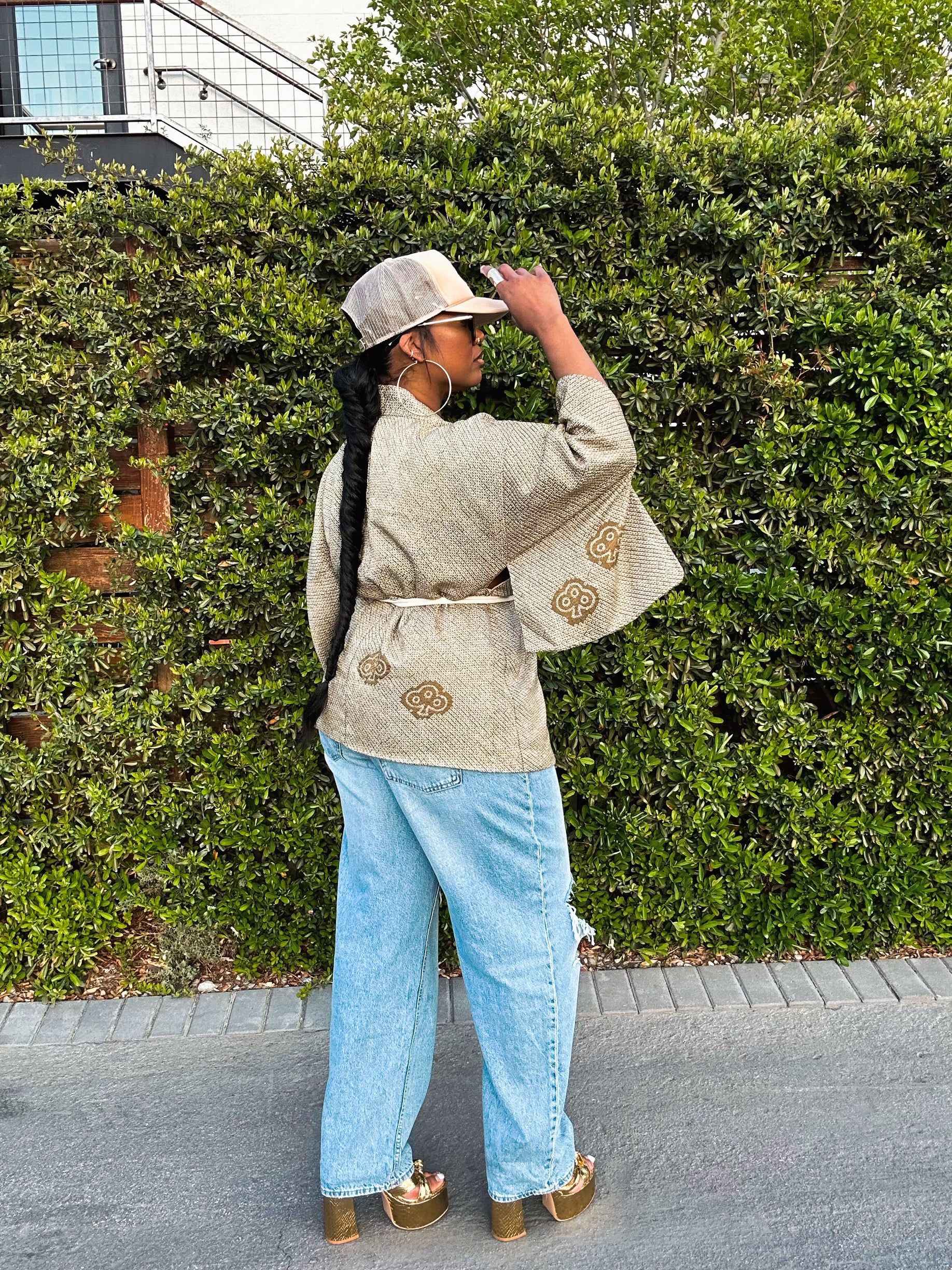 The kimono’s short haori design allows it to be perfectly paired with anything a closet has to offer. The vintage piece is a stunning combination of fun, comfort, and elegance with its loosely draped shape and large open sleeves.
