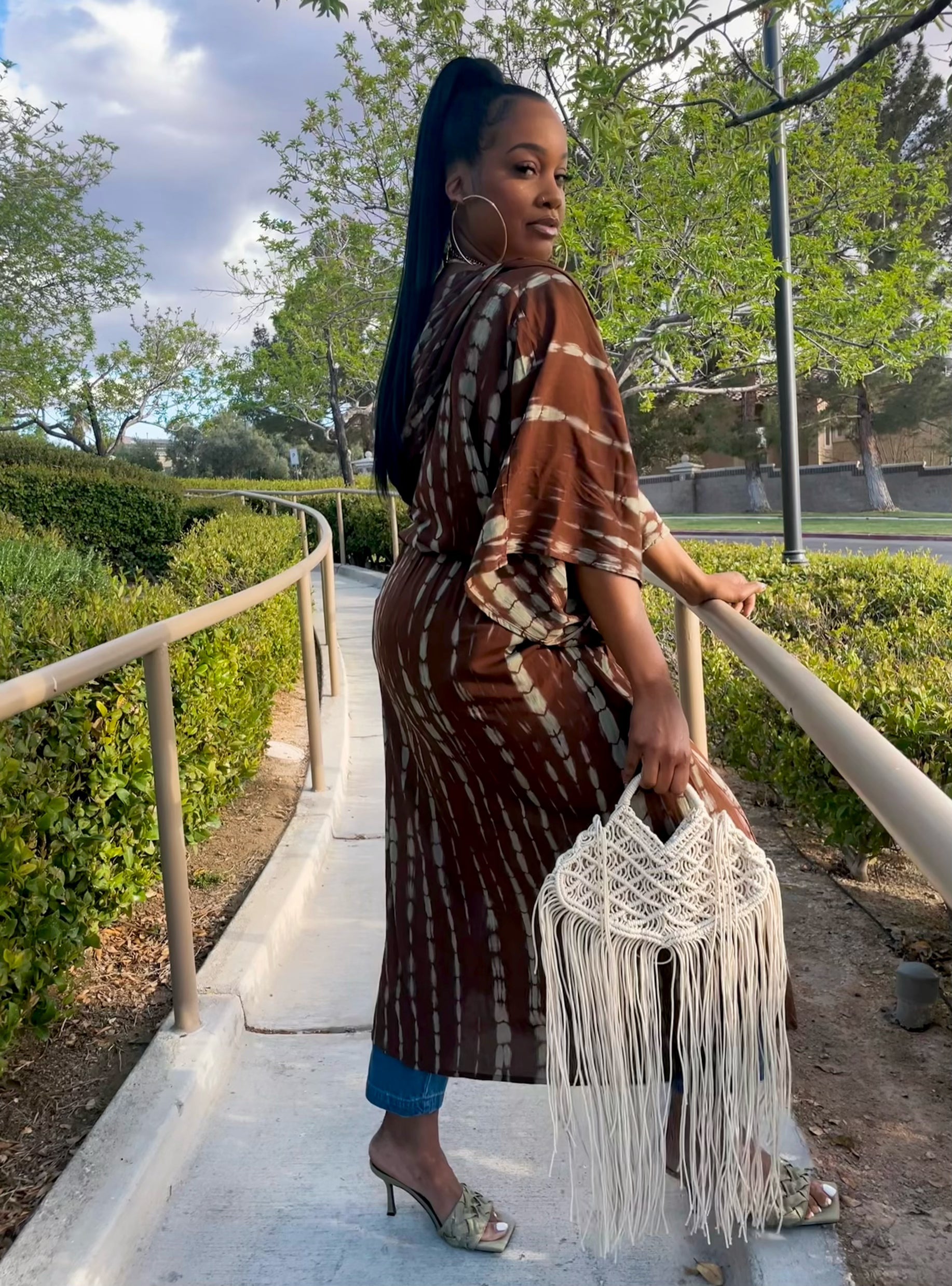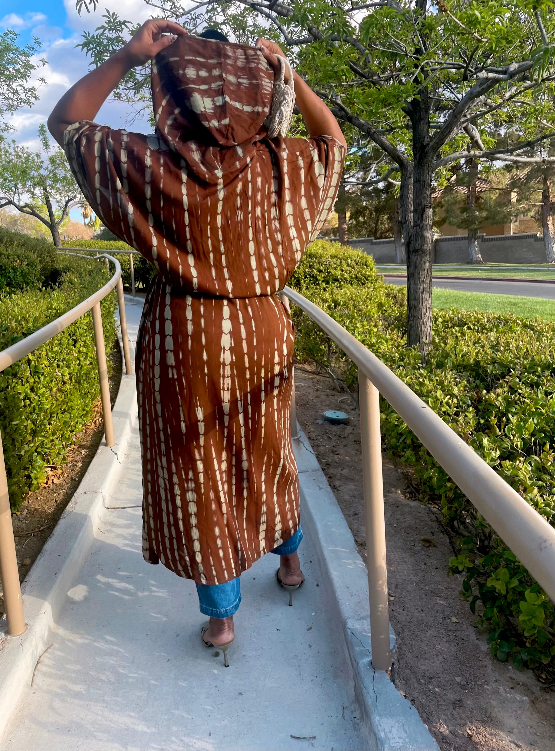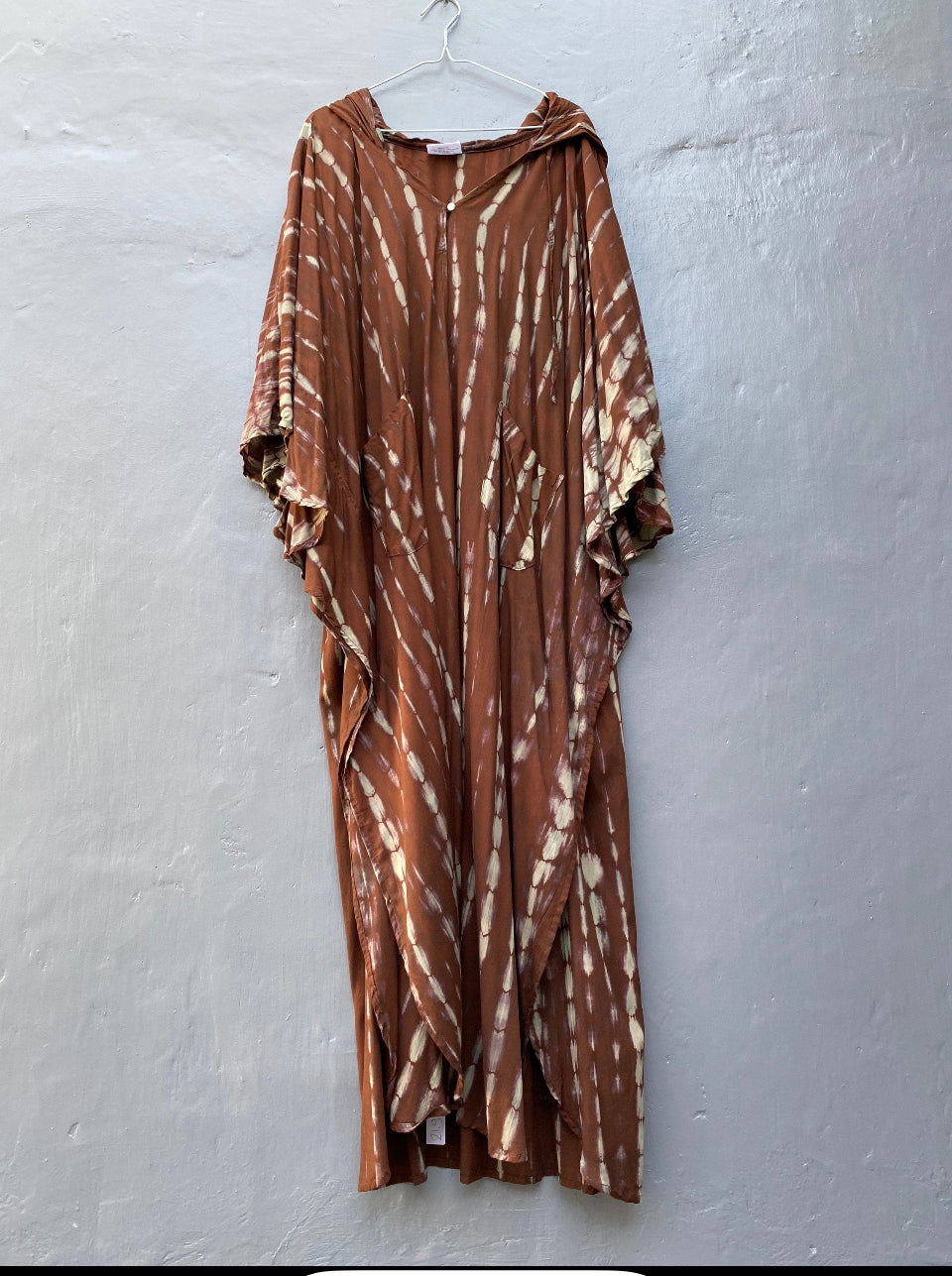 This hooded poncho is made out from soft and light rayon . You can also wrap the sleeves around your neck and wear it as scarf or bathing suit cover up.