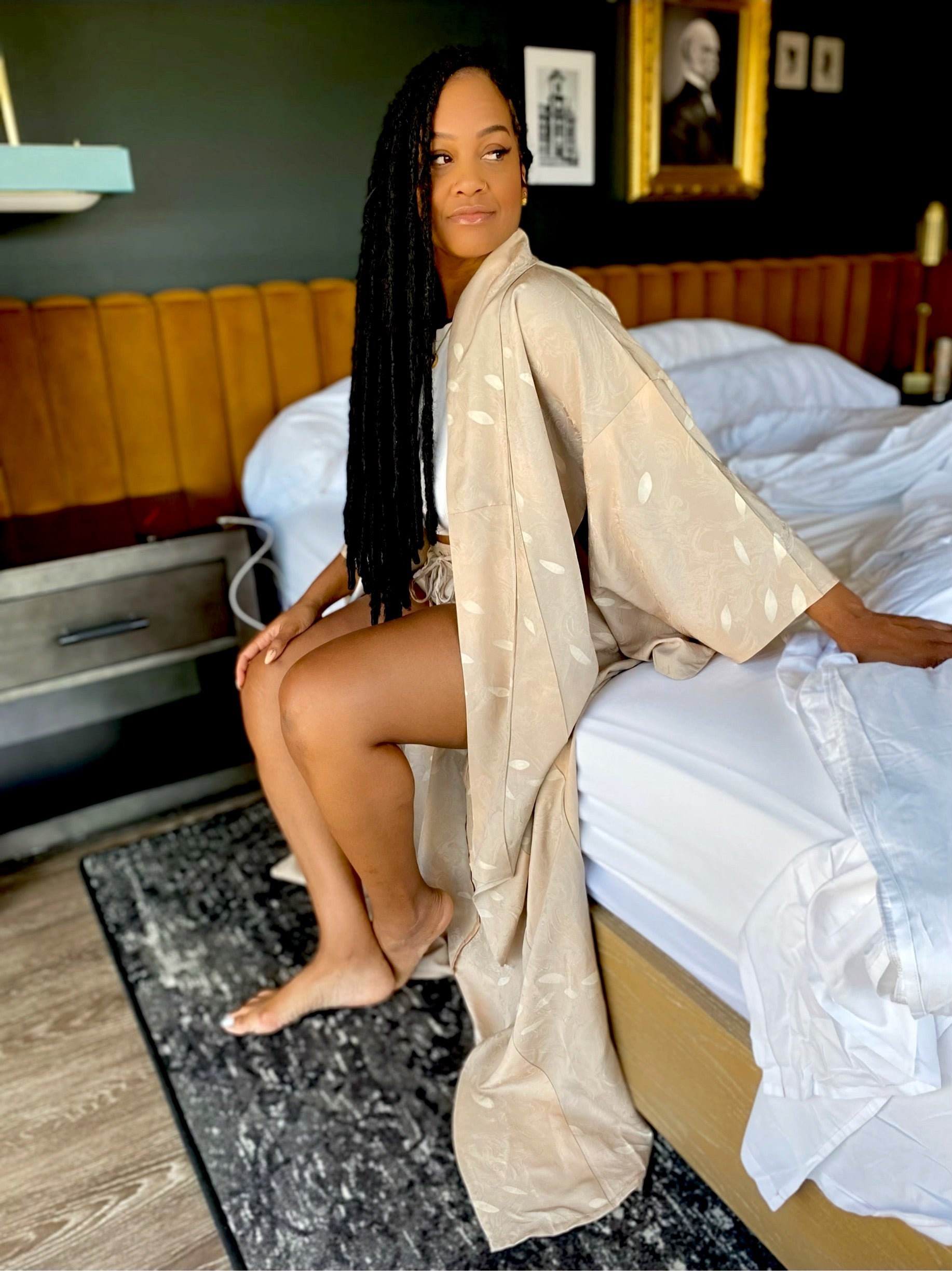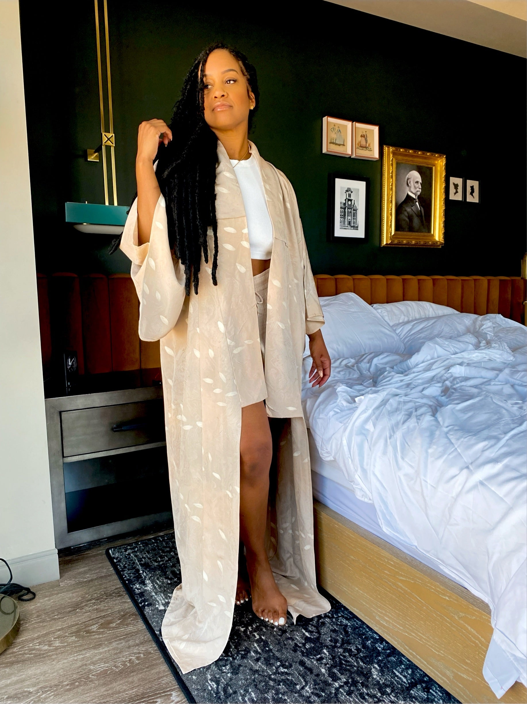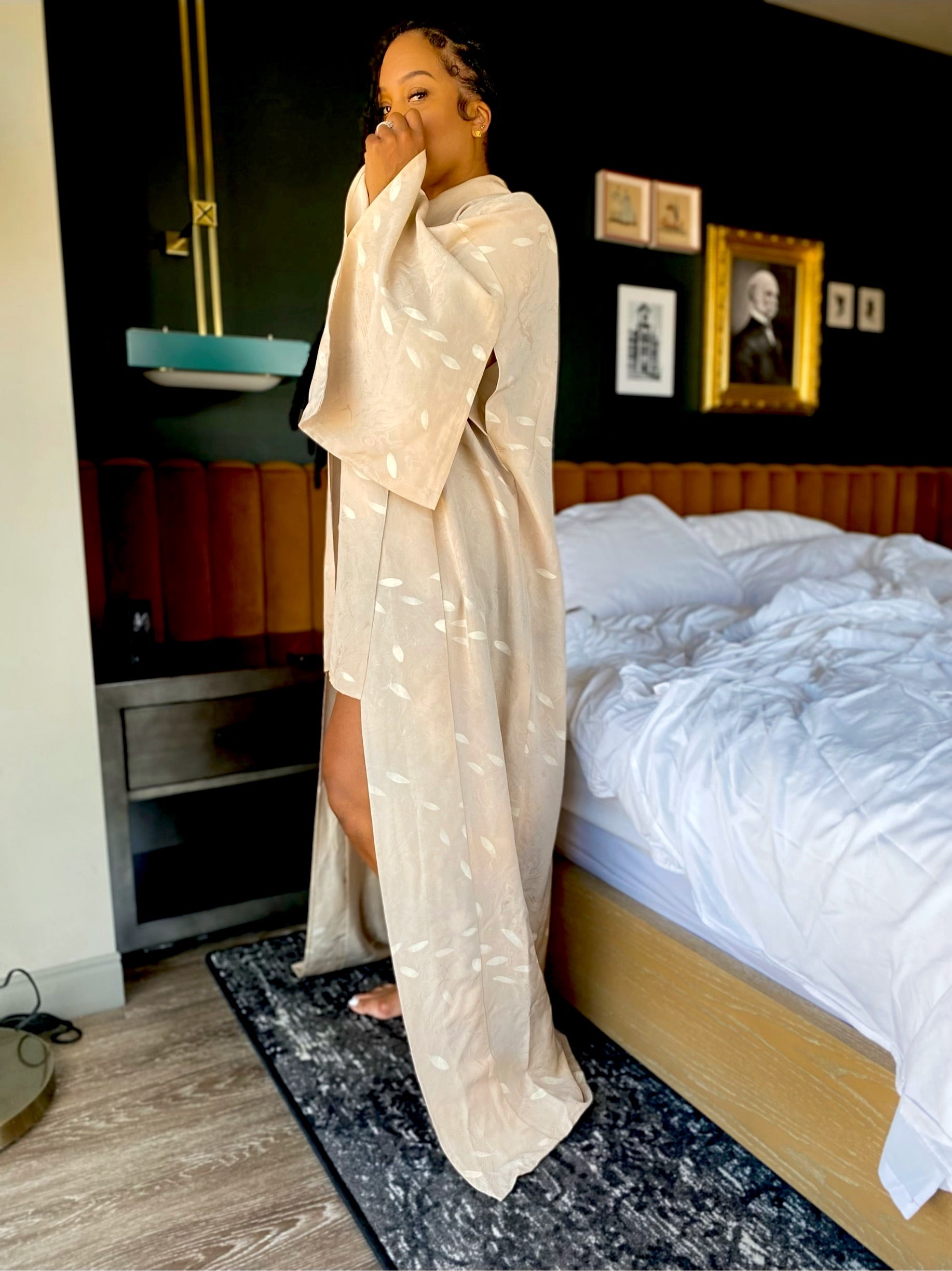 Subtle crepe silk vintage Kimono is very silky and lightweight . This beauty can be worn going out or just for lounging. This color looks amazing with Greens, browns, and other neon tones.
