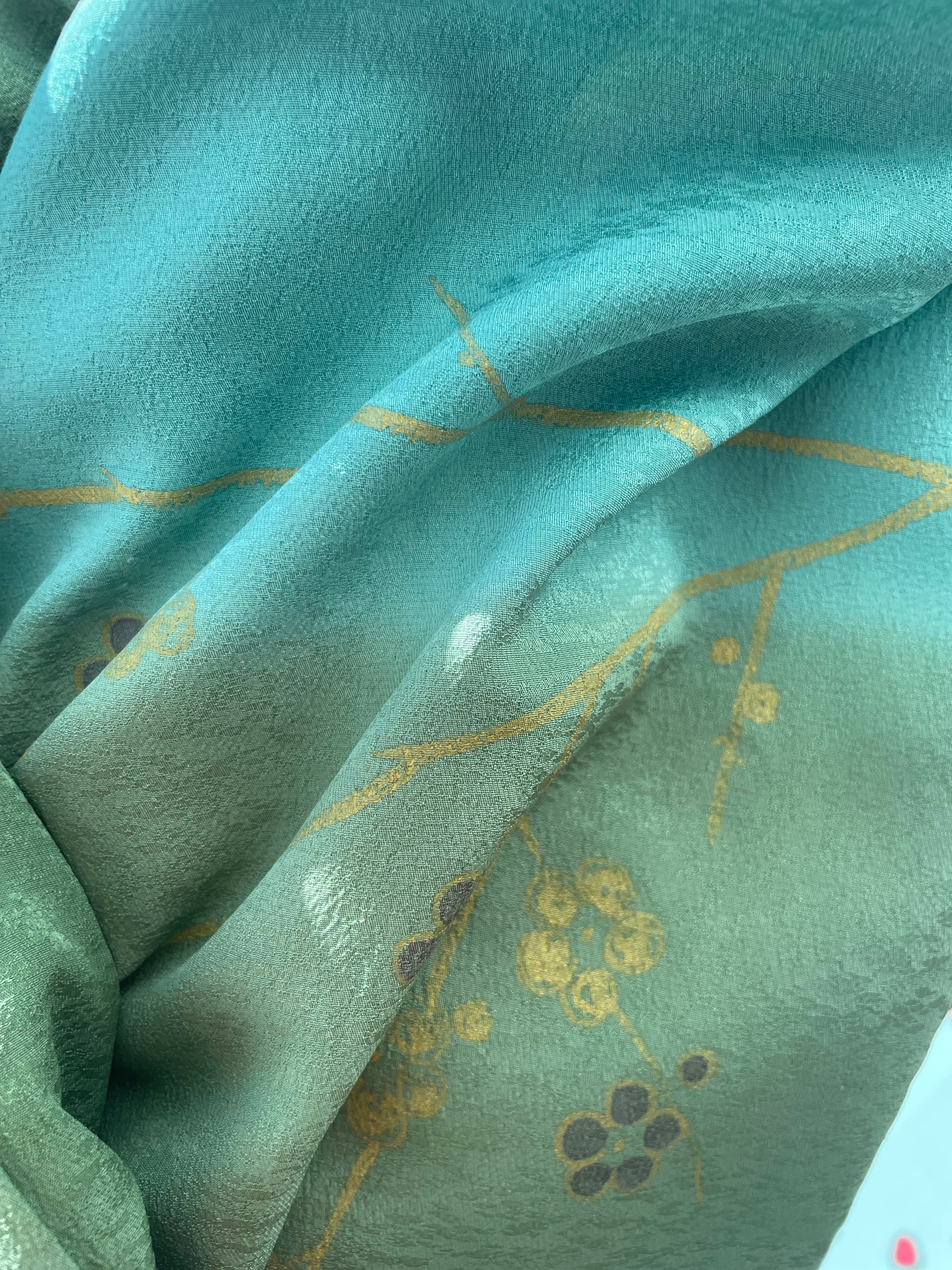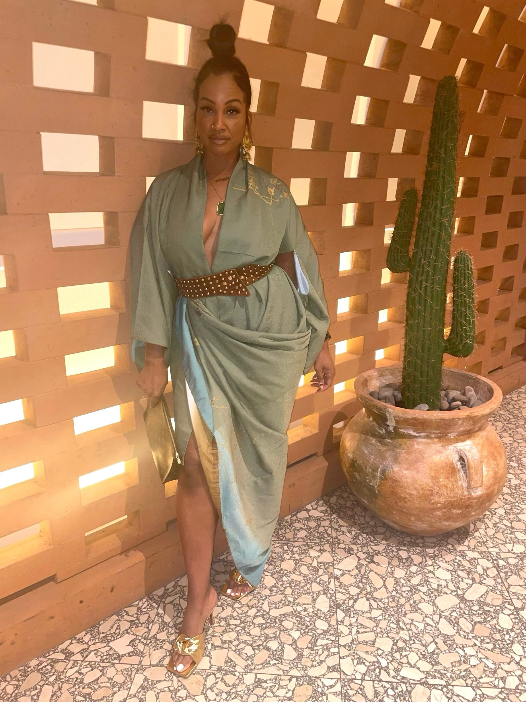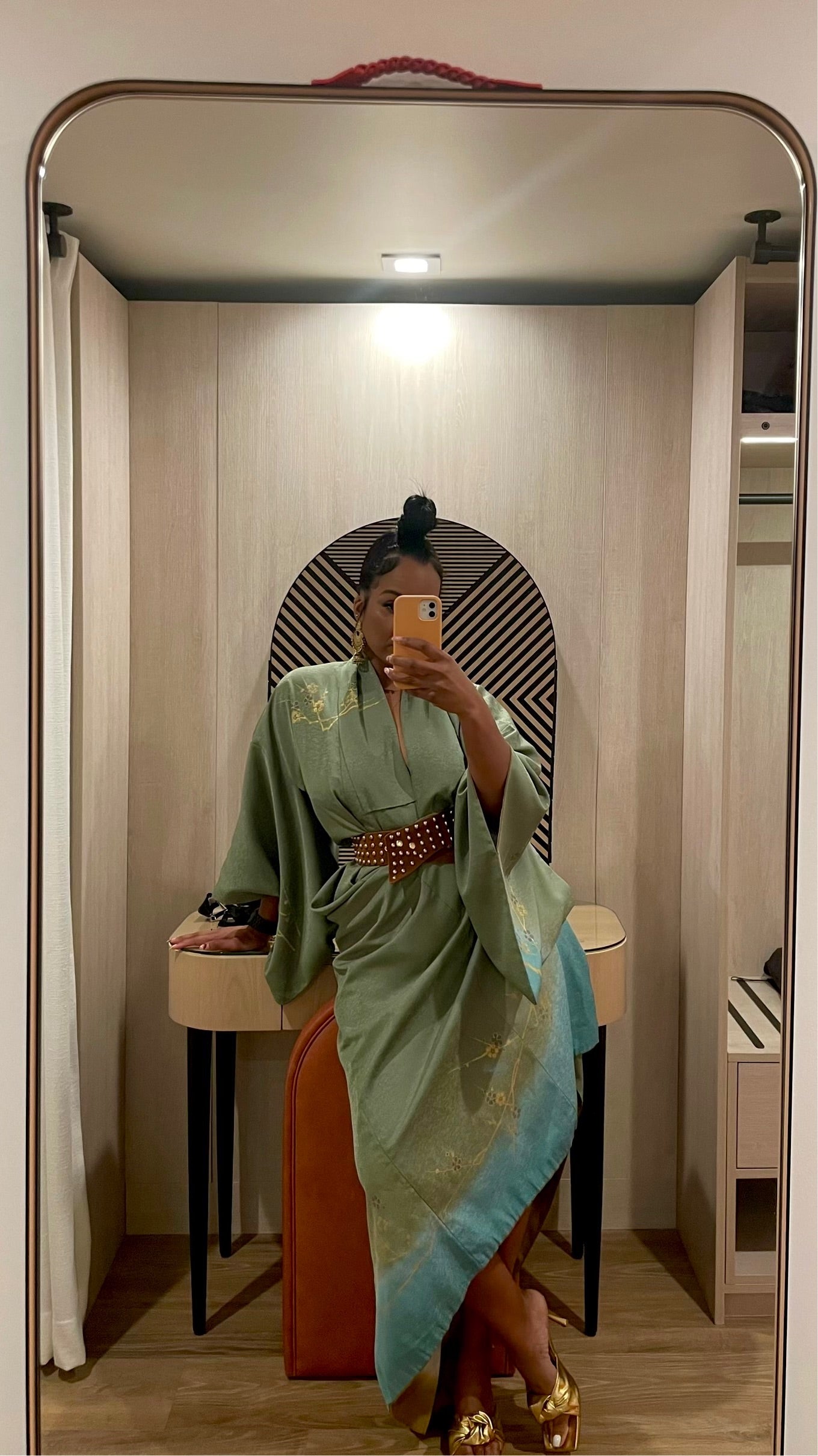 This feminine kimono is long with billowy sleeves . It’s oversized and can be won as a dress . The color ancients are beautiful and unique. Gold designs throughout the kimono.