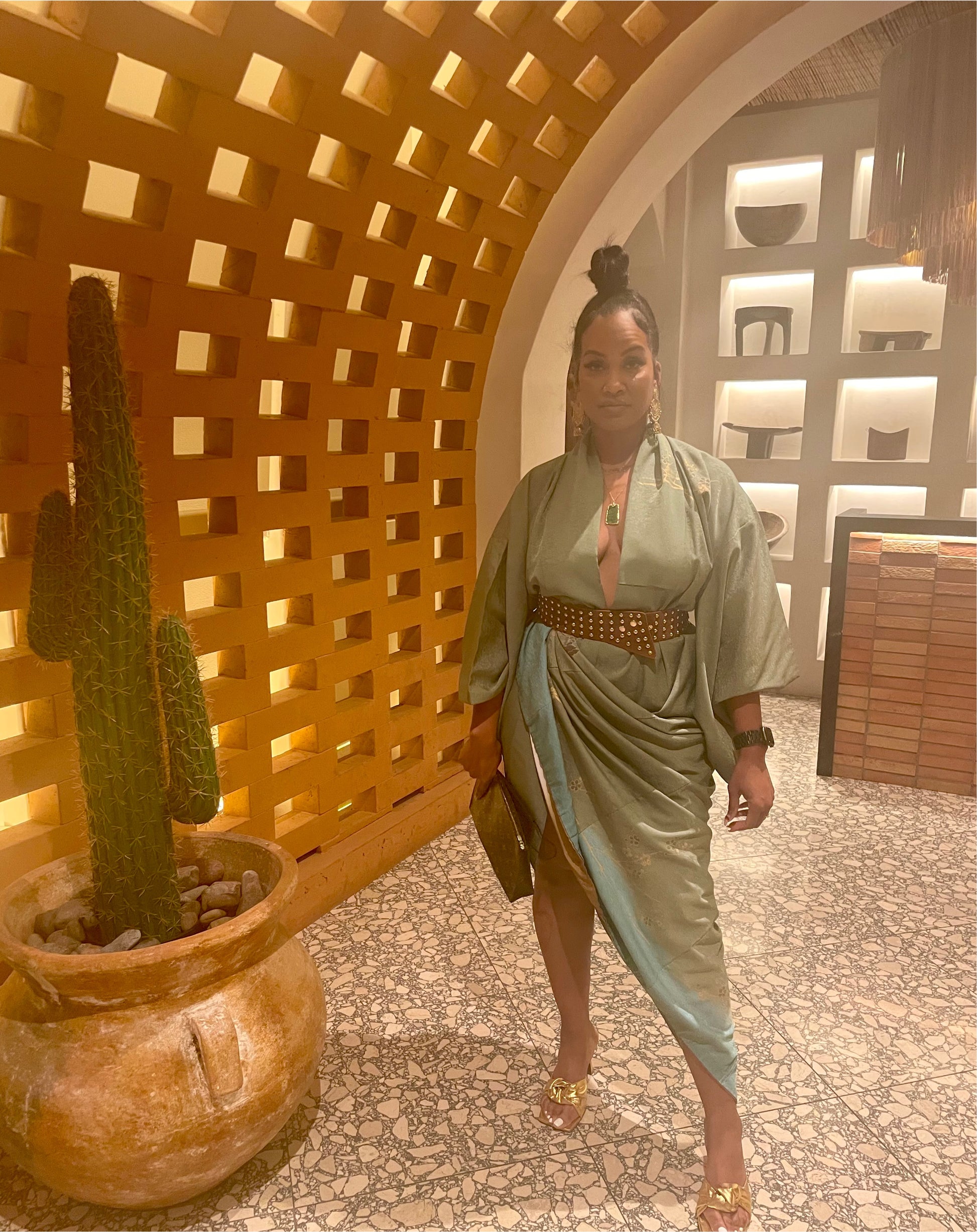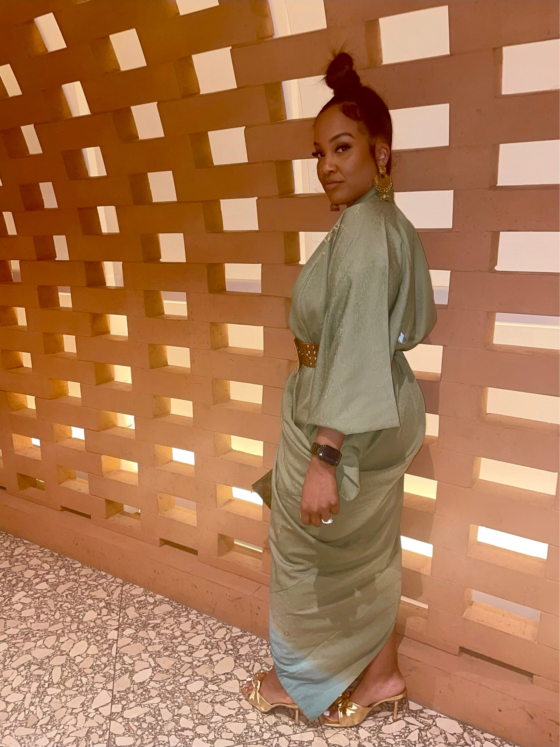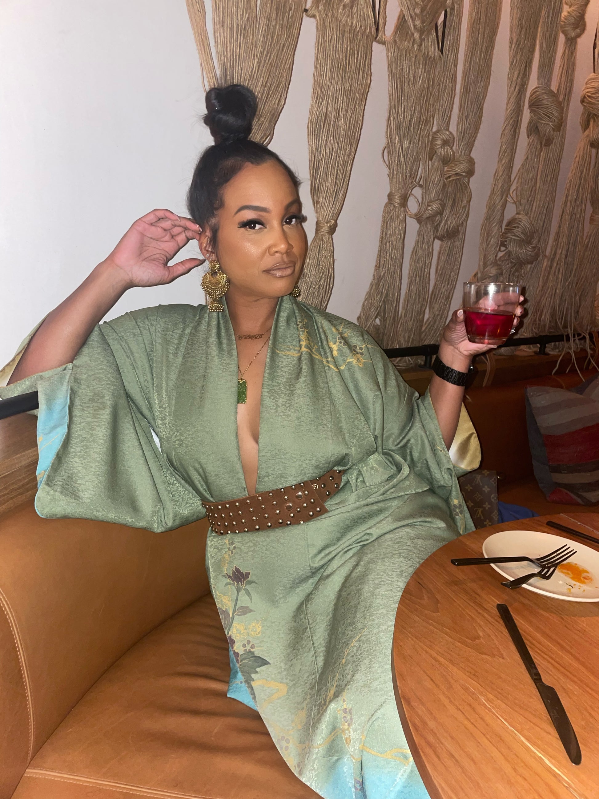 This feminine kimono is long with billowy sleeves . It’s oversized and can be won as a dress . The color ancients are beautiful and unique. Gold designs throughout the kimono.