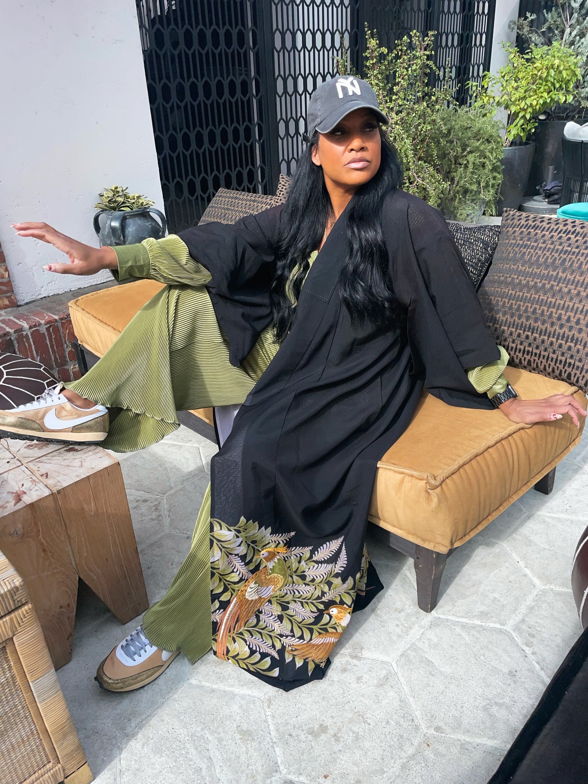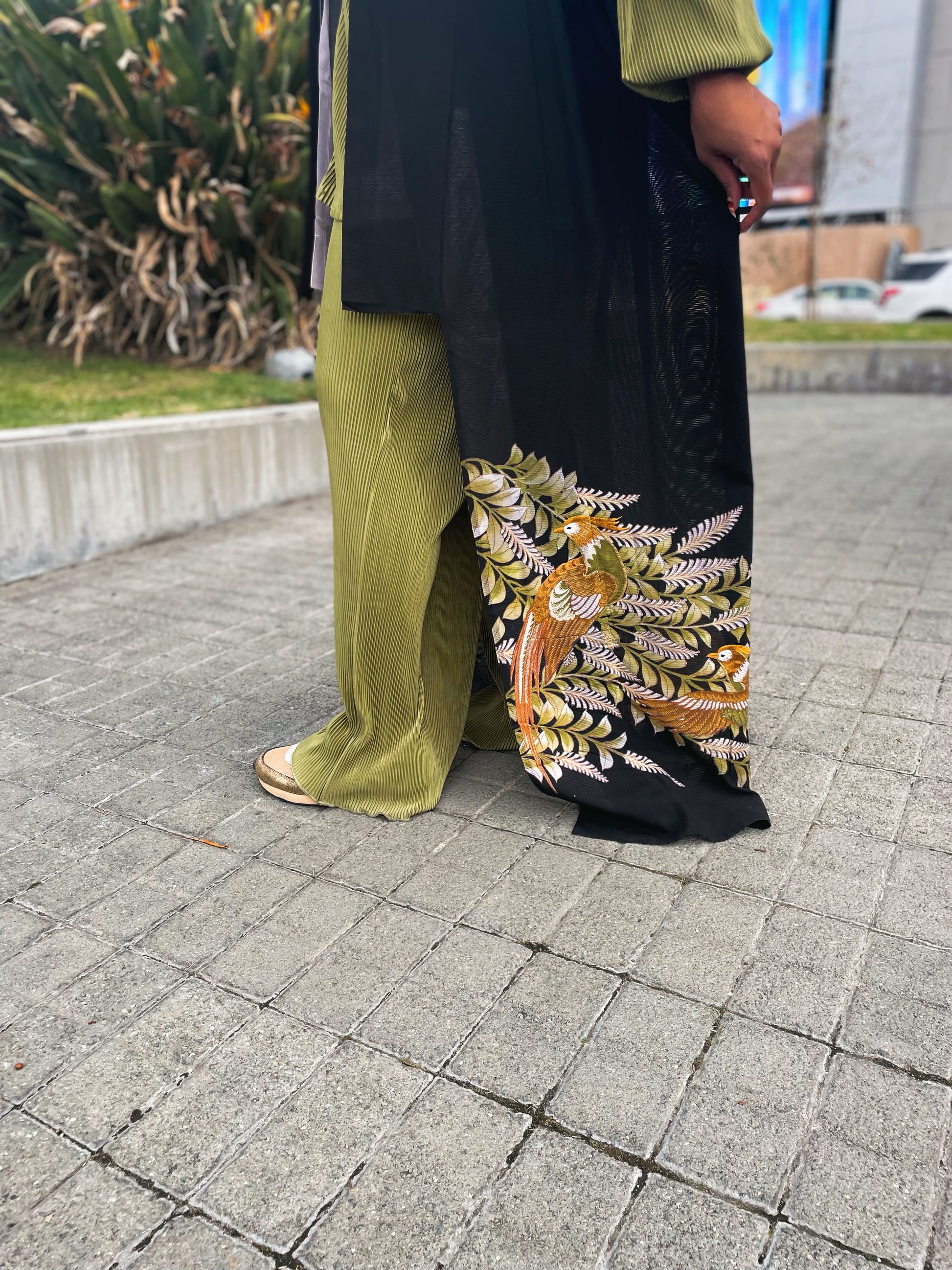 The perfect sultry layer is featured in a semi sheer fabric with embroidered all over the bottom . The birds are gold with beautiful detailing . Perfect for a pool side vibe as well.