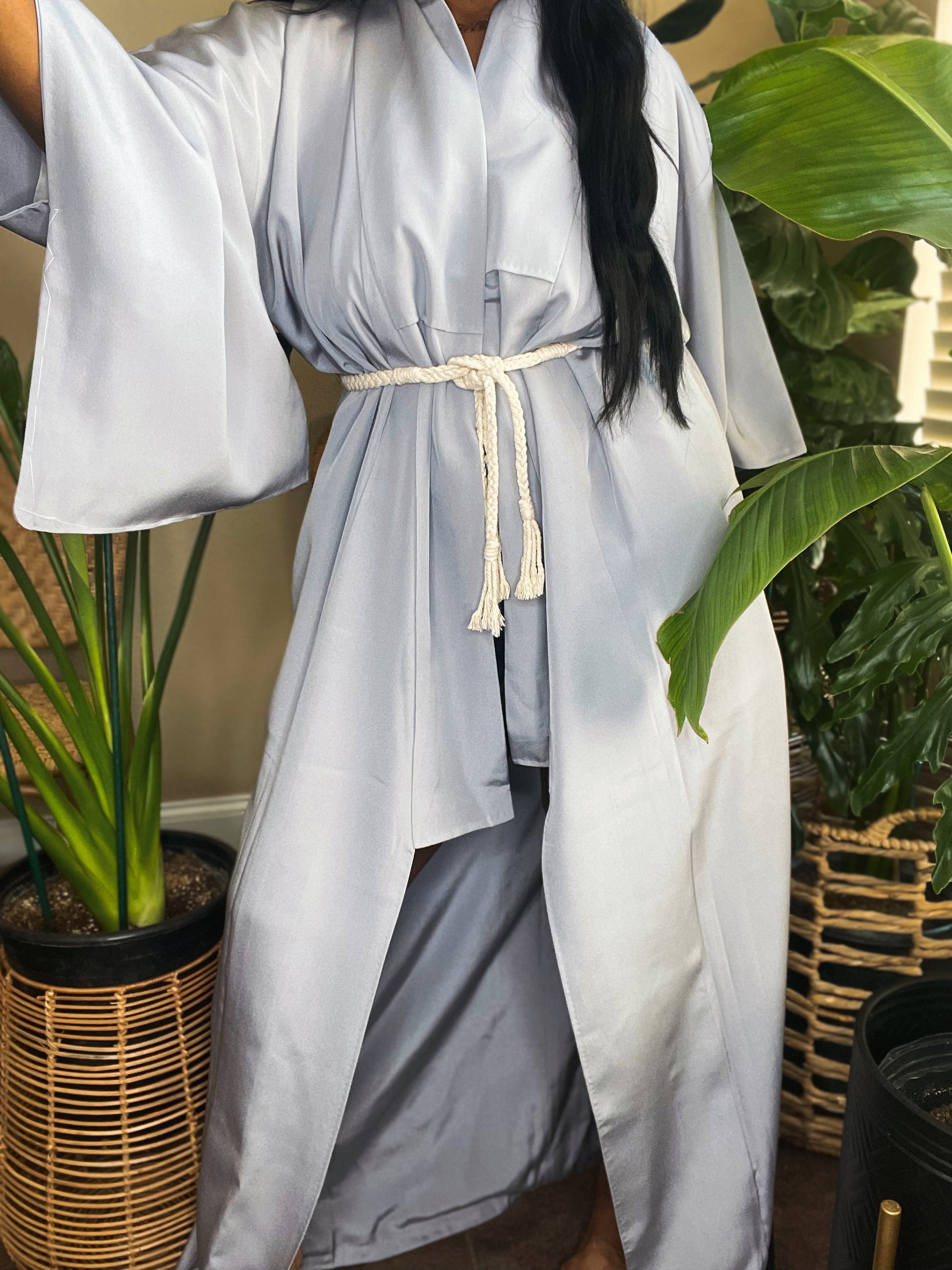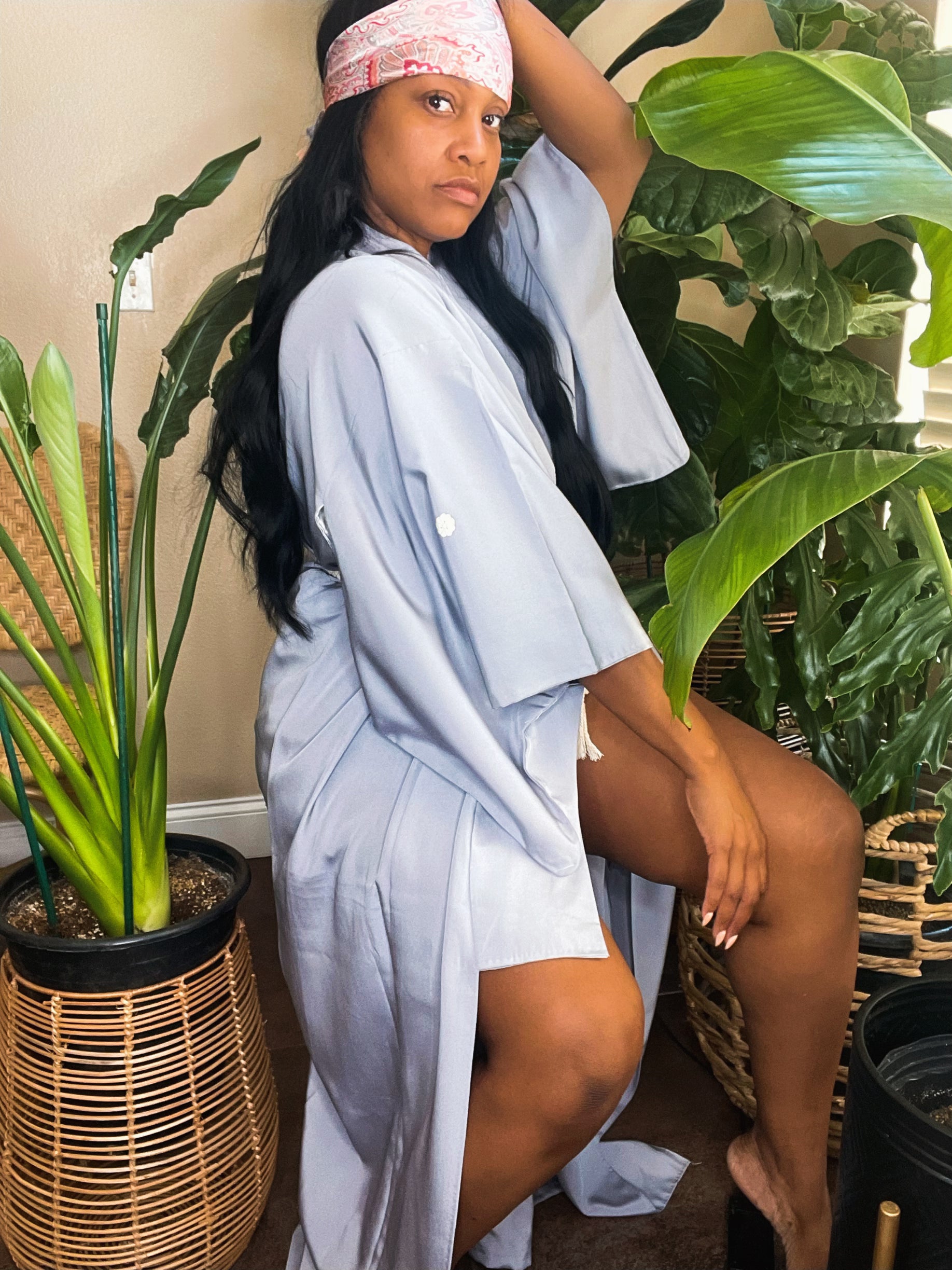 A simple and soft color (slate) statement piece and fully lined . This is a maxi Kimono with shapeless silhouette & is very silky. This piece is perfect for the homebody.