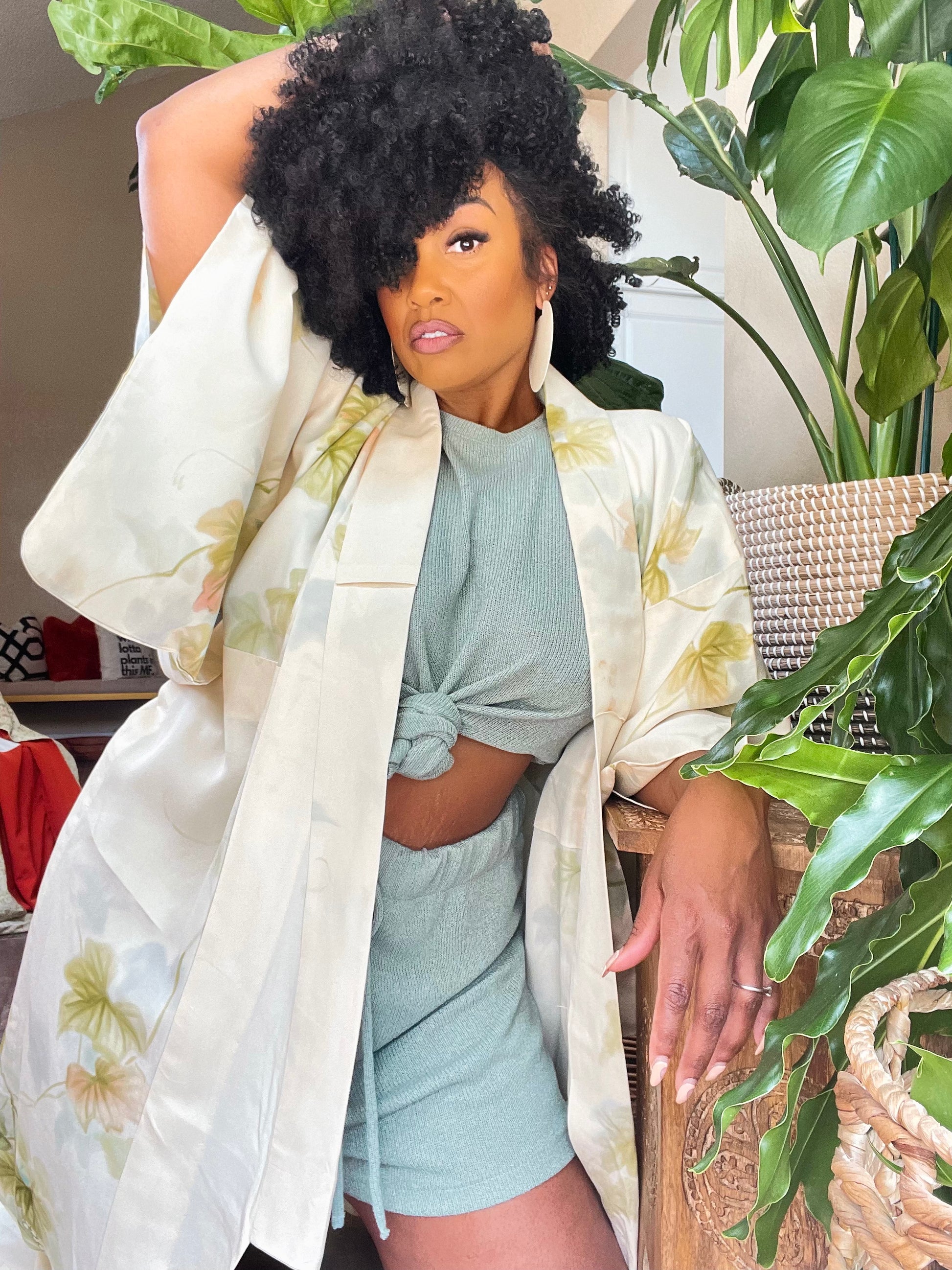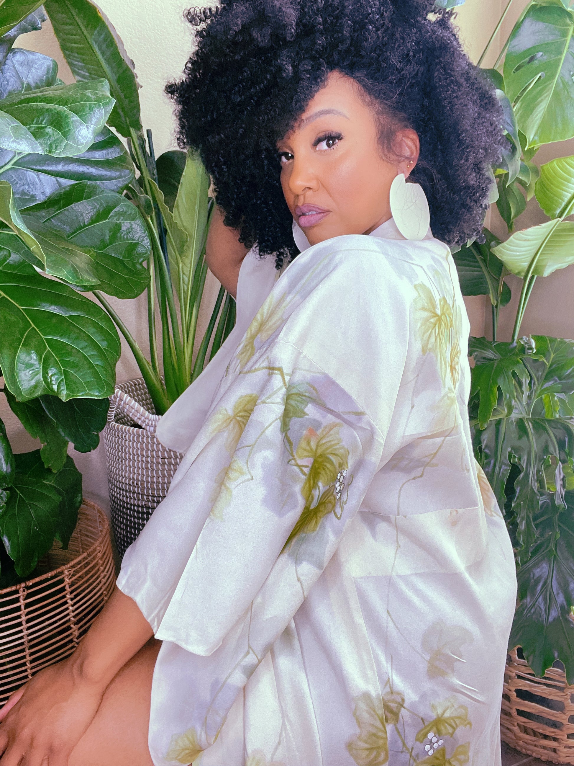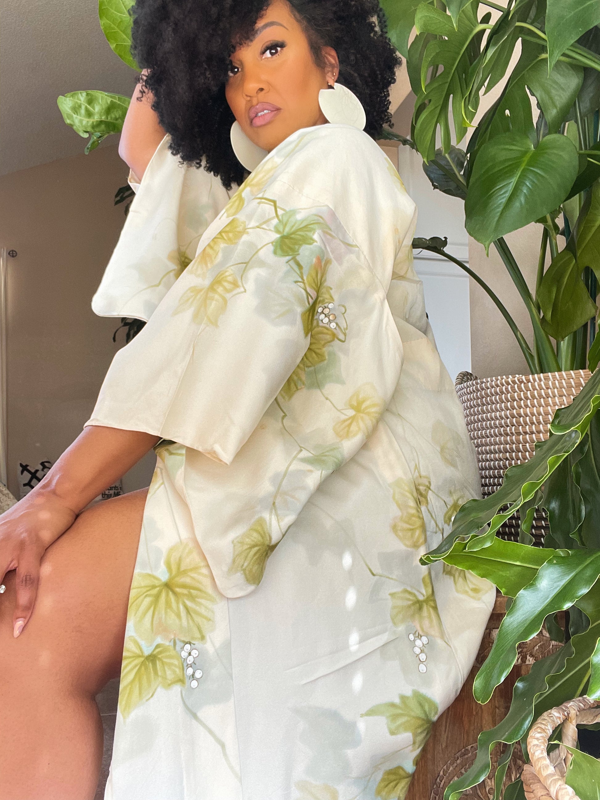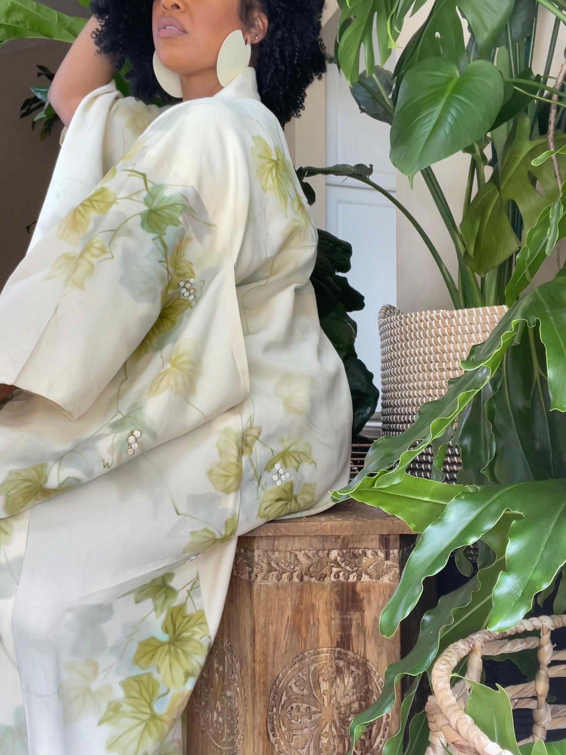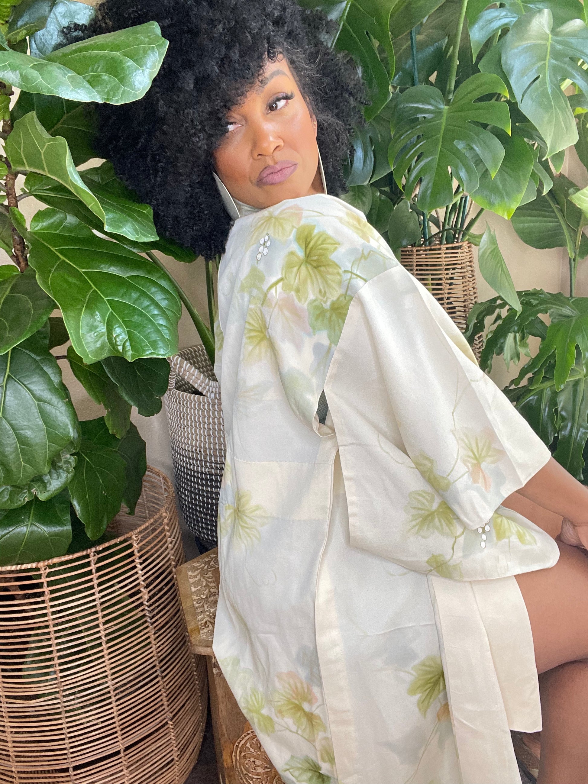 Vibrant but subtle crepe silk vintage Kimono is very silky and lightweight . This beauty can be worn going out or just for lounging. This color looks amazing with Greens, browns, and other neon tones.
