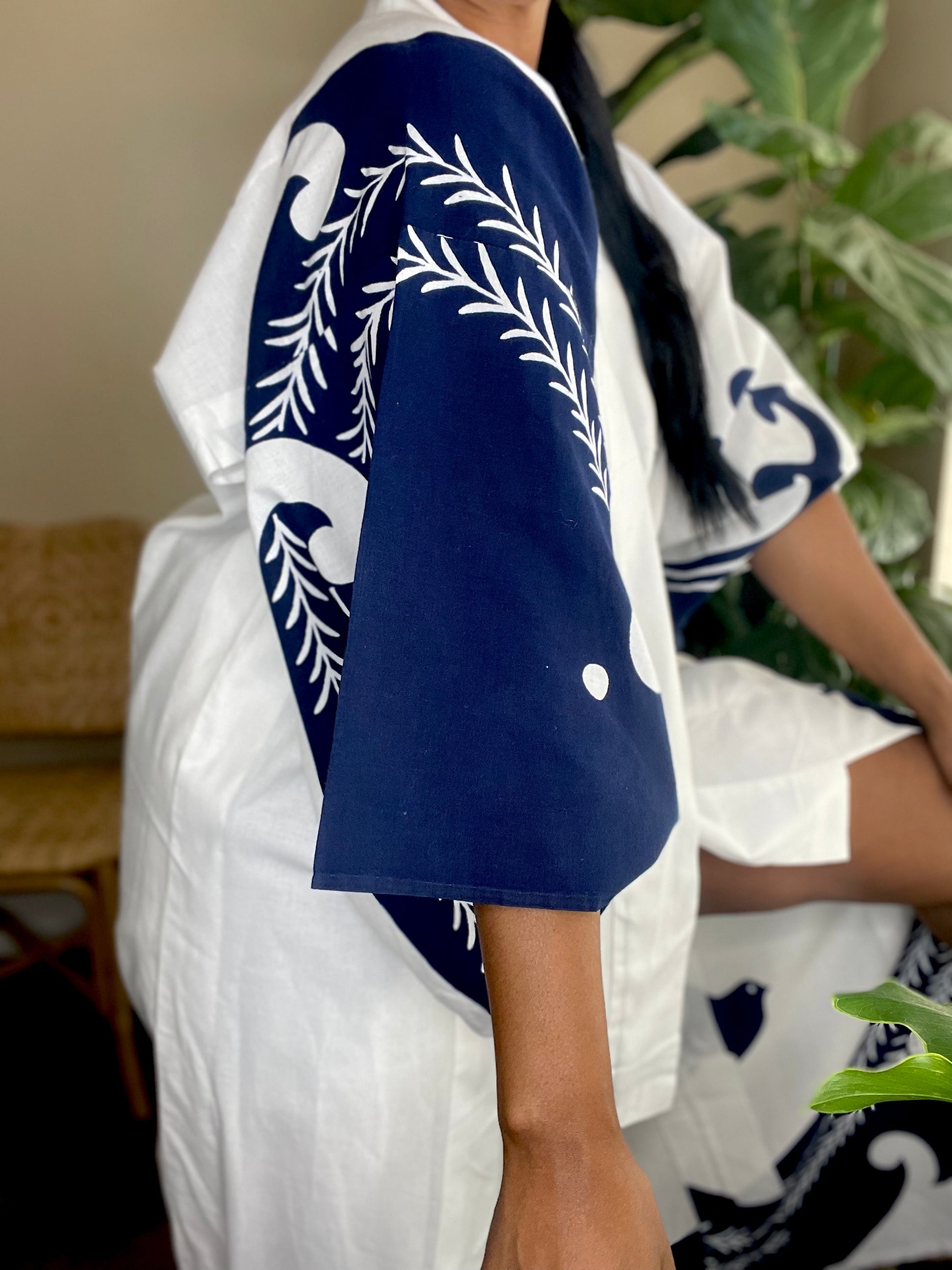 This pretty Navy/white kimono is perfect for summer and light weight fabric. Great as a cover up or lounging. Rock a kimono with sneakers and you’ll be comfortable all around.