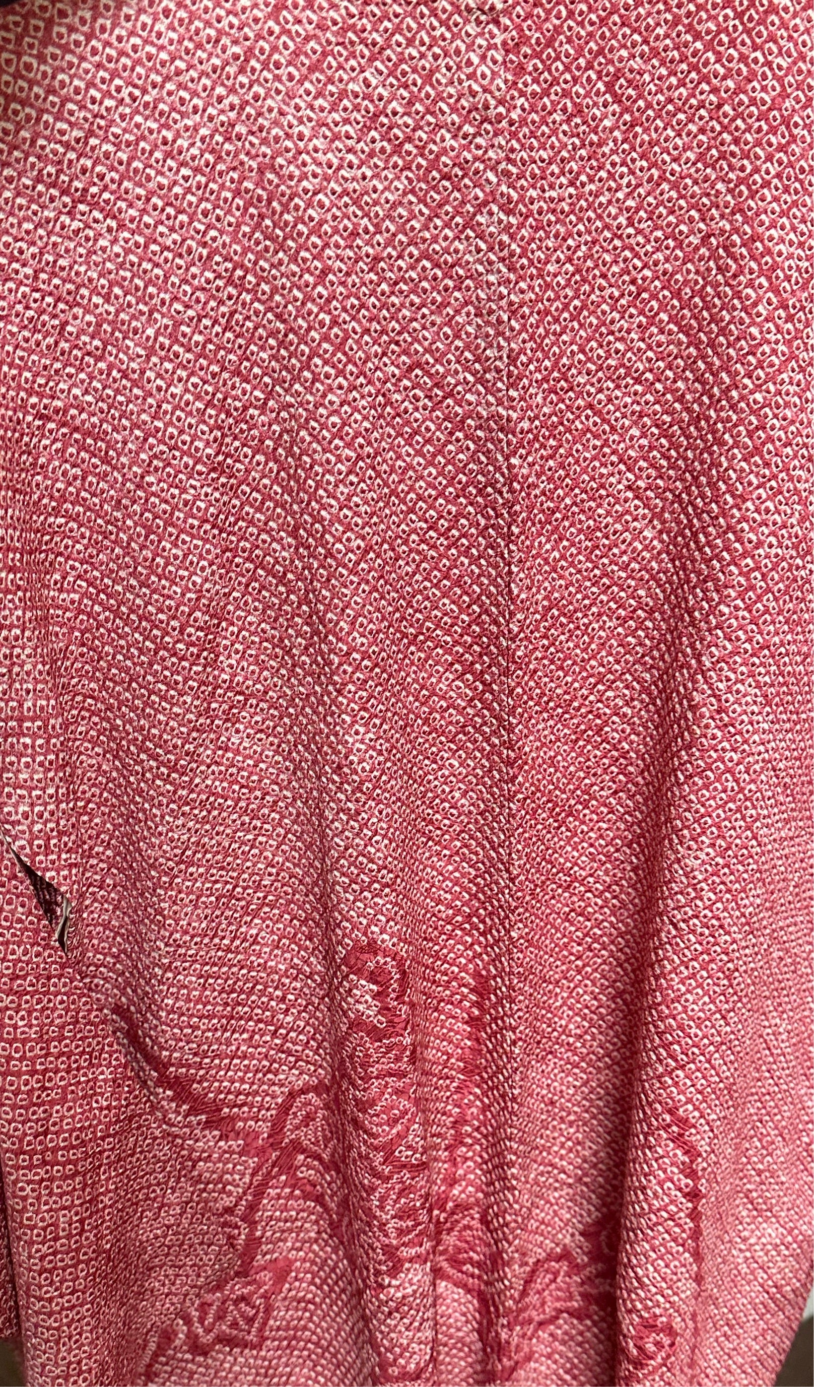 The kimono’s short haori design allows it to be perfectly paired with anything a closet has to offer. The vintage piece is a stunning combination of fun, comfort, and elegance with its loosely draped shape and large open sleeves.