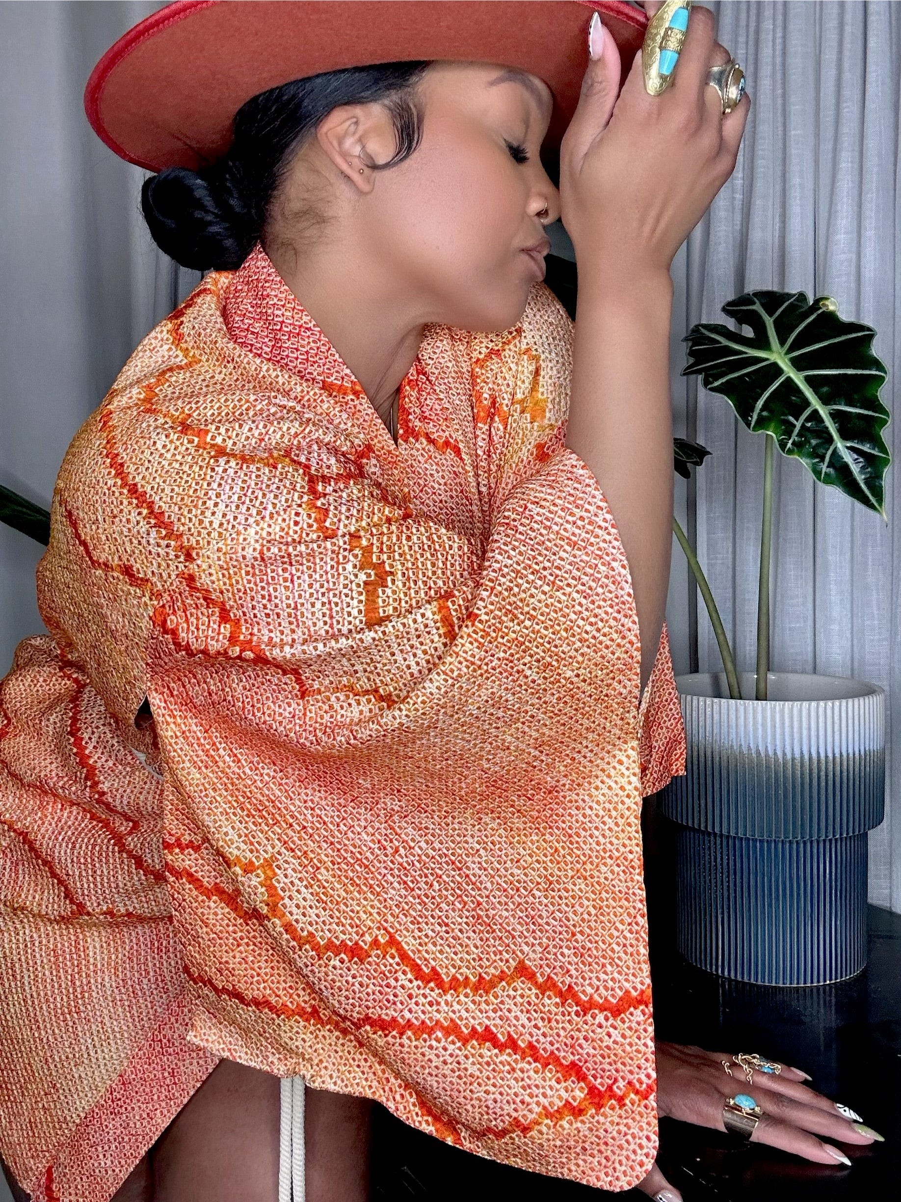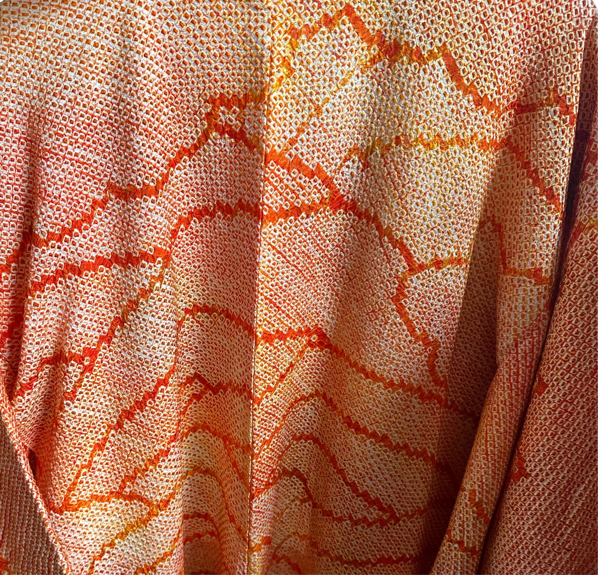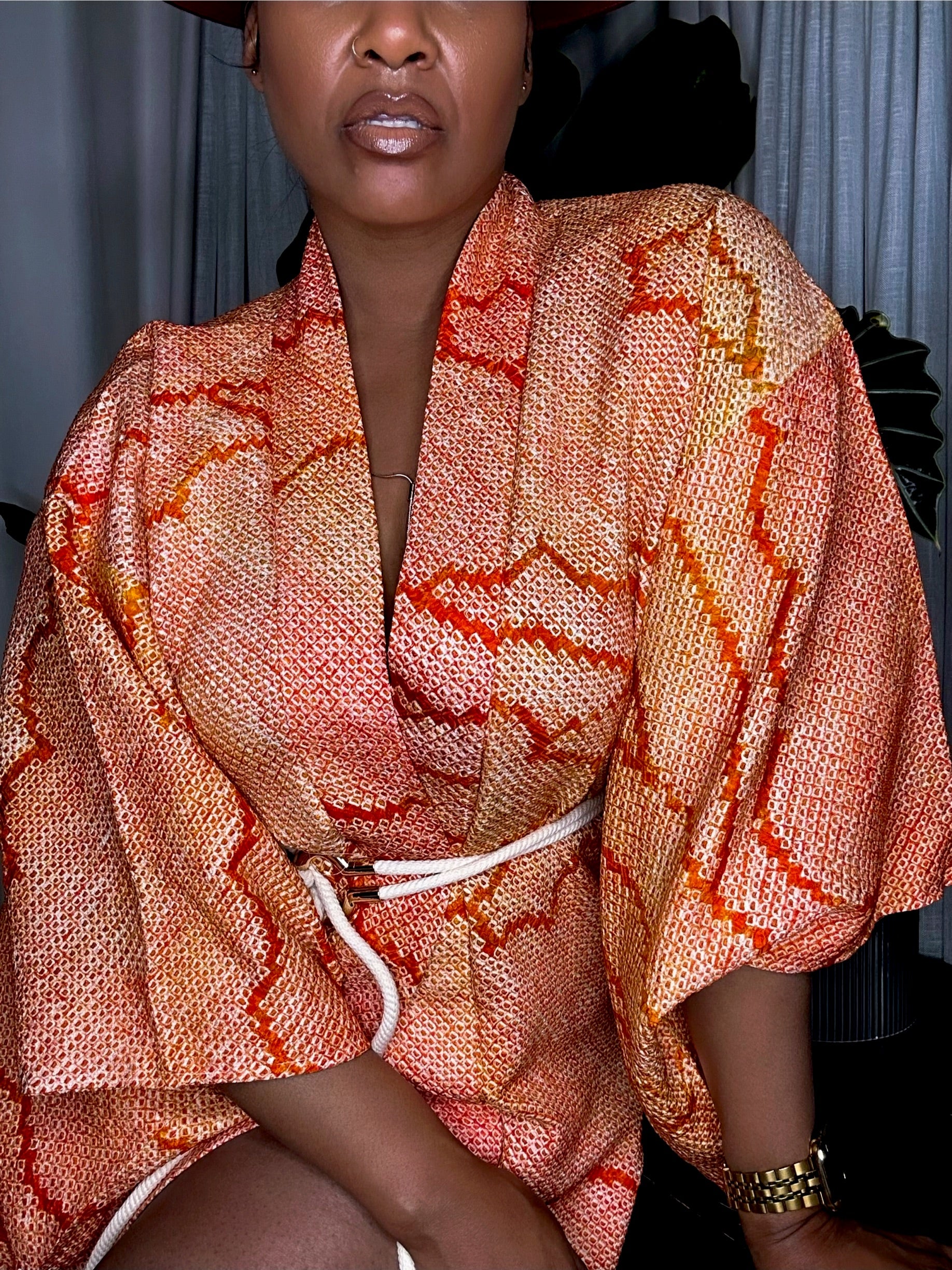 A lush pattern of thick horizontal stripes adorns the silk with faded swirls decorating the top . The kimono’s short haori design allows it to be perfectly paired with anything a closet has to offer. The vintage piece is a stunning combination of fun, comfort, and elegance with its loosely draped shape and large open sleeves.