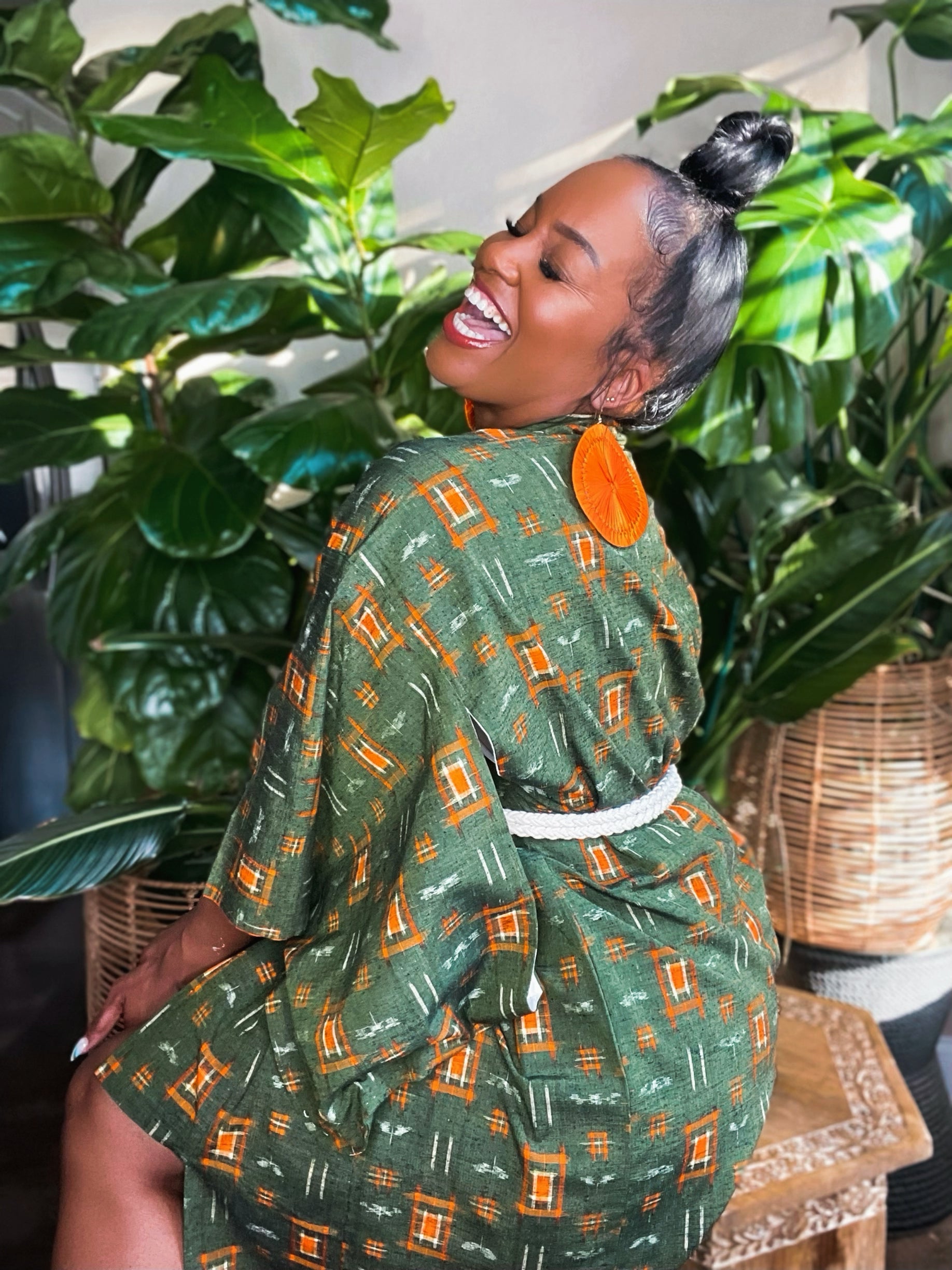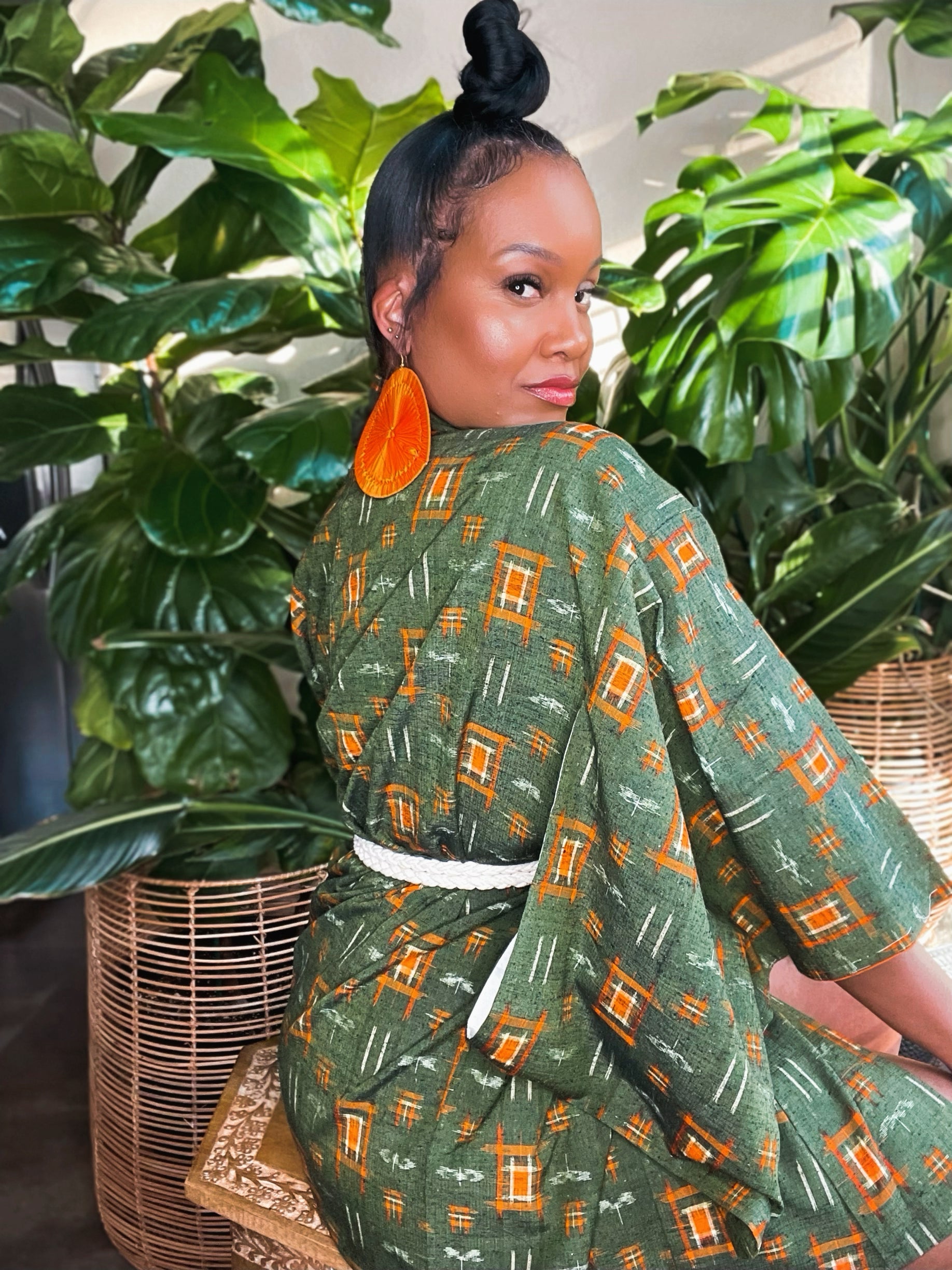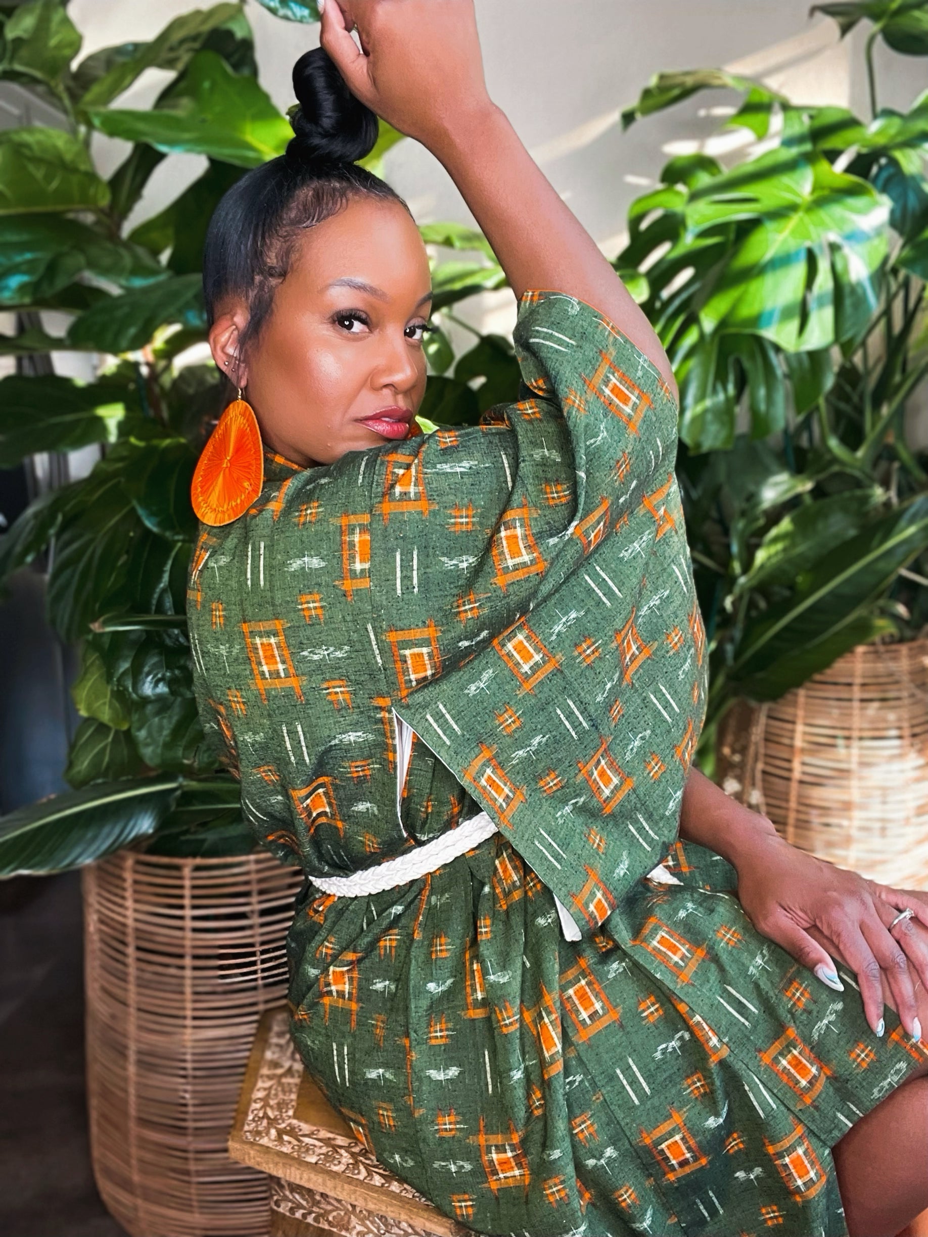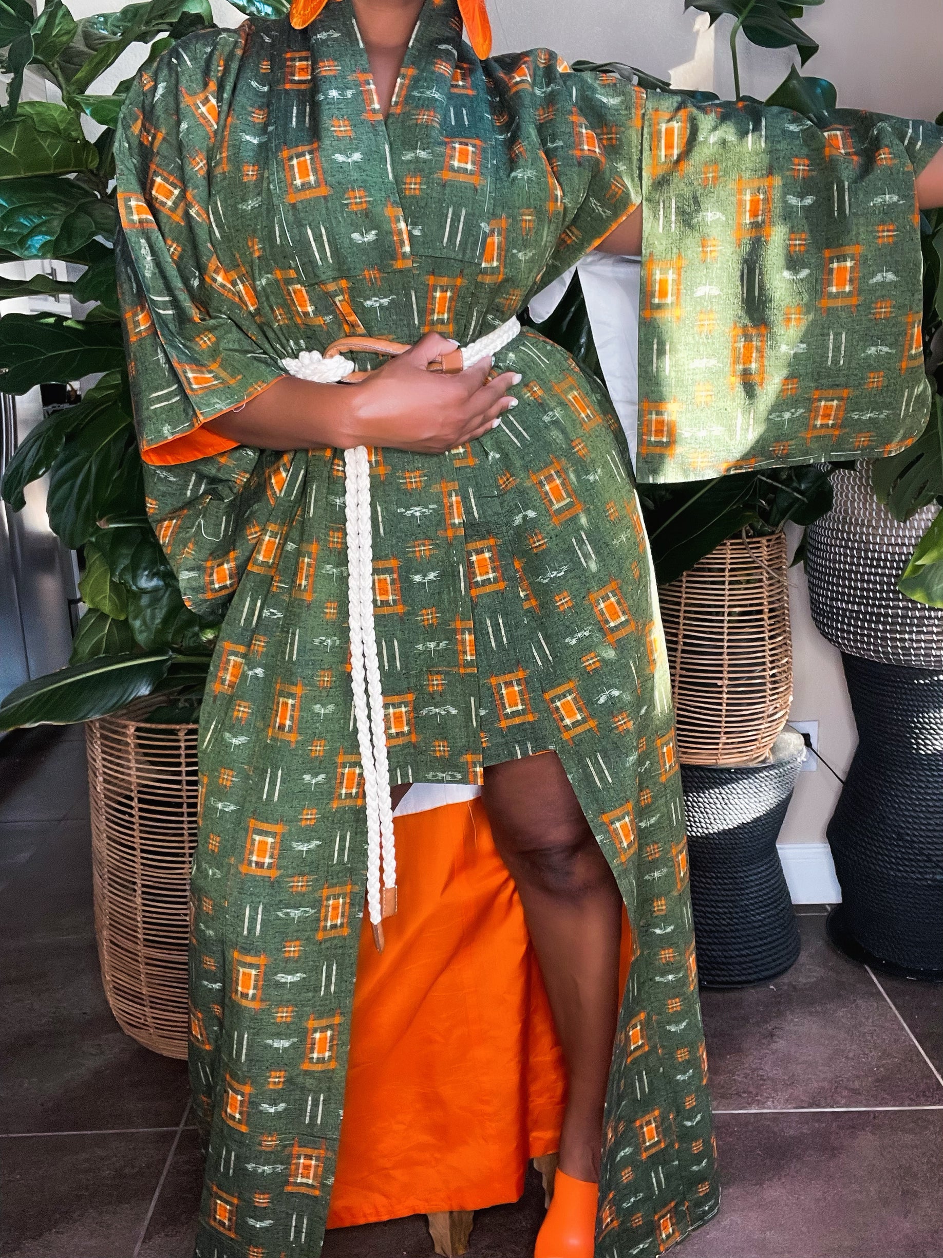 This beautiful green and orange color Kimono has a beautiful print on the outside & fully lined . This beauty is on the heavy side because her material is mixed with wool.