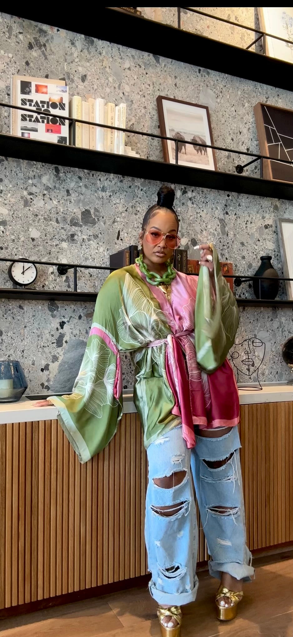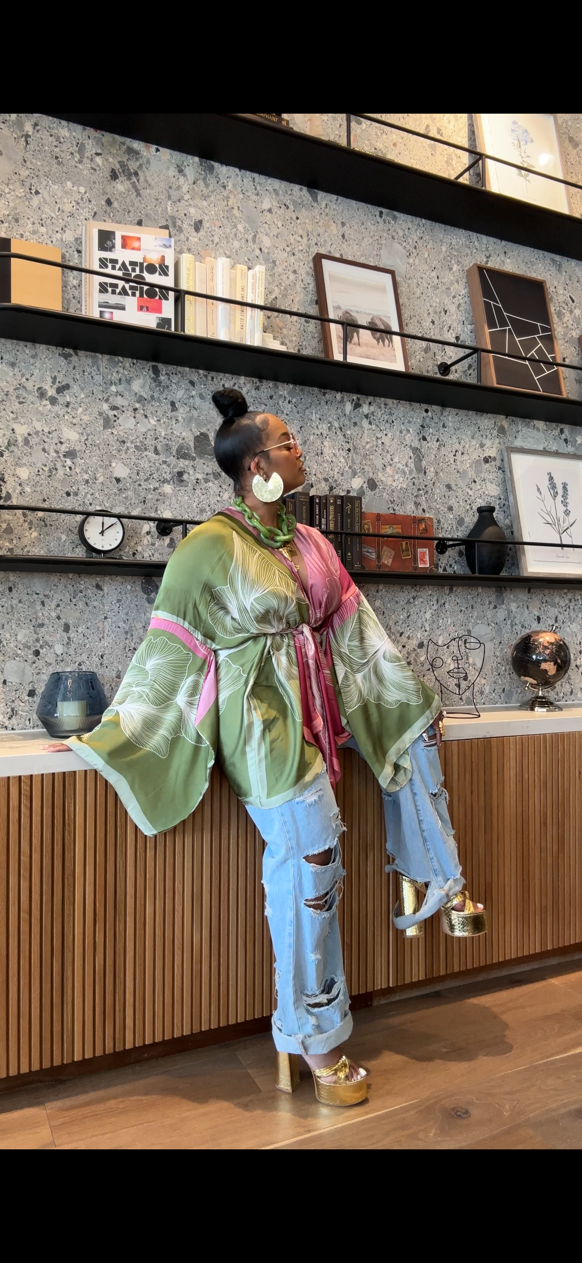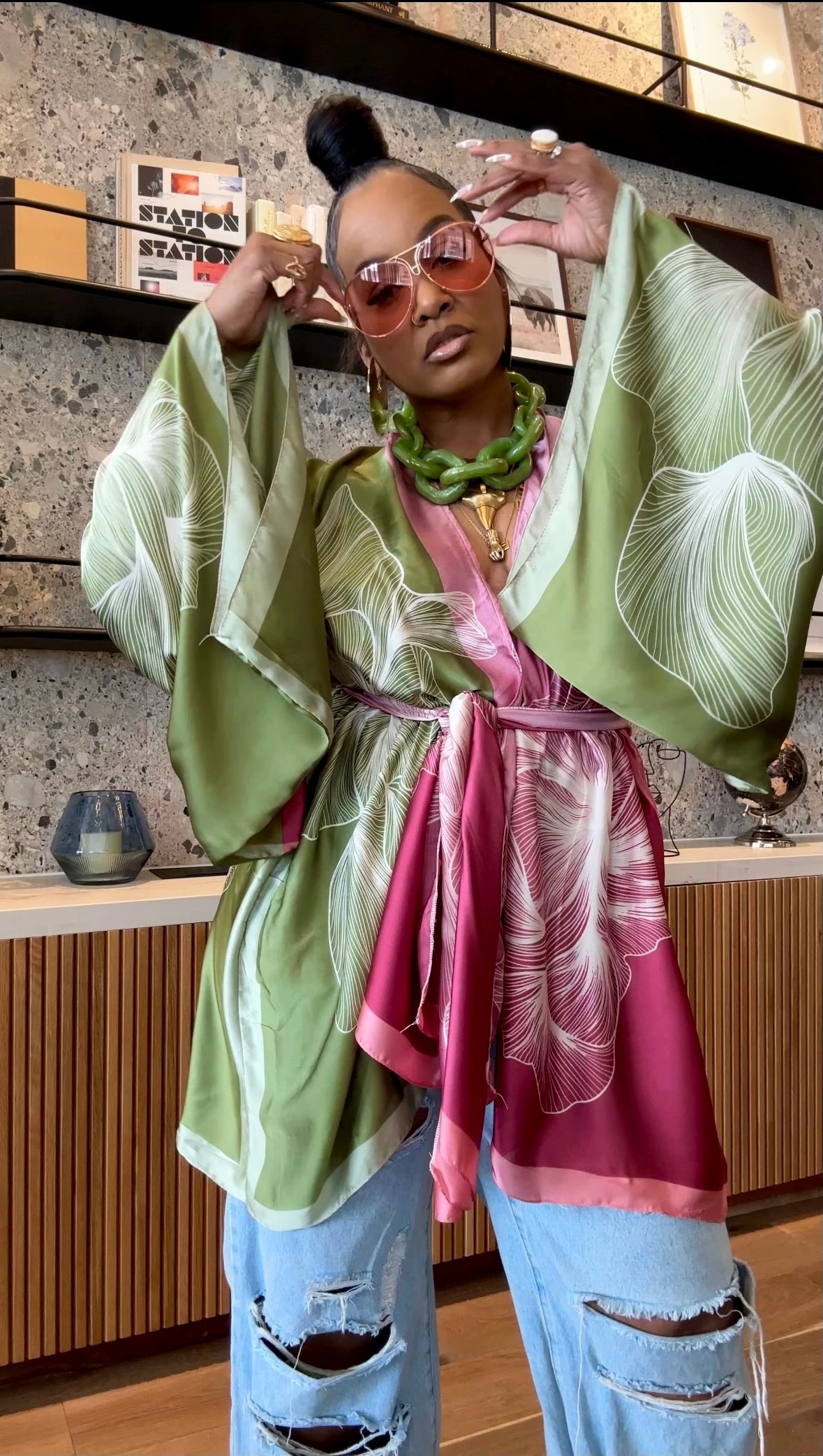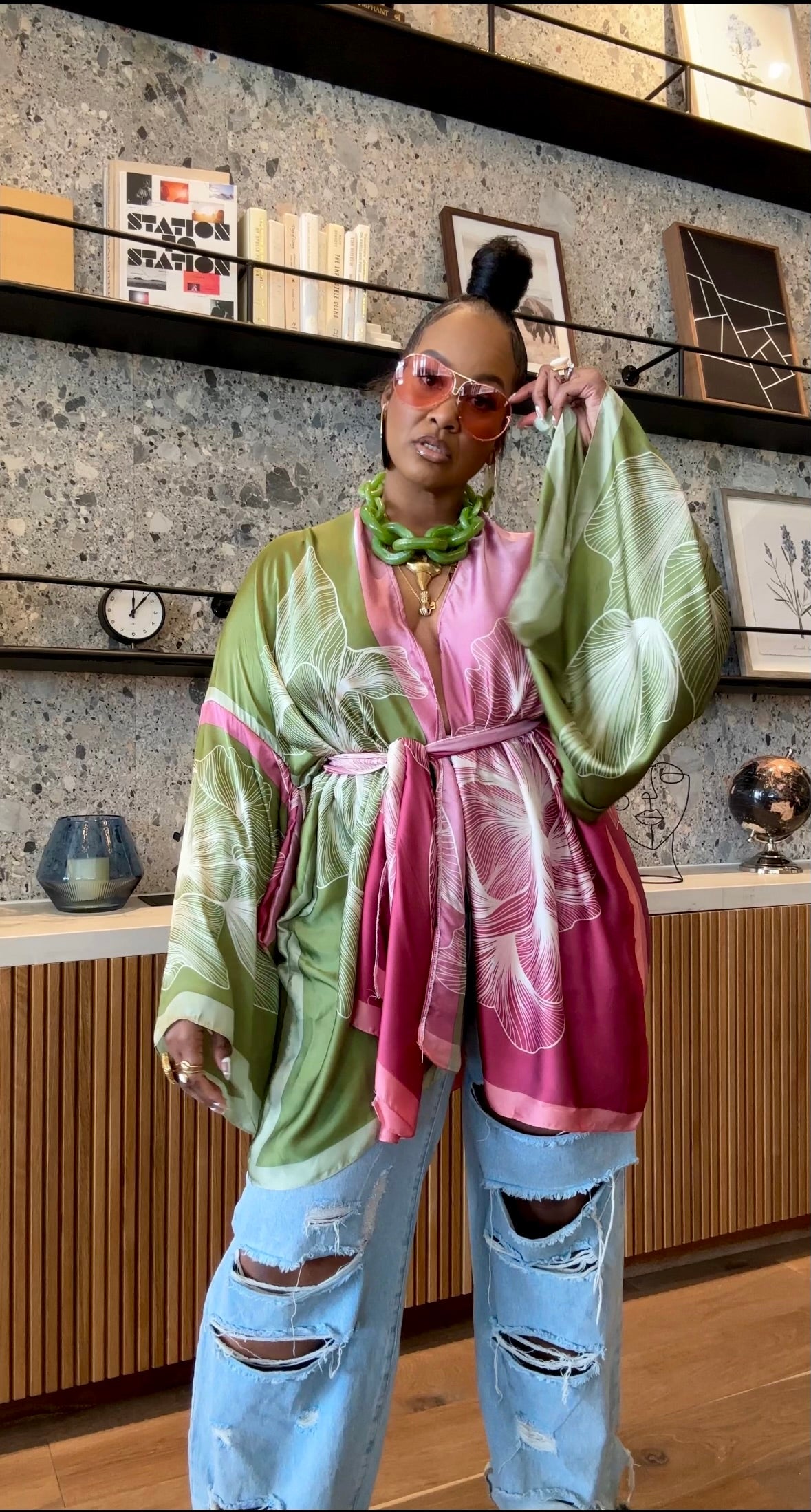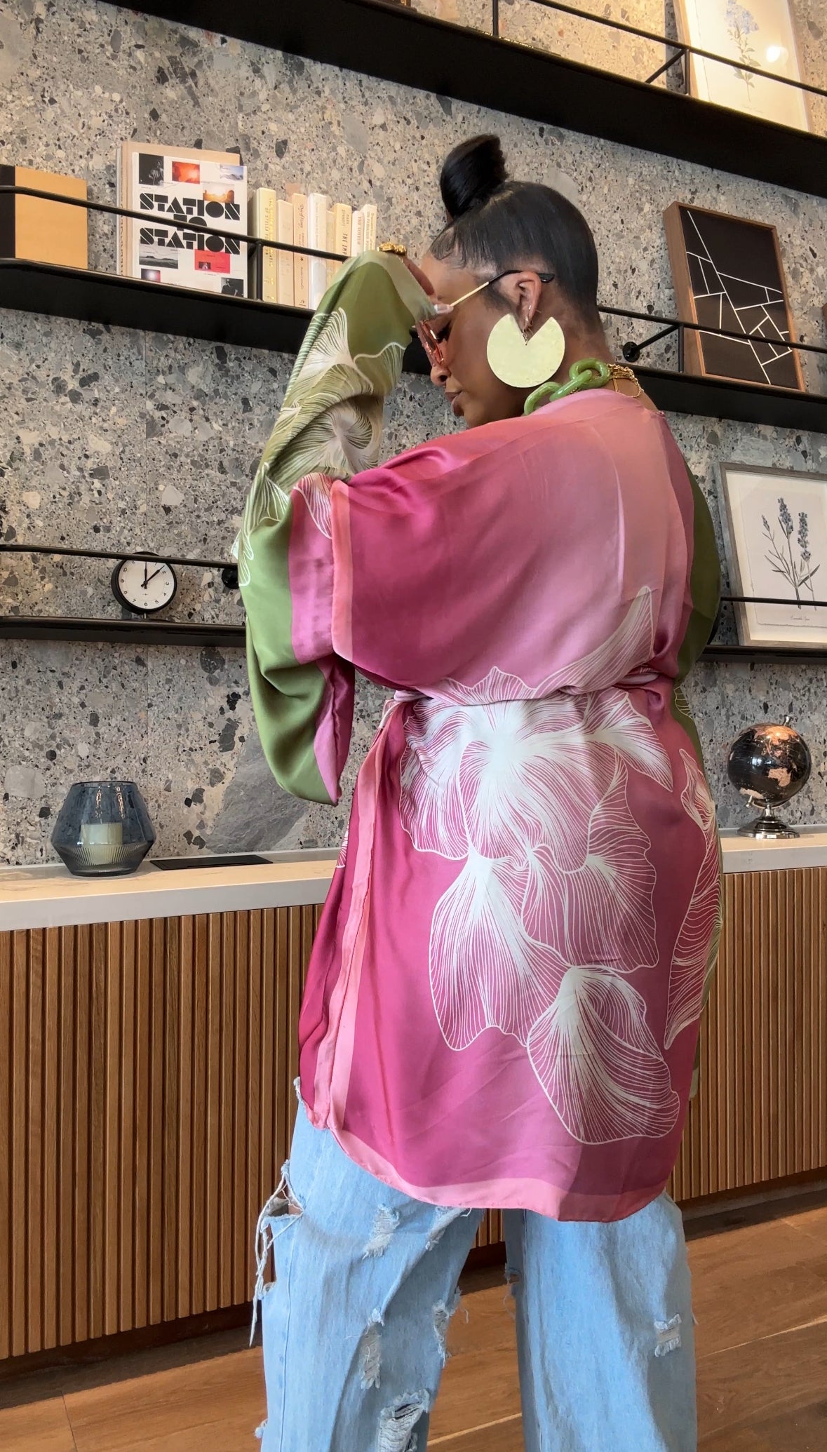 The Unakite Robe is a bold, beautiful statement piece with an effortlessly luxe vibe. Designed in a silky poly fabric, this robe features a striking pink & green floral print . Its fluid drape and open-front silhouette make it perfect for layering.