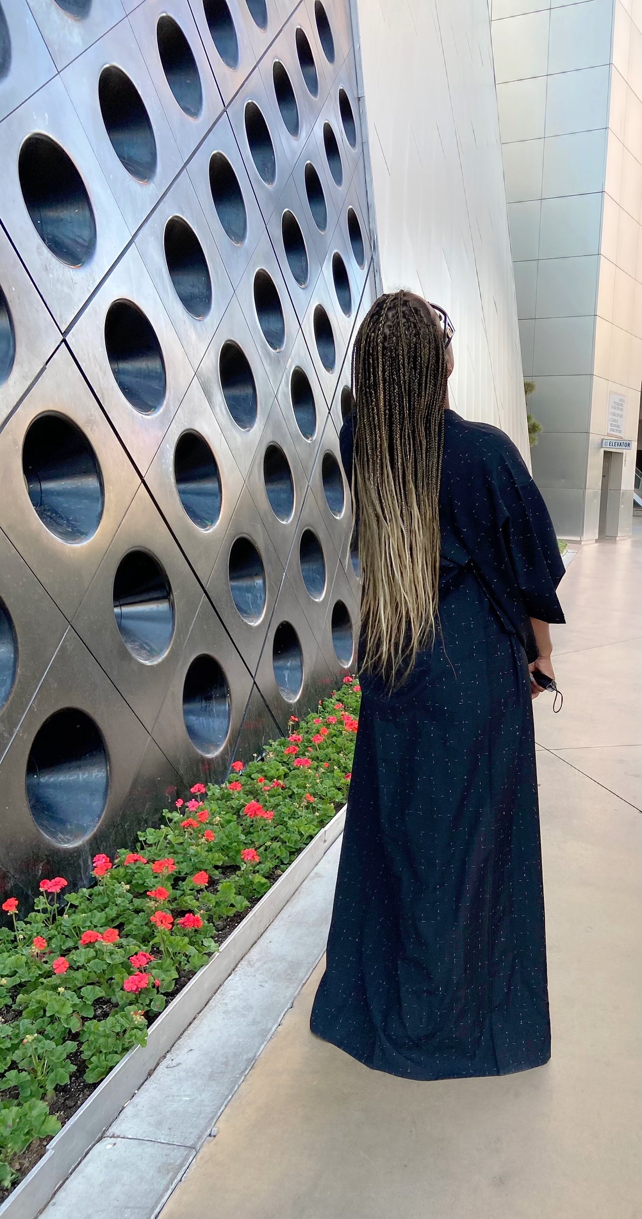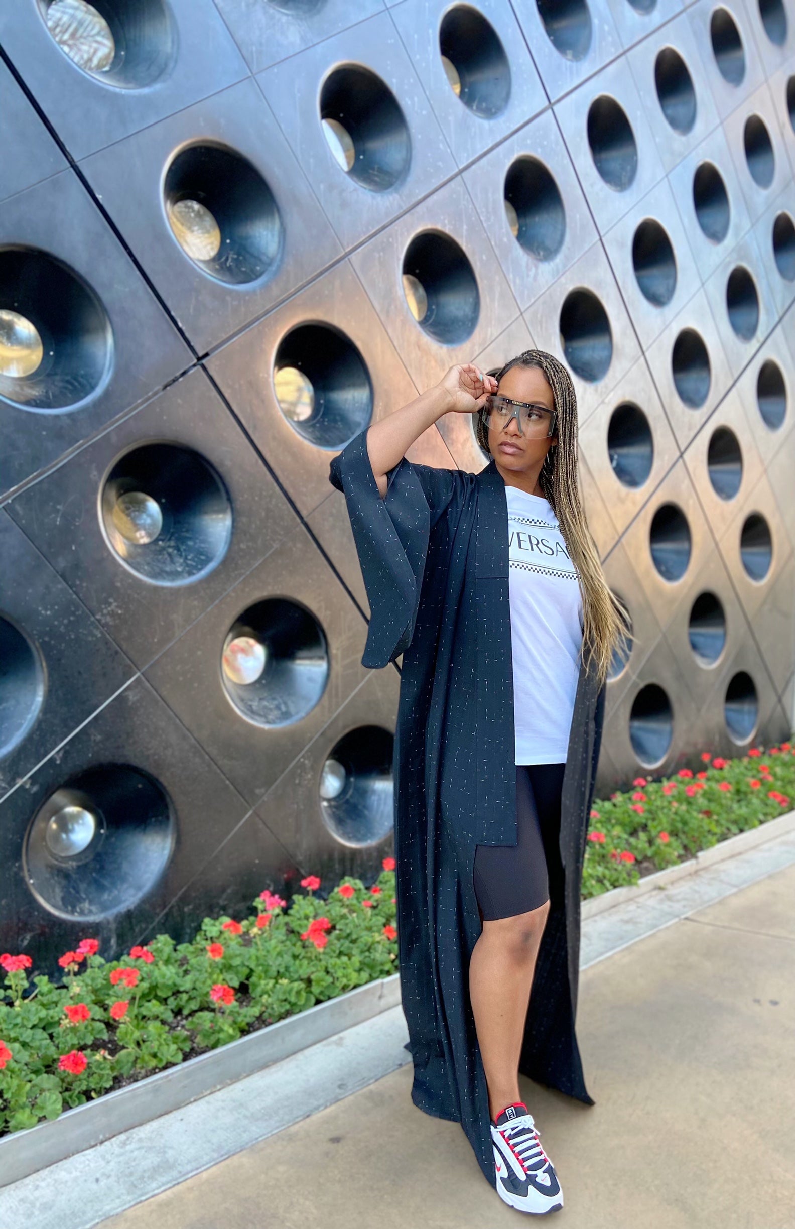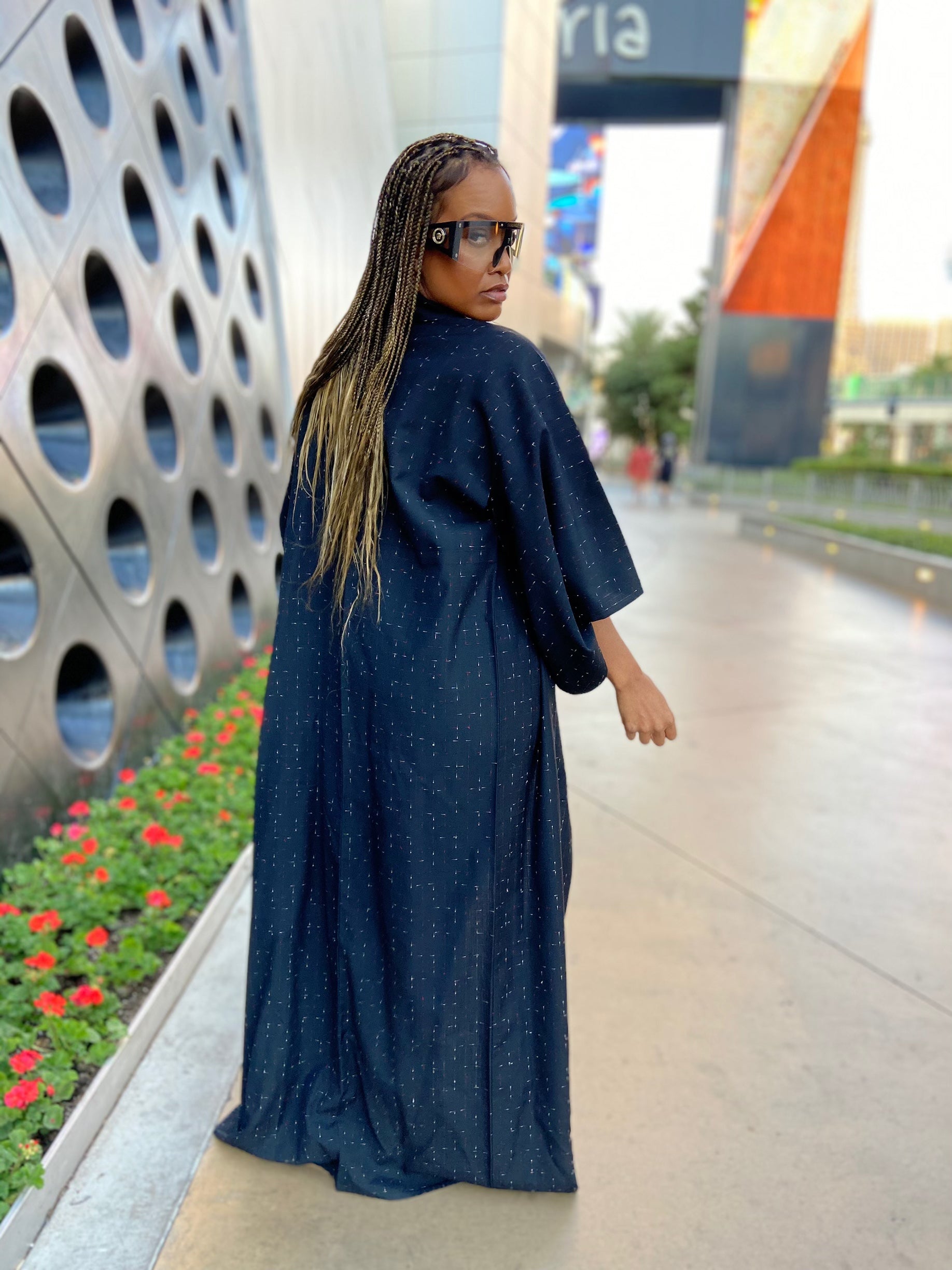 This beauty almost didn’t make it to the website! She is a black beauty with red and white lines thru out the material. This kimono is heavy enough to wear as a winter coat. I love her dressed up and dressed casual as pictured. Metallic accessories will compliment this Kimono 👘. She is heavy and full of Style! This beauty is definitely a statement piece.