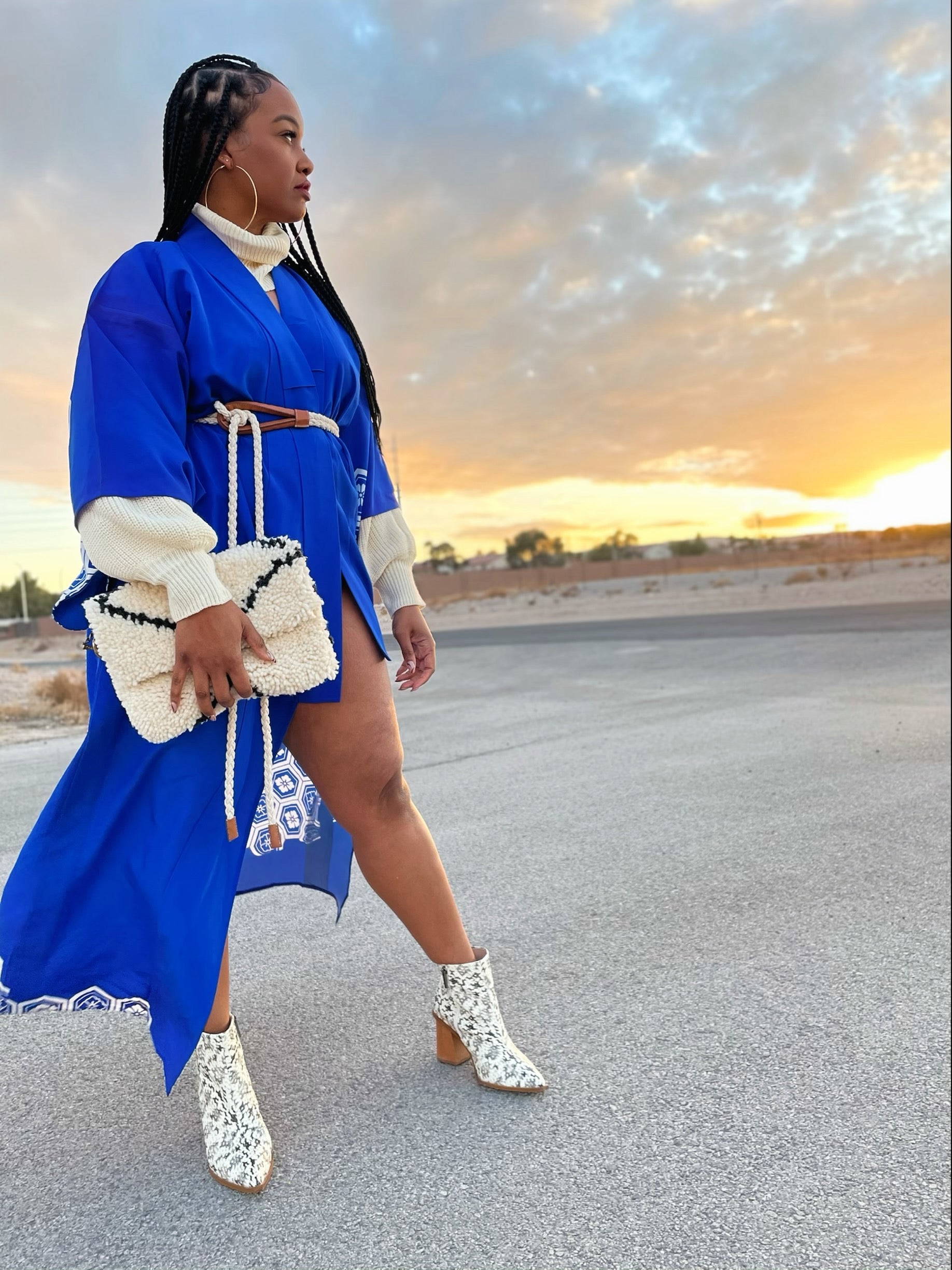 This kimono is so unique. The color combination is my absolute favorite. I think of so many lovely ways to wear this . She is silky but classy enough where you can wear her at night her as a jacket. This kimono is the perfect length and if you’re shorter than 5’6 you will need to get altered.