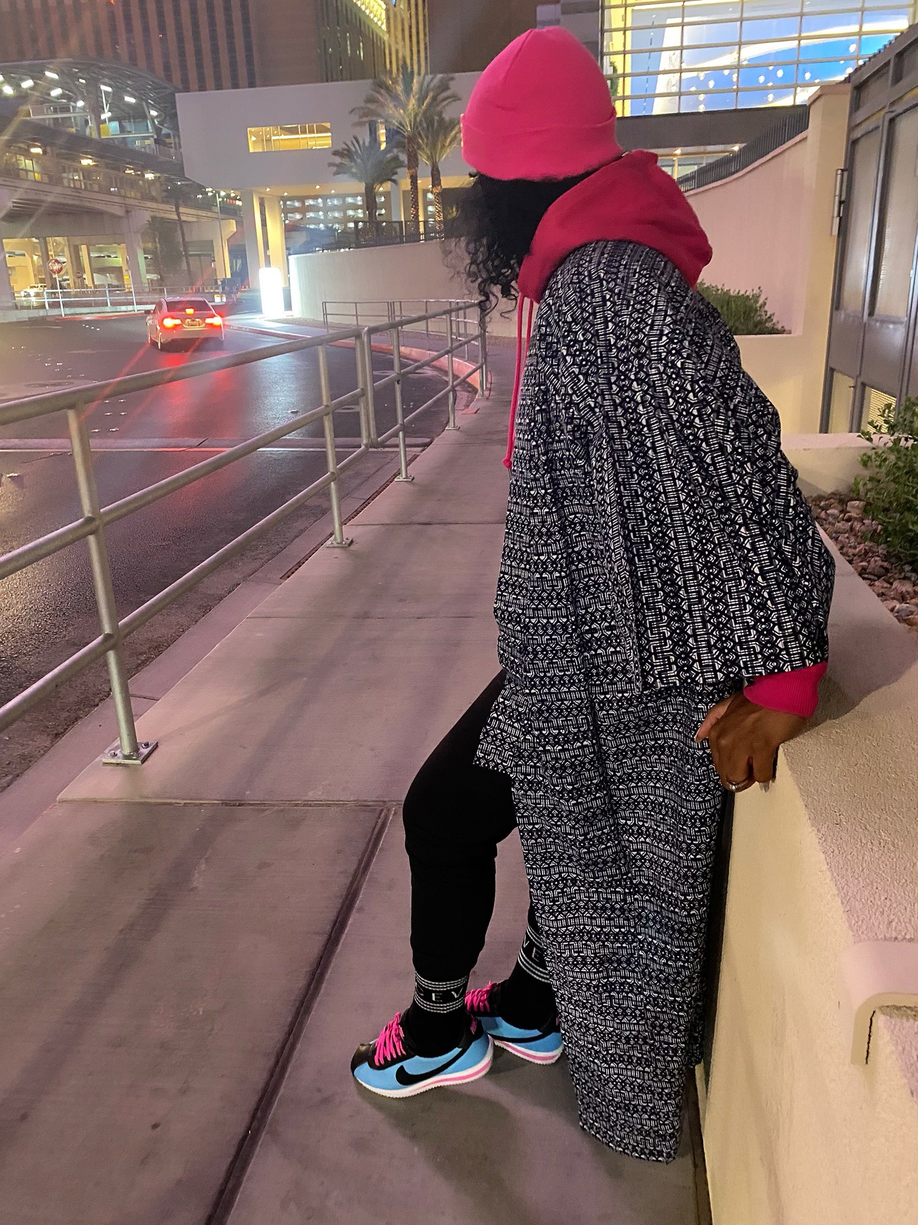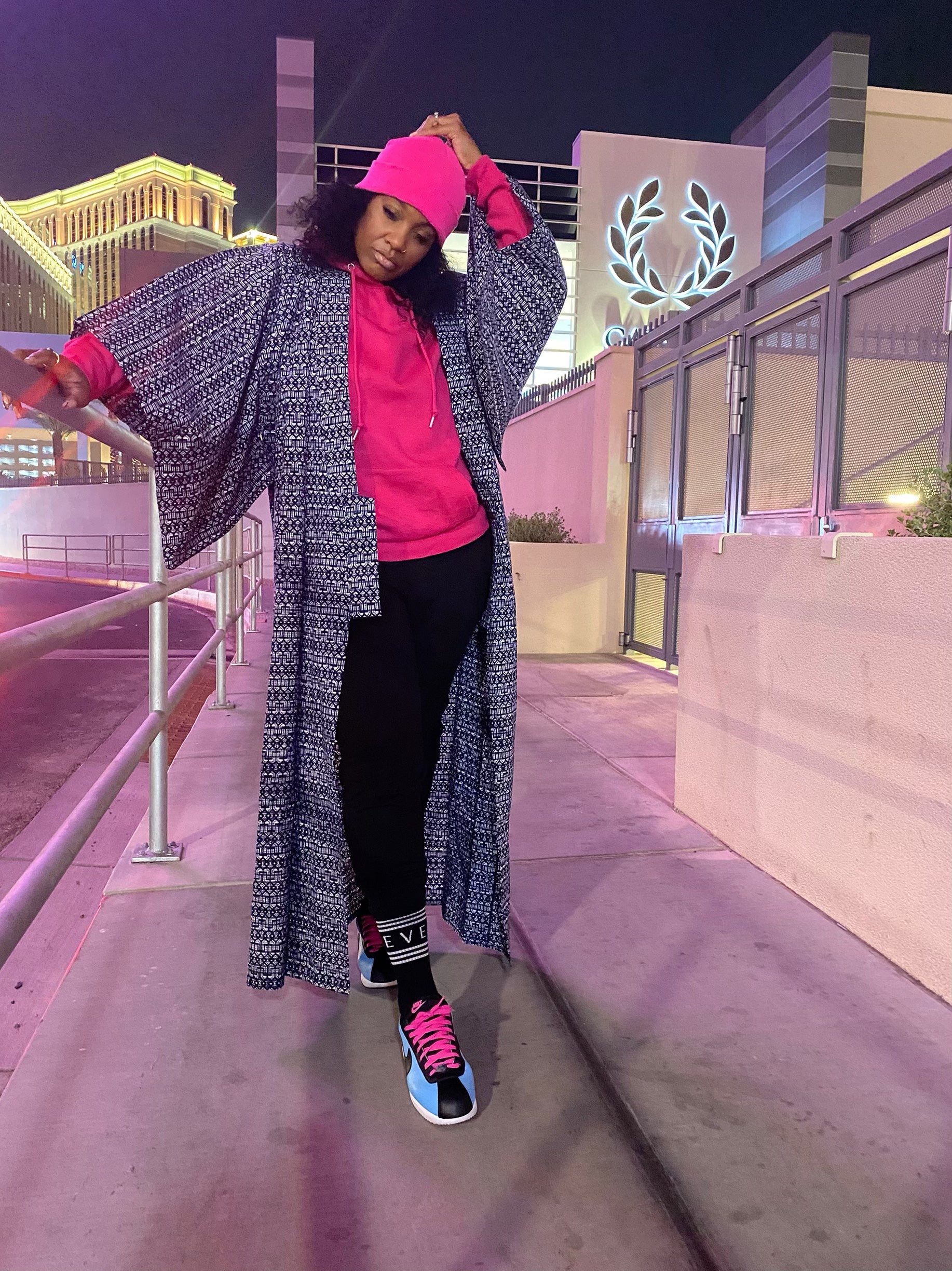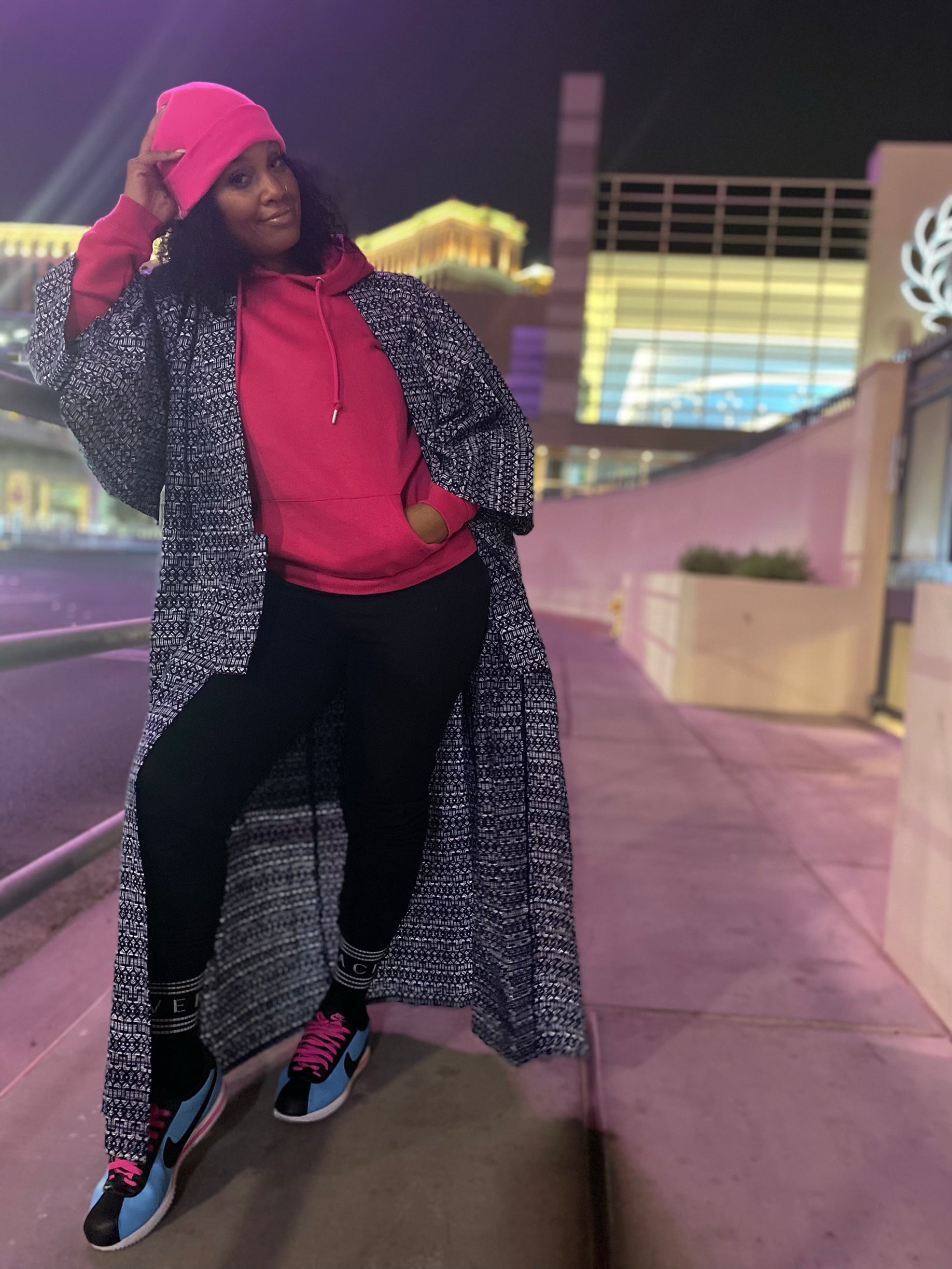 This beauty is a lightweight piece that could be worn from day tonight. This kimono looks black in pictures but she’s actually navy blue and white. I love to use these light kimono pieces over sweat suits just to add some Layering. She would also look amazing over a bathing suit. she is the perfect length if you are around 5’6 . If you are shorter you would need to get her altered.