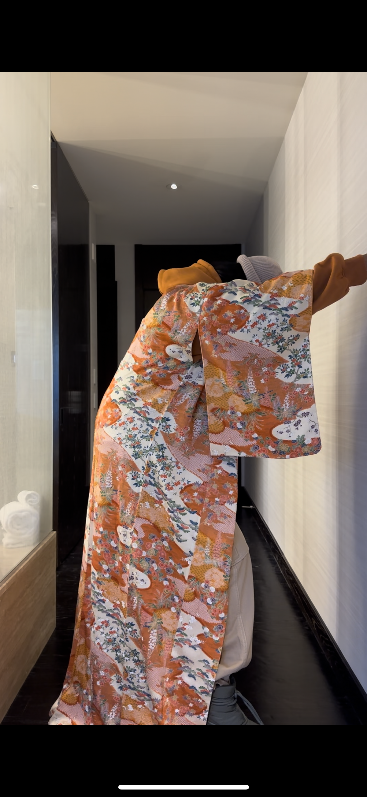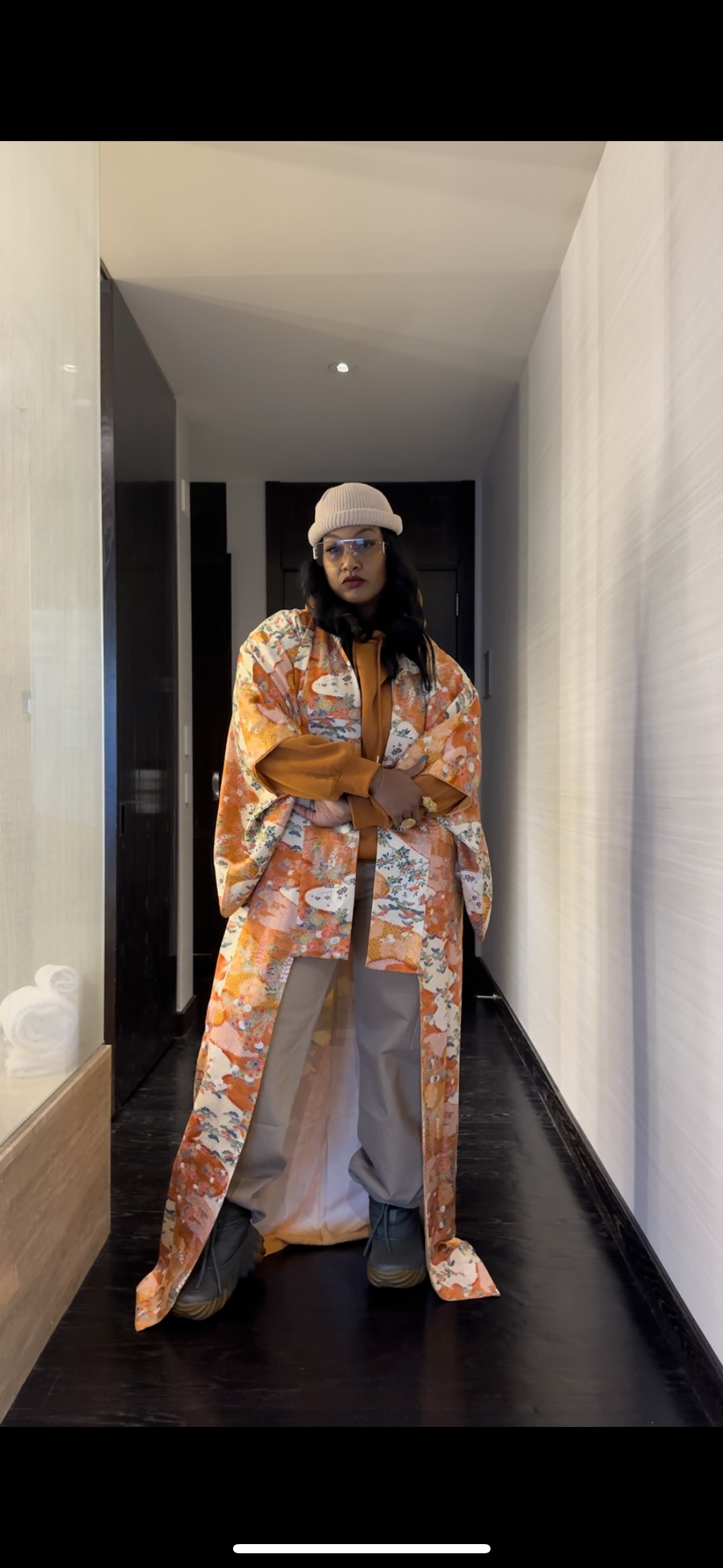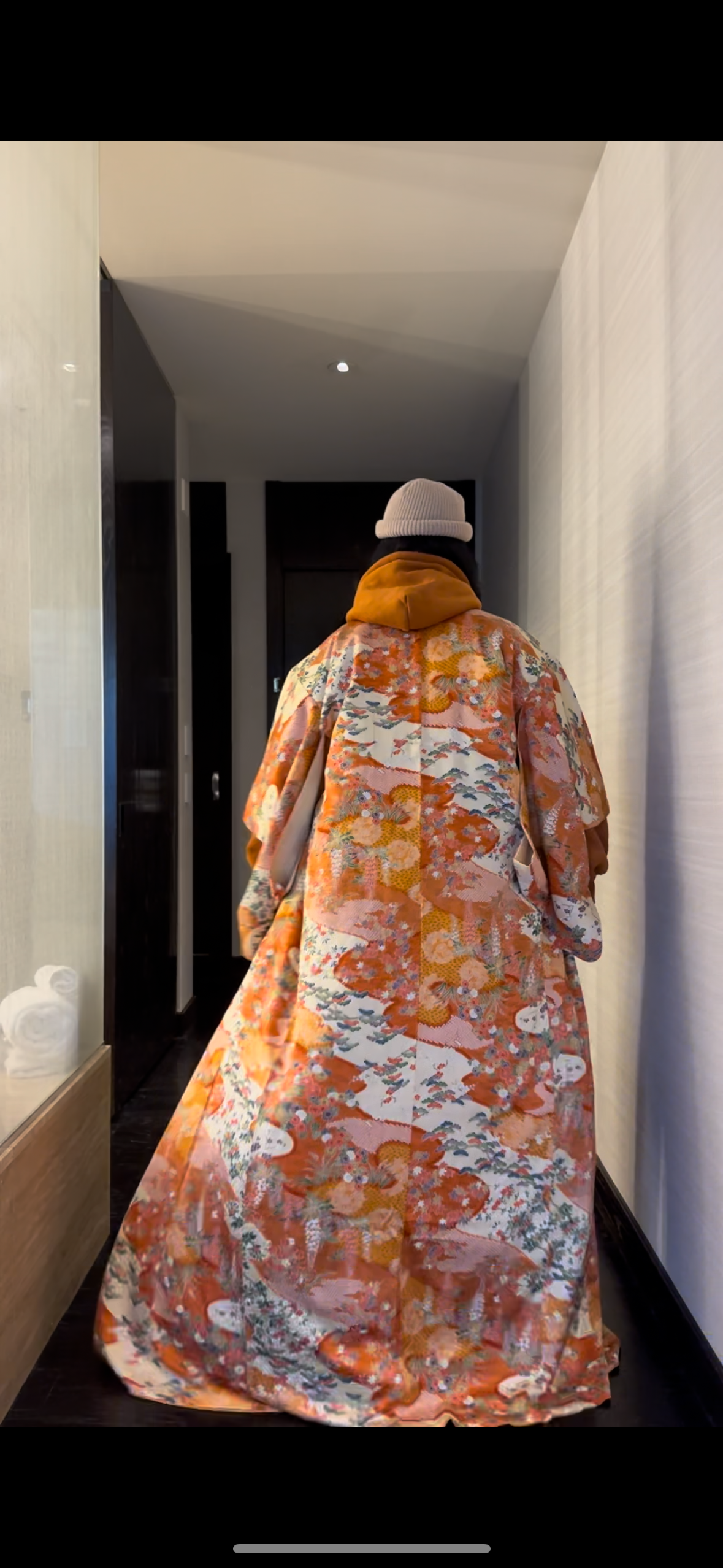 Vibrant crepe silk vintage Kimono with floral pattern. This beauty is a little on the heavy side and will be an addition to your winter wardrobe. I love to rock kimono in the winter with hoodies, turtlenecks, and sweat suits. This color looks amazing with Red, browns, and other neon tones.
