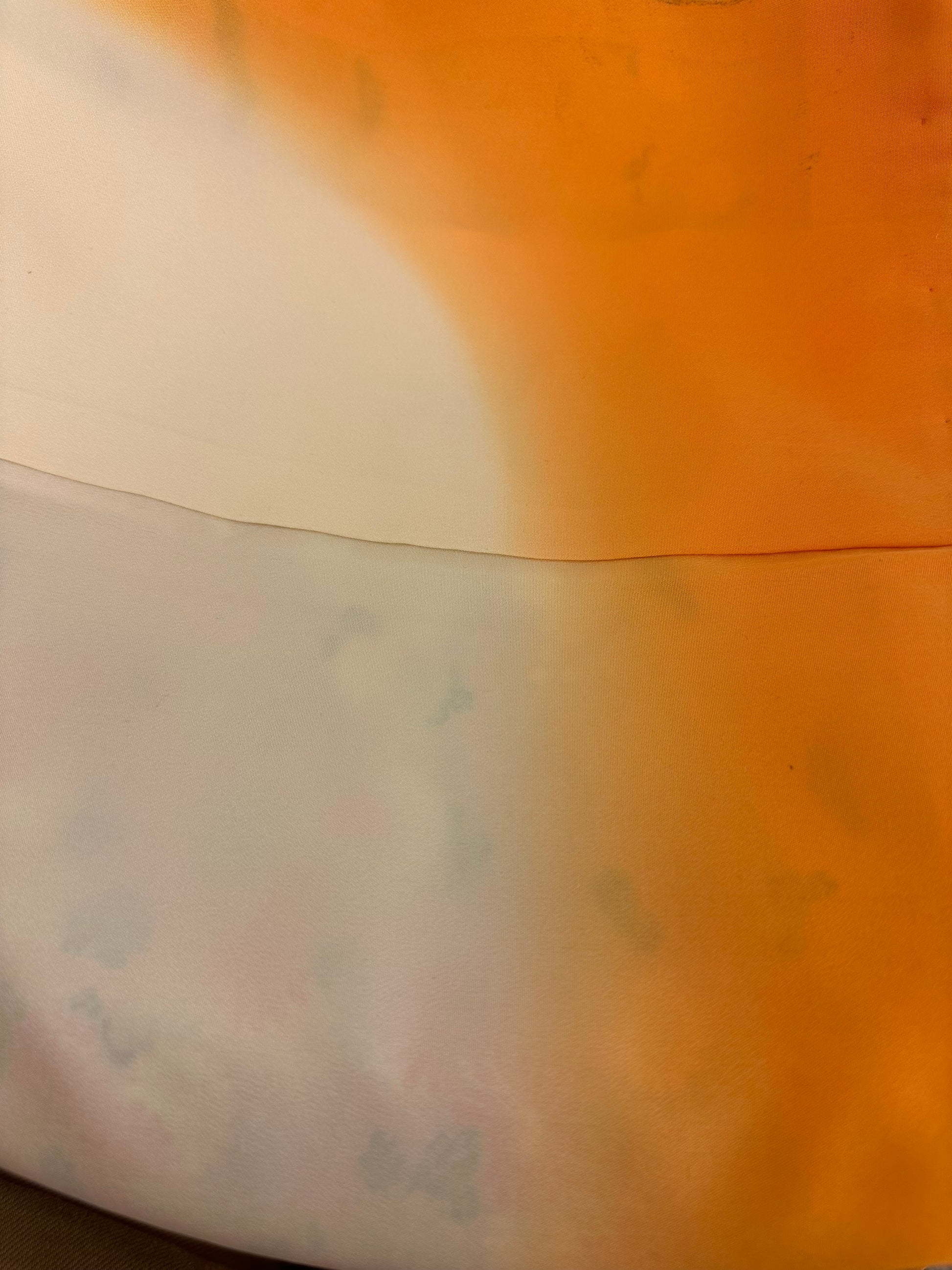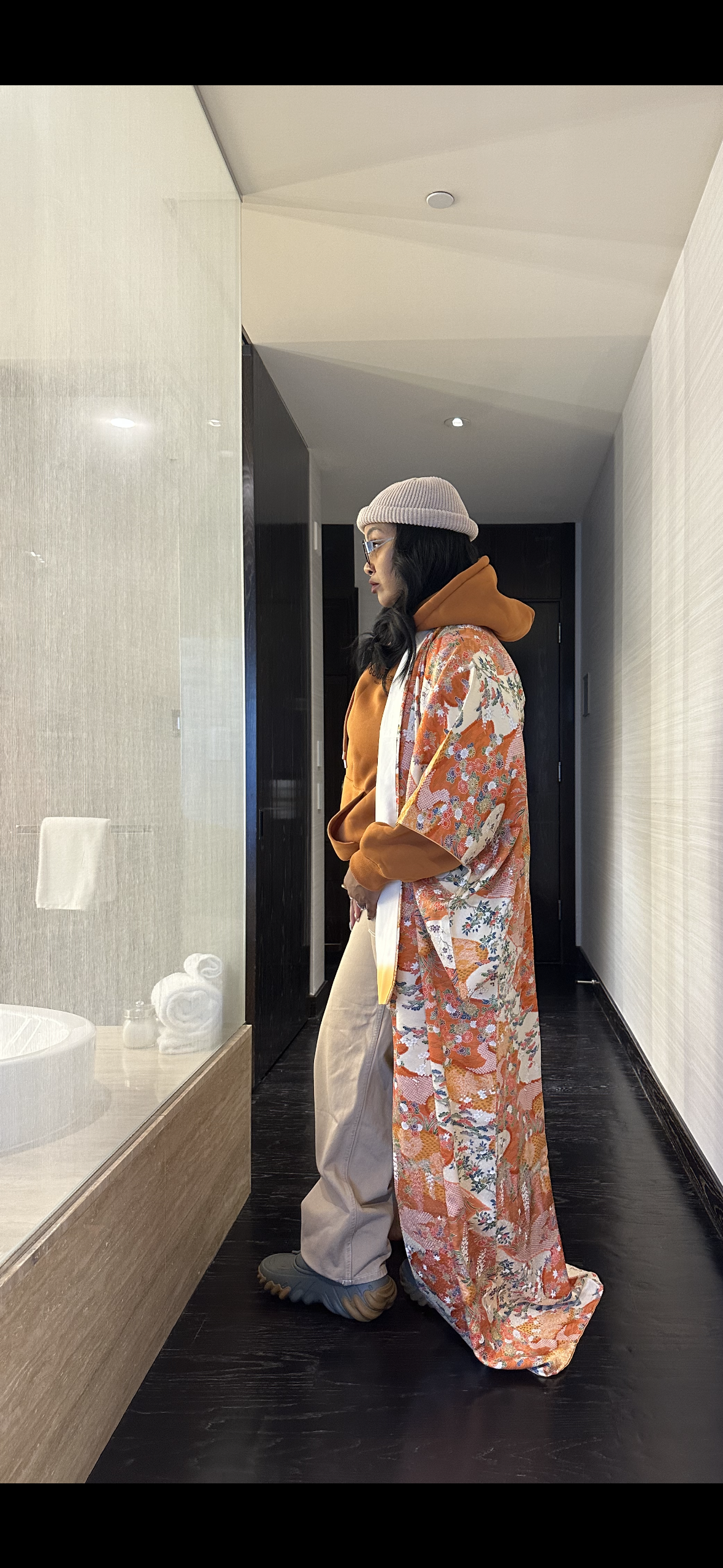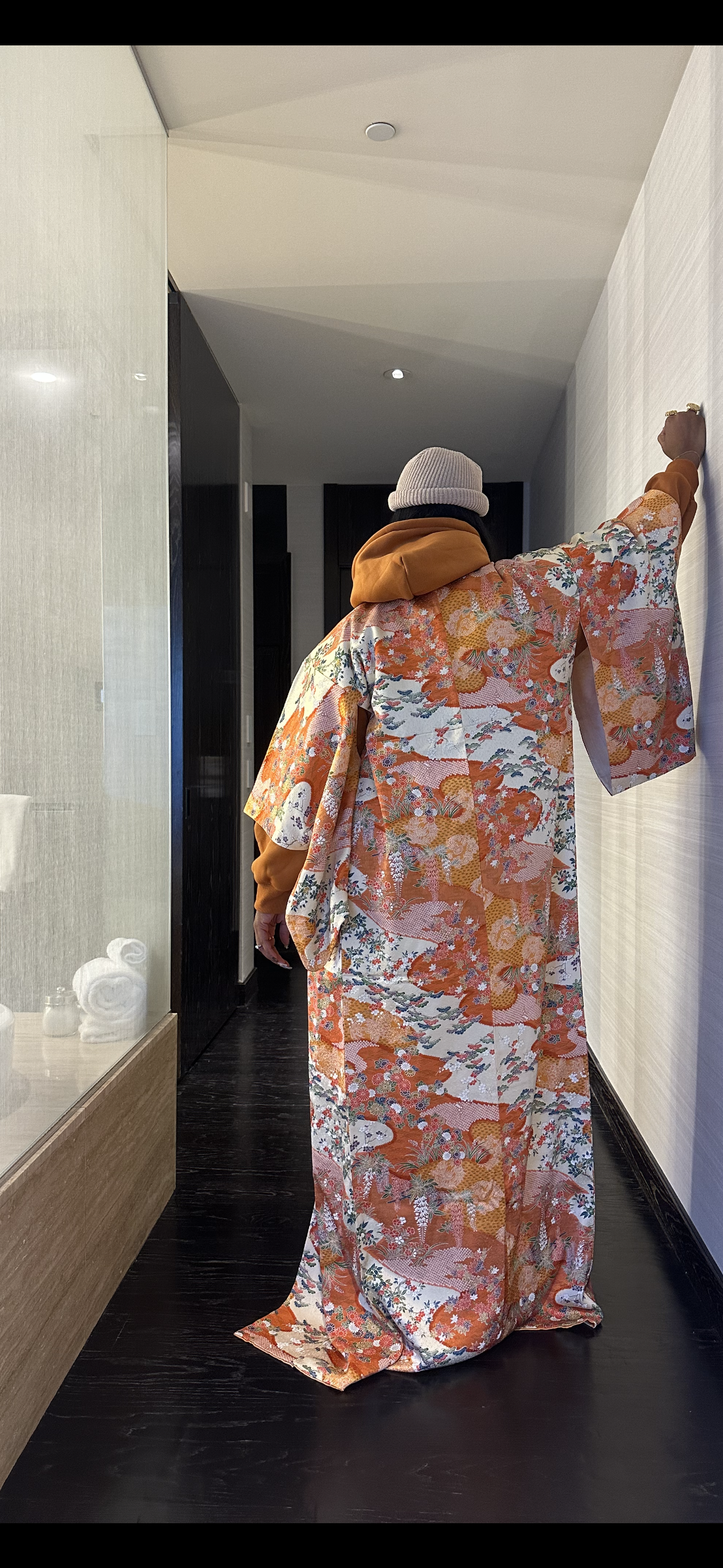 Vibrant crepe silk vintage Kimono with floral pattern. This beauty is a little on the heavy side and will be an addition to your winter wardrobe. I love to rock kimono in the winter with hoodies, turtlenecks, and sweat suits. This color looks amazing with Red, browns, and other neon tones.