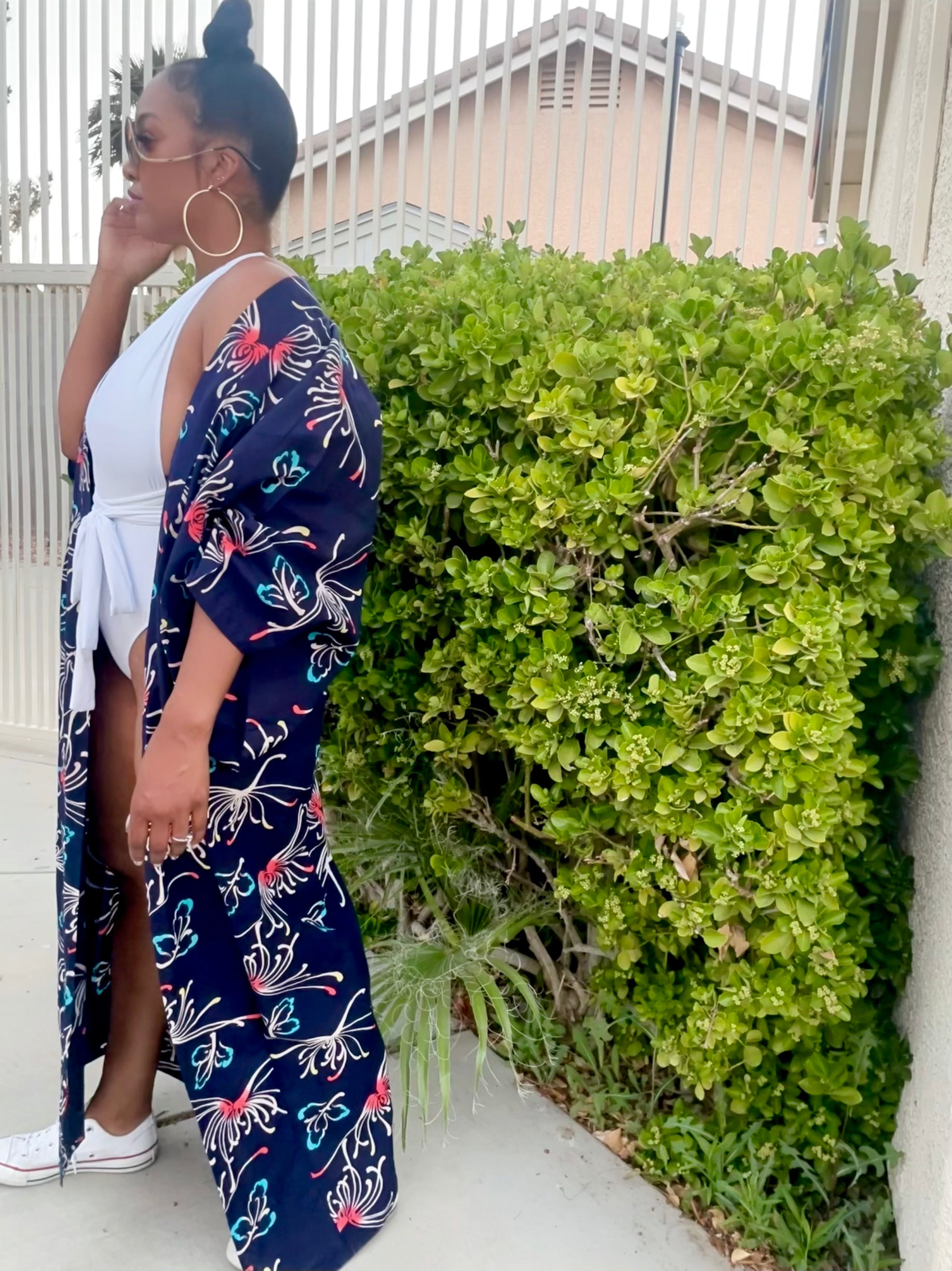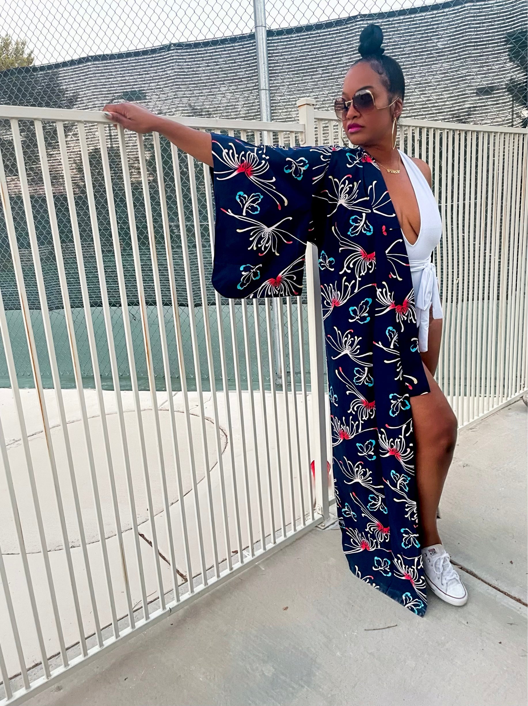 This pretty floral kimono is perfect for summer. and light weight fabric. Great as a cover up or lounging. Rock a kimono with sneakers and you’ll be comfortable all around.